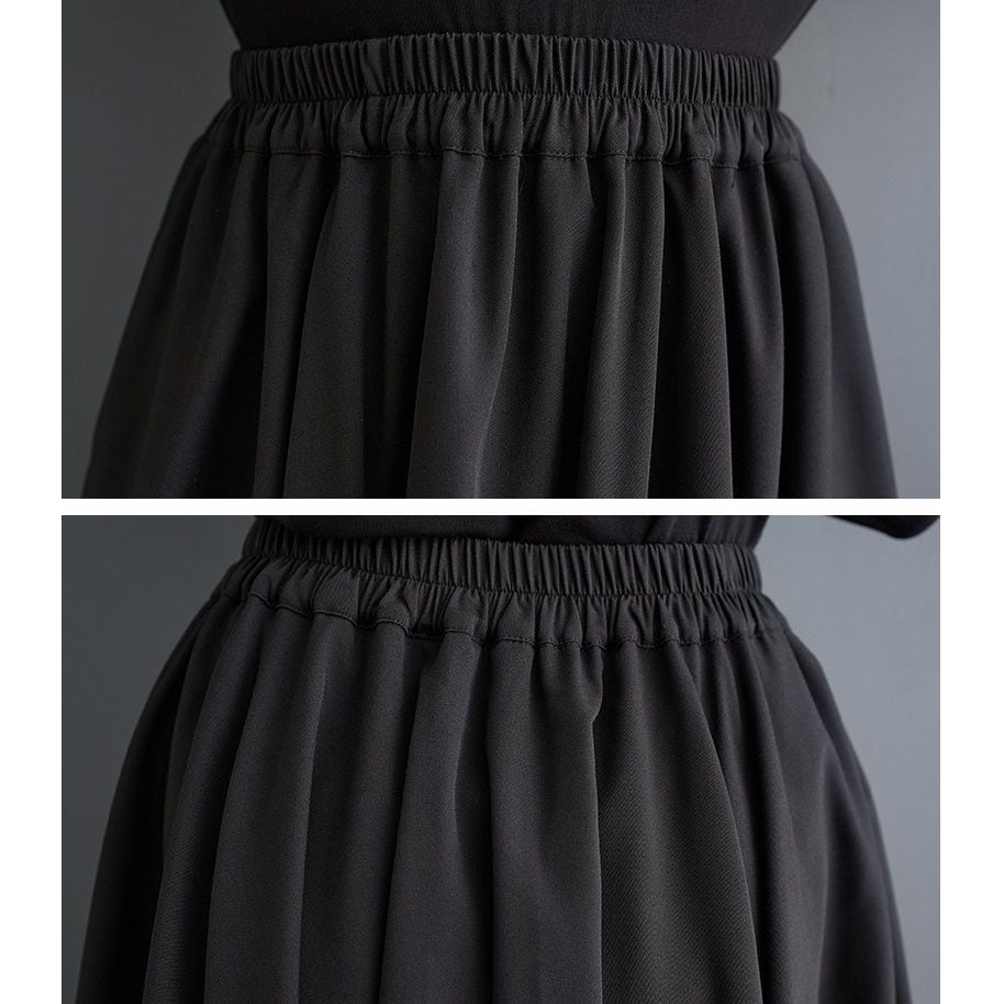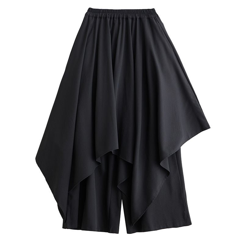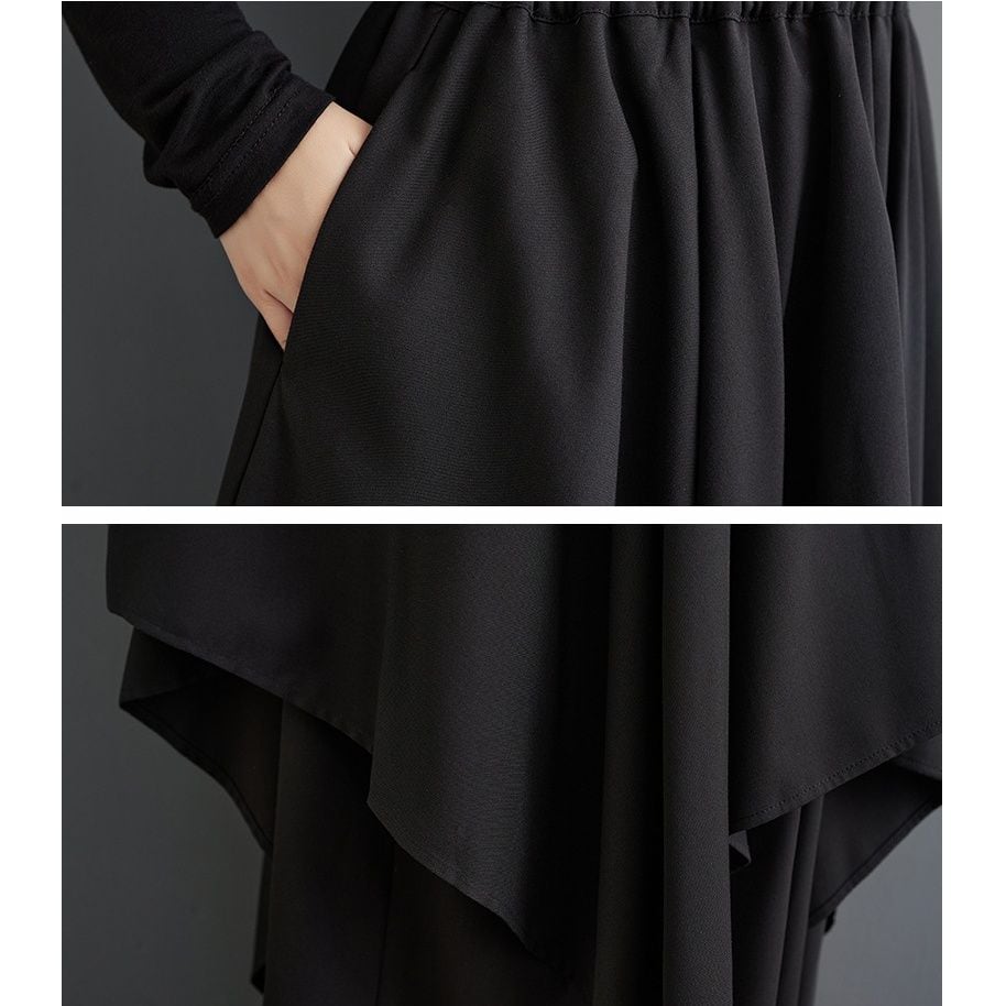 イレギュラーな裾のレイヤーフラップがお洒落な、ブラックのワイドレッグパンツです。ウエストはゴムなので、着脱が簡単で履き心地が良いです。ドレープやAラインのシルエットが美しい、単色でコーディネートしやすいアイテムです。