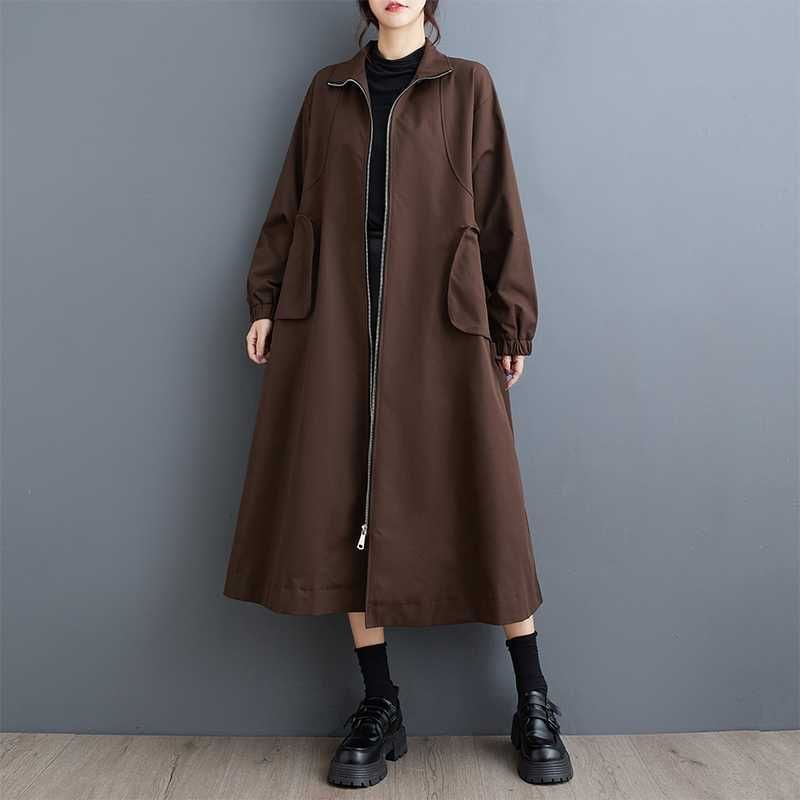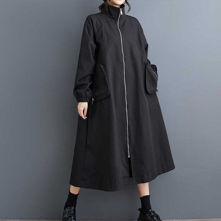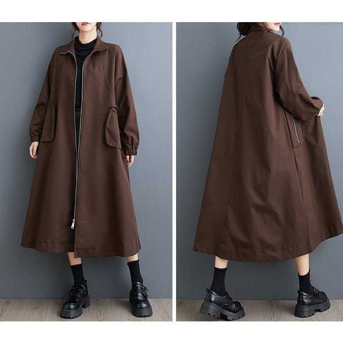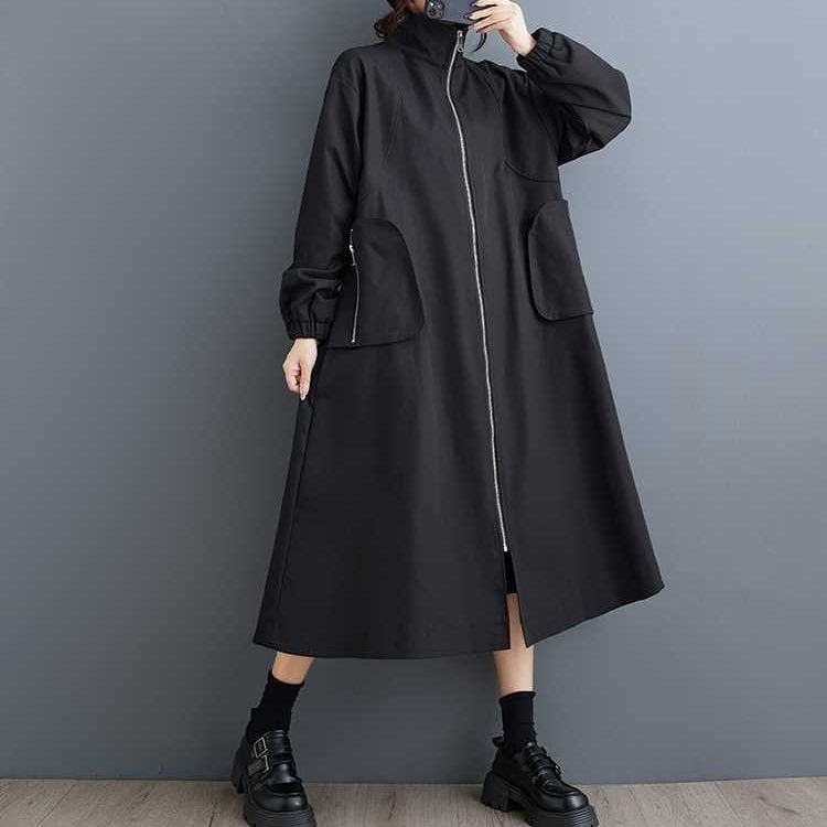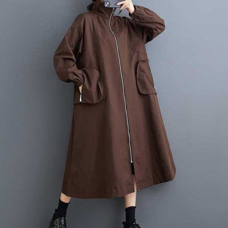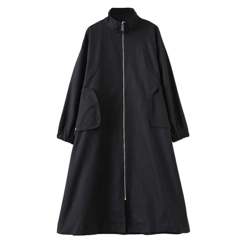 ジップの付いたパッチポケットがキュートな、スタンドカラー・長袖・膝下丈のフルジップコートです。ワンピースのようなAラインのシルエットが魅力的な、単色で合わせやすいカジュアルアイテムです。ブラックとブラウンの2色から選べます。