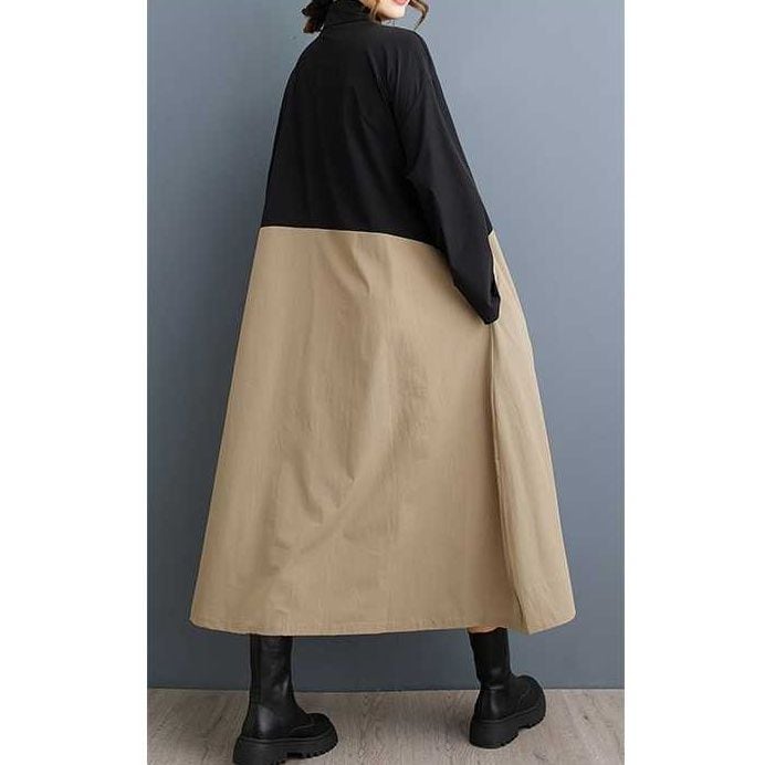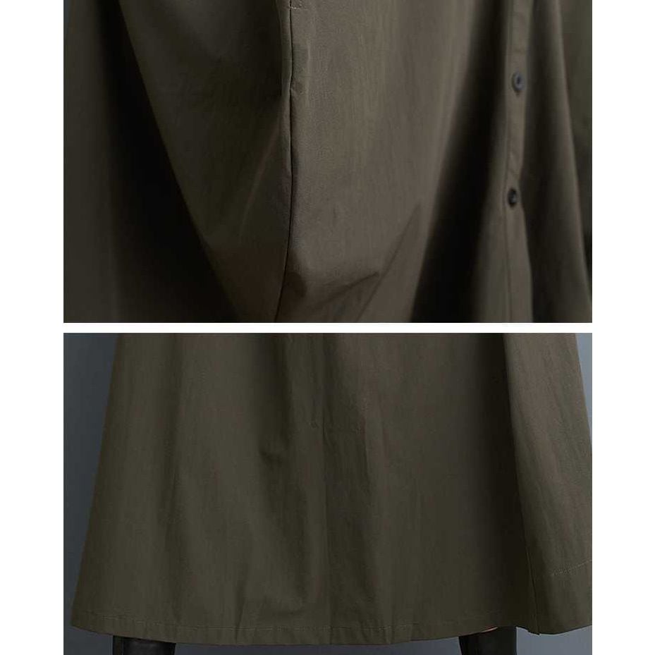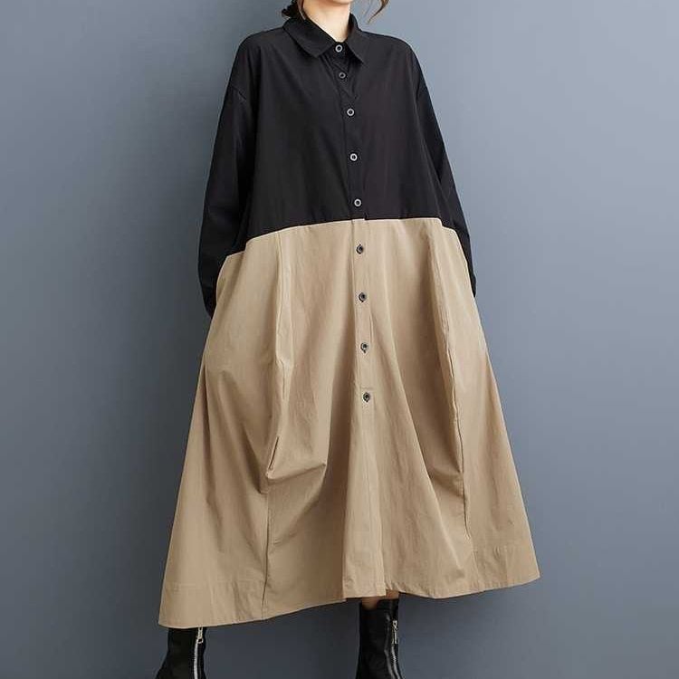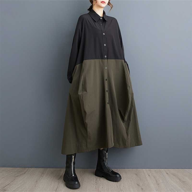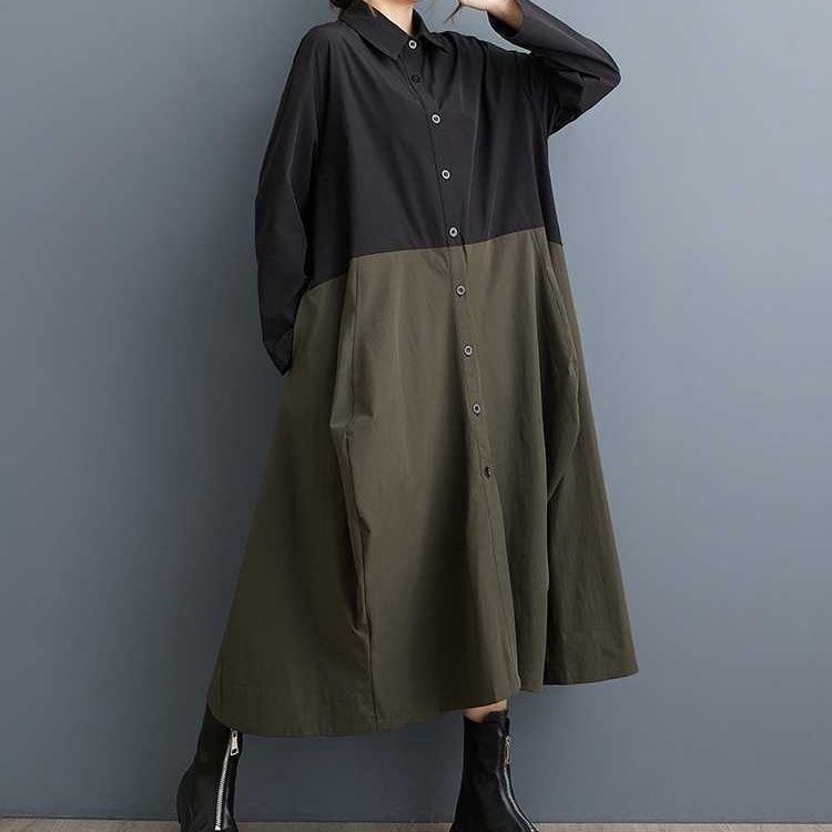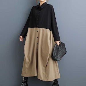 上下のコントラストスティッチデザインがお洒落な、ポロ襟・長袖・ロング丈のシャツワンピースです。ランタンのようなふくらみのあるフロントや、ゆったりとしたAラインのシルエットが魅力的なカジュアルアイテムです。カーキとアーミーグリーンの2色から選べます。