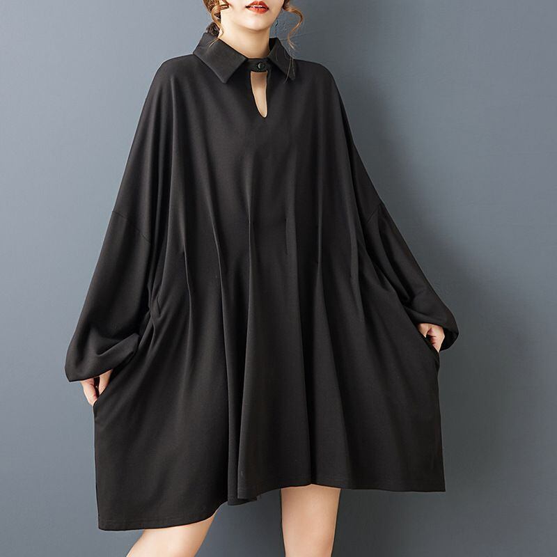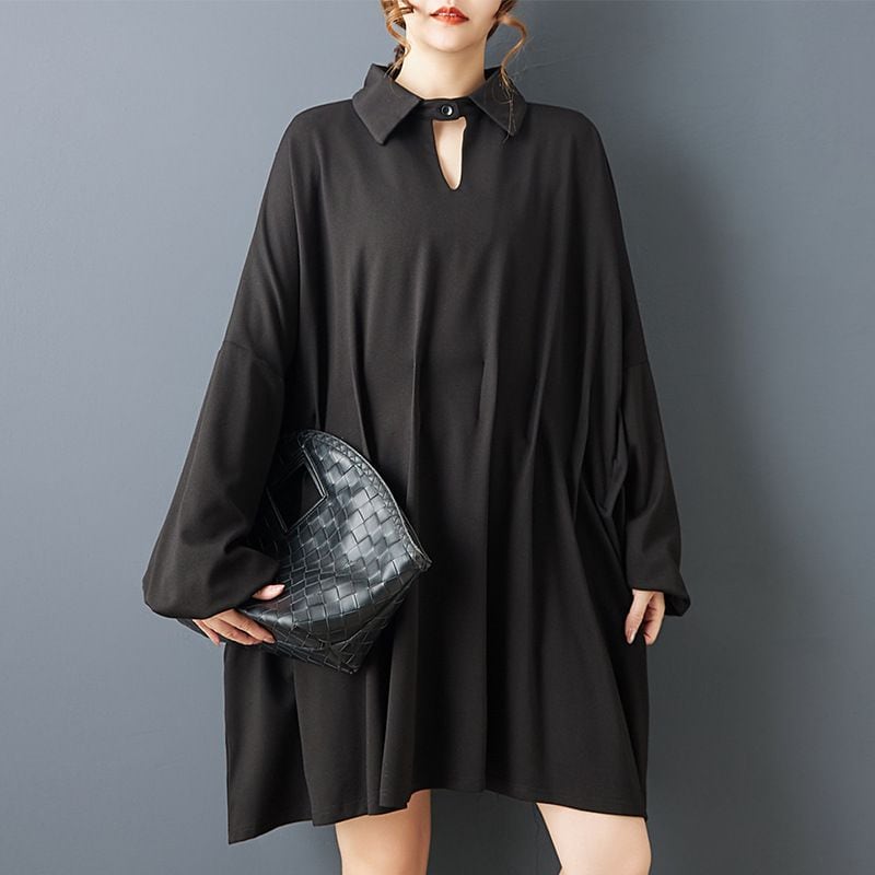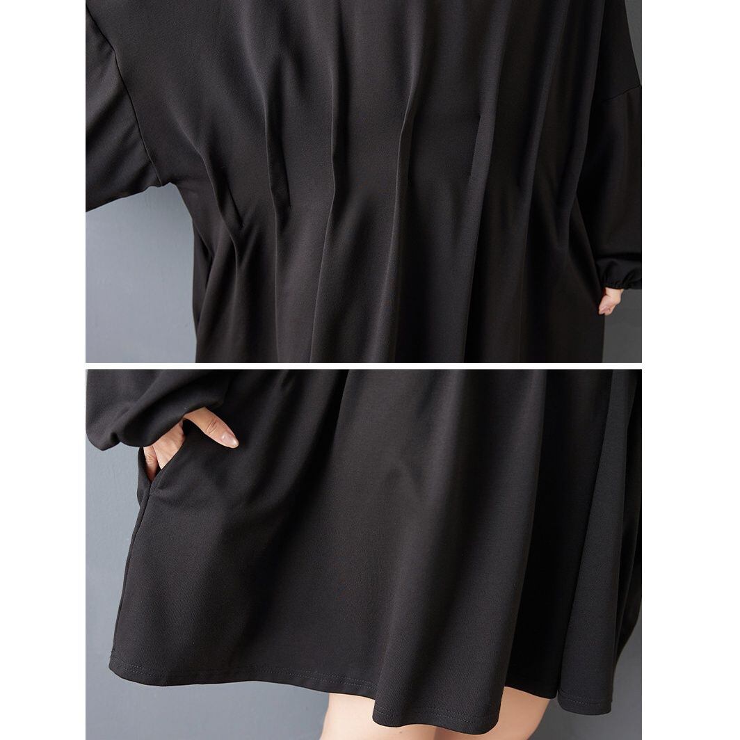 チョーカーのようなネックのデザインやウエストの特徴的なプリーツがお洒落な、ブラックのポロ襟・長袖・ミニ丈のシャツワンピースです。バットスリーブのワイド幅でスモックのようなシルエットが魅力的な、チュニックとしても使えるアイテムです。