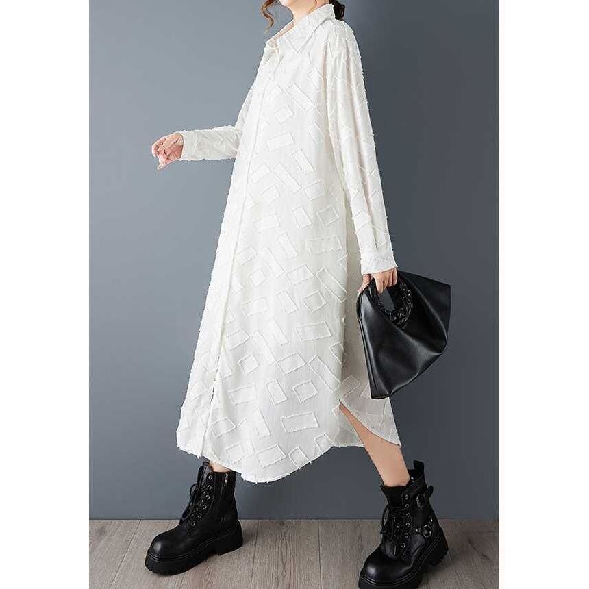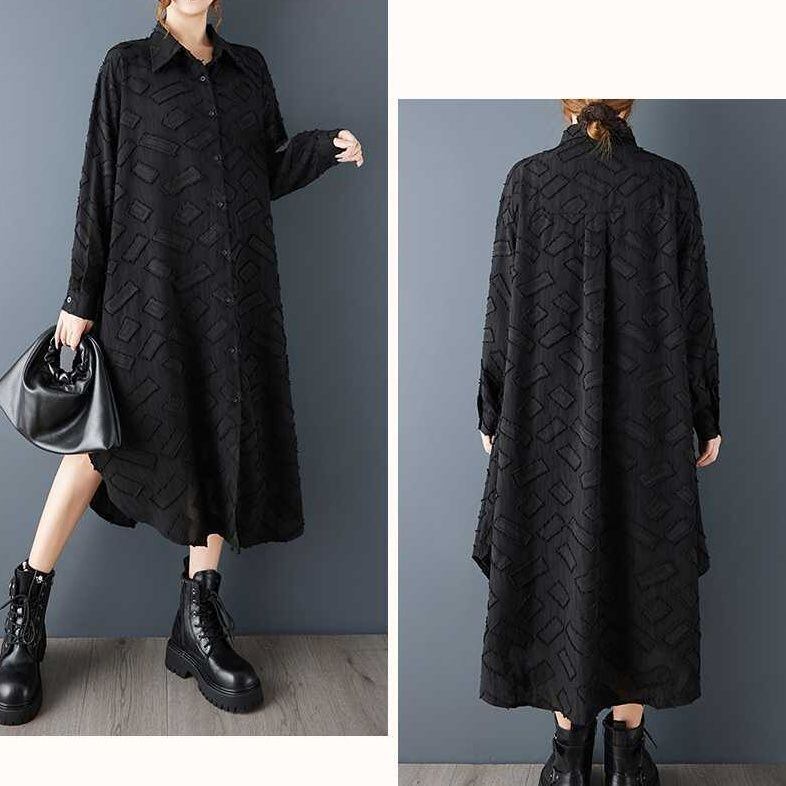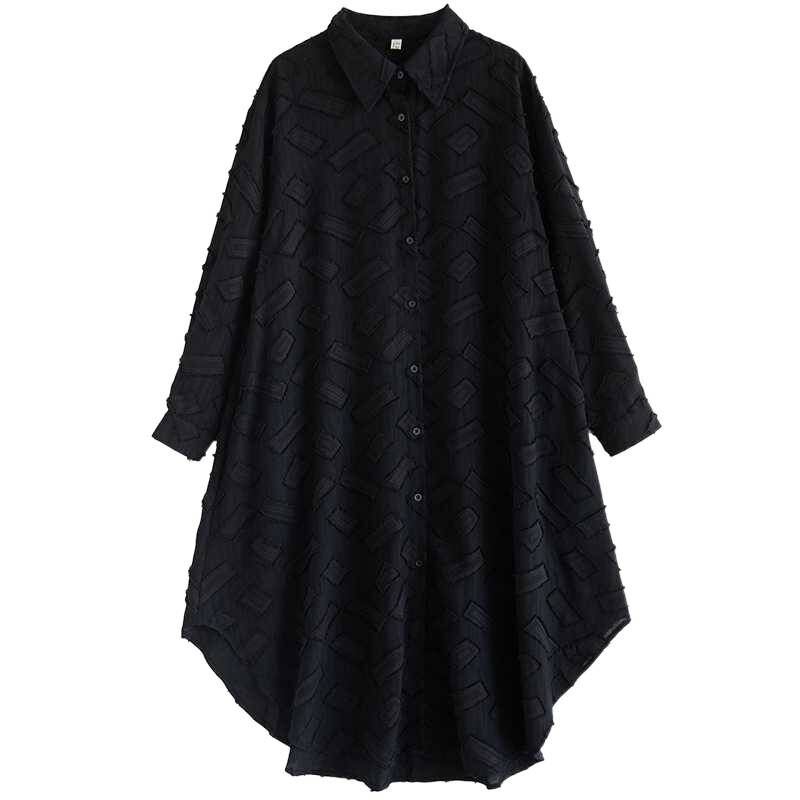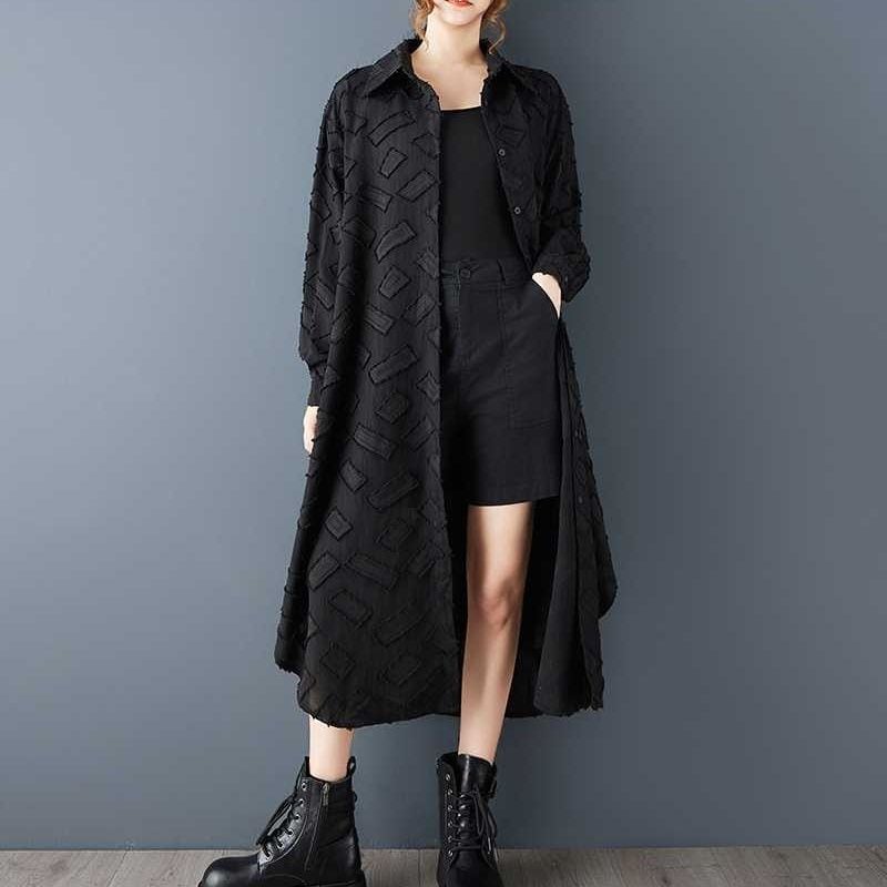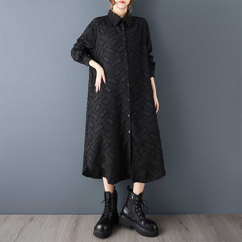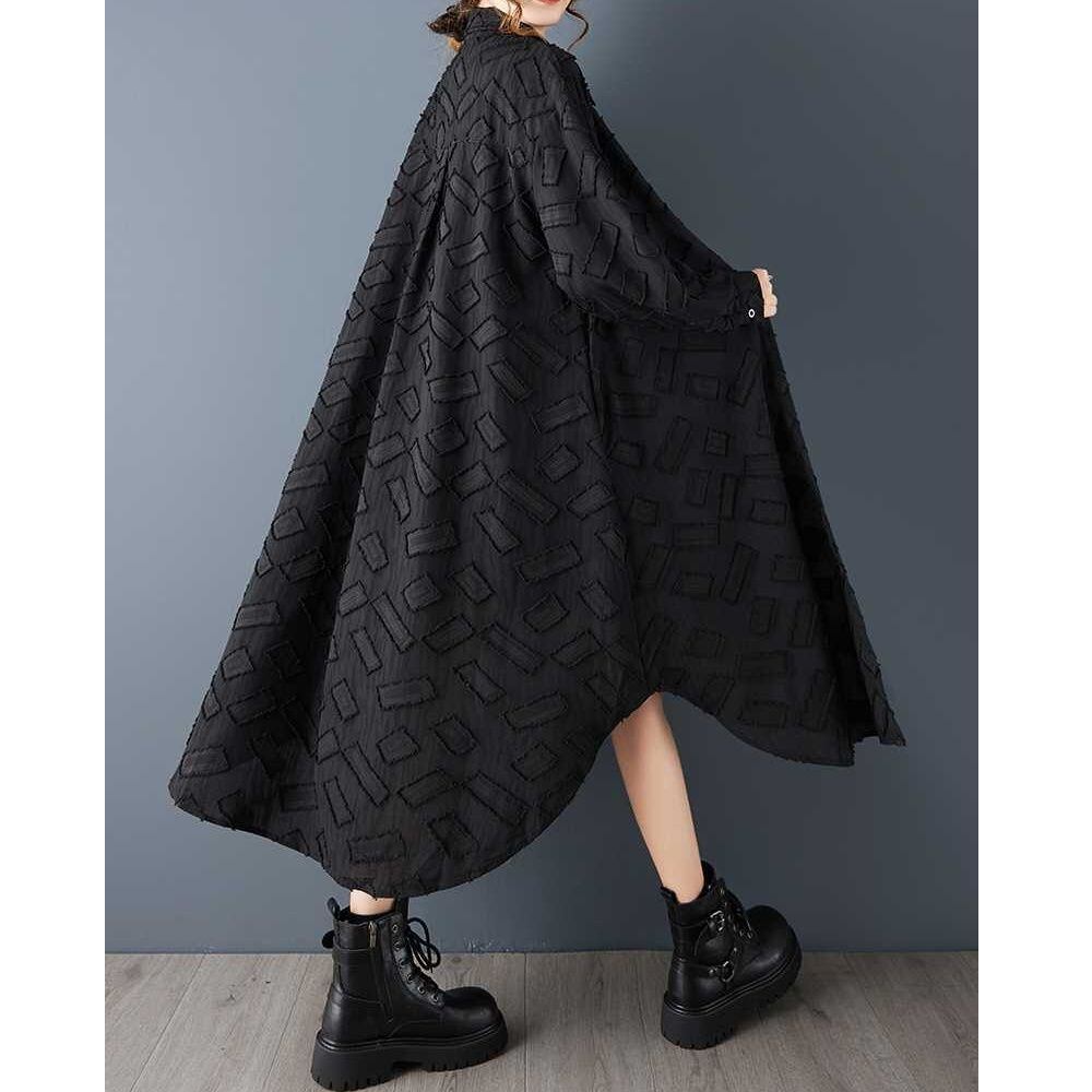 単色の立体的な幾何学模様がお洒落な、ポロ襟・長袖・ミドル丈のシャツワンピースです。ラウンドカットの裾はサイドが短く、スリットのようです。ゆったりとしたAラインで、羽織りものとしても使えるアイテムです。ブラックとホワイトの2色から選べます。