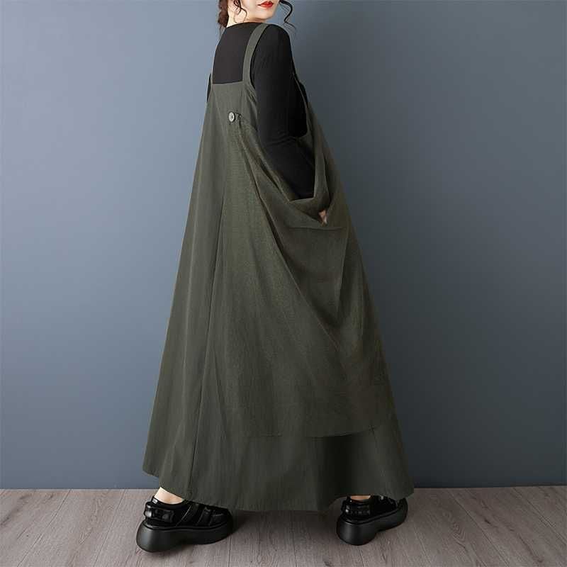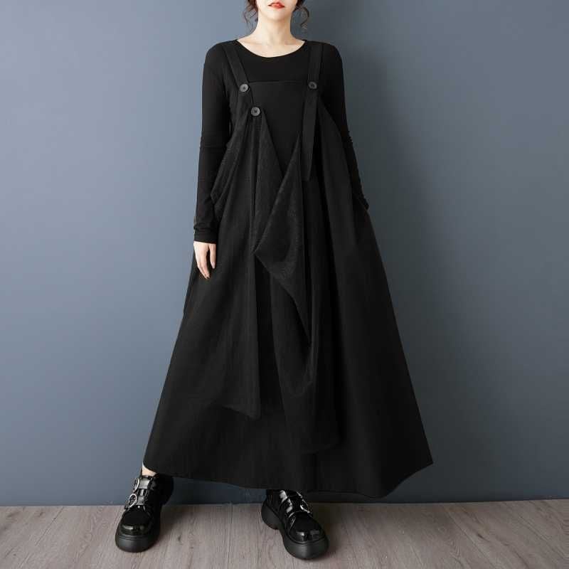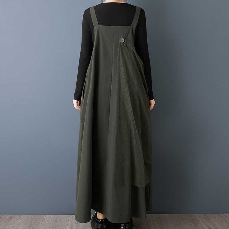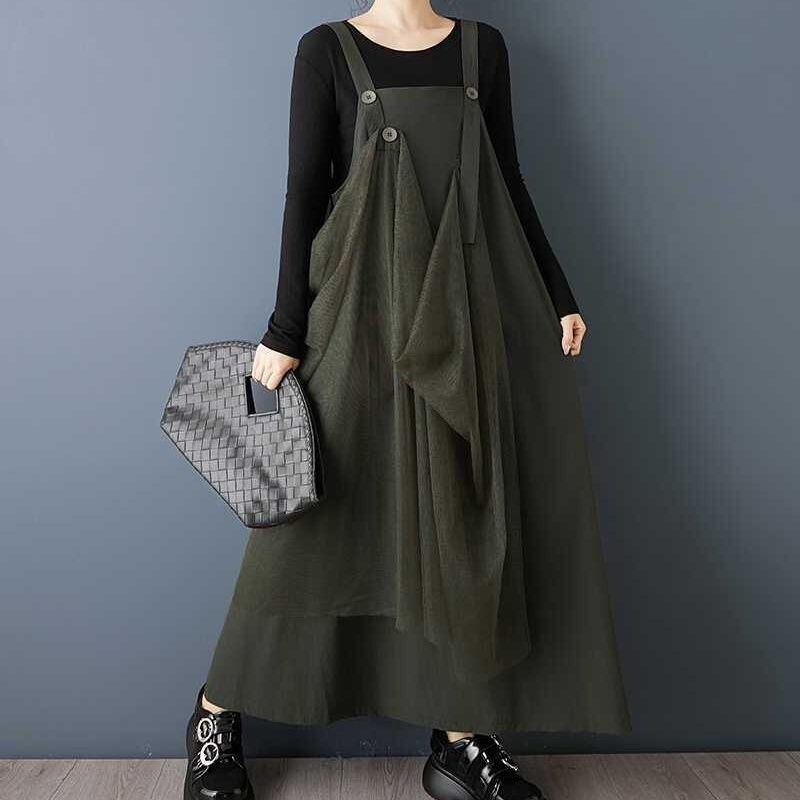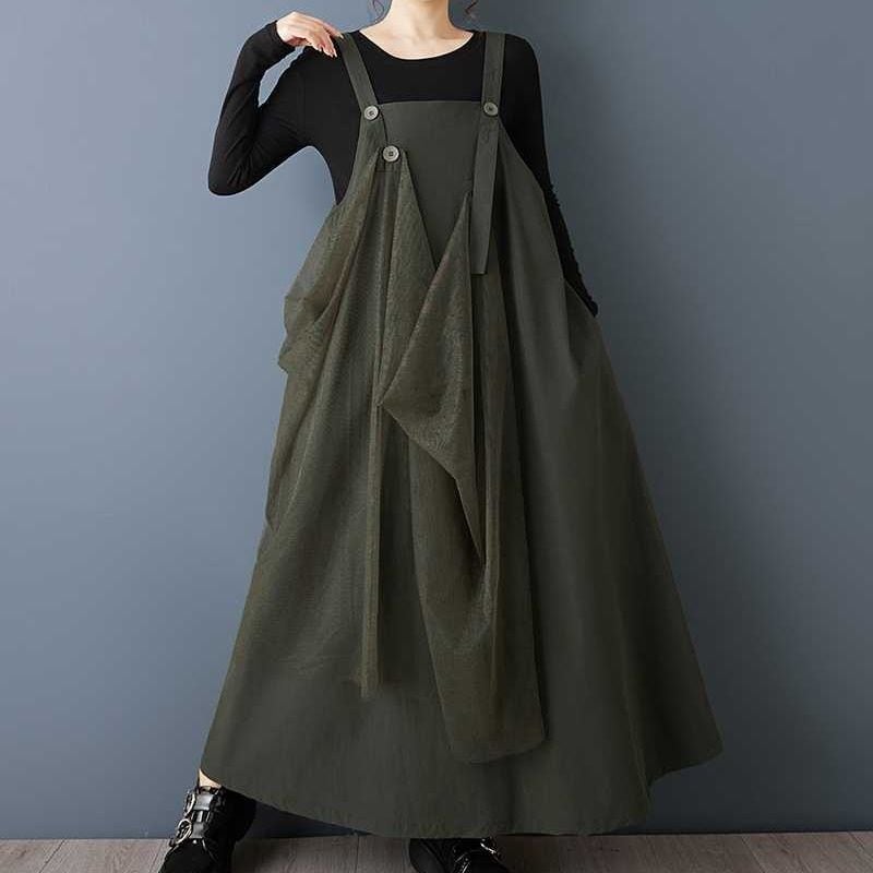 メッシュ素材のレイヤーフラップが作り出すシルエットが魅力的な、Aライン・ロング丈のストラップ・ジャンパースカートです。ショルダーストラップはボタンで長さを調節できます。単色のゆったりとしたシルエットで、小物や差し色アレンジの利くカジュアルアイテムです。ブラックとアーミーグリーンの2色から選べます。