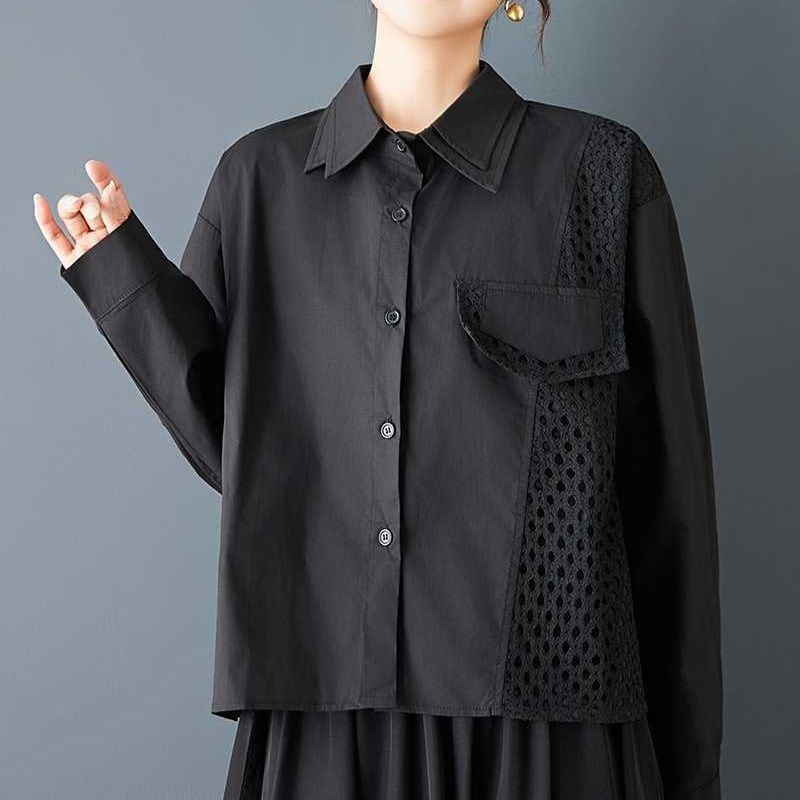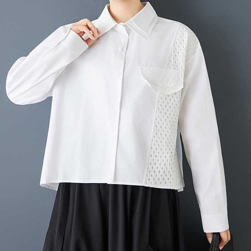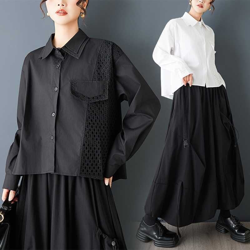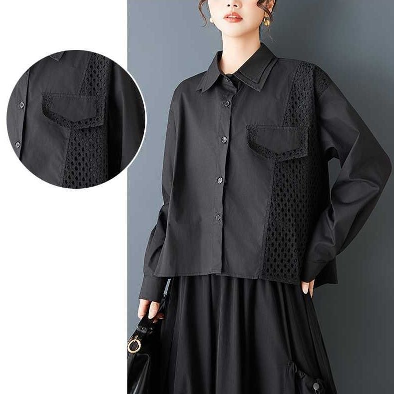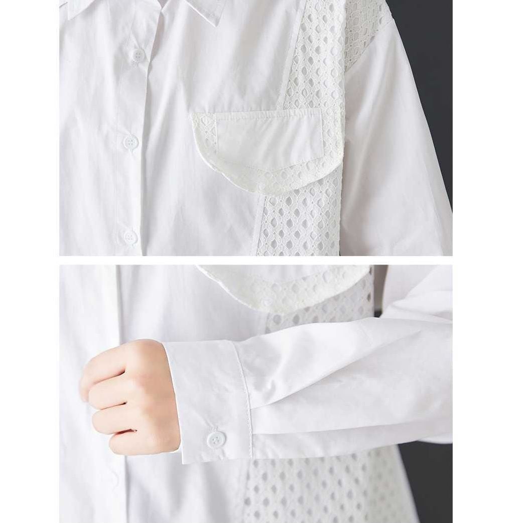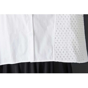 メッシュのスティッチやフラップ飾りがキュートな、ダブルカラー・長袖・ストレートカットのデザインシャツです。単色で何にでも合わせやすい、モードな印象のアイテムです。色はブラックとホワイトの2色から選べます。
