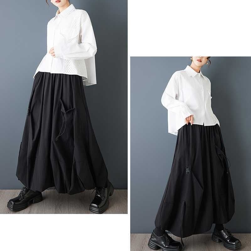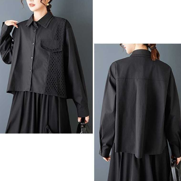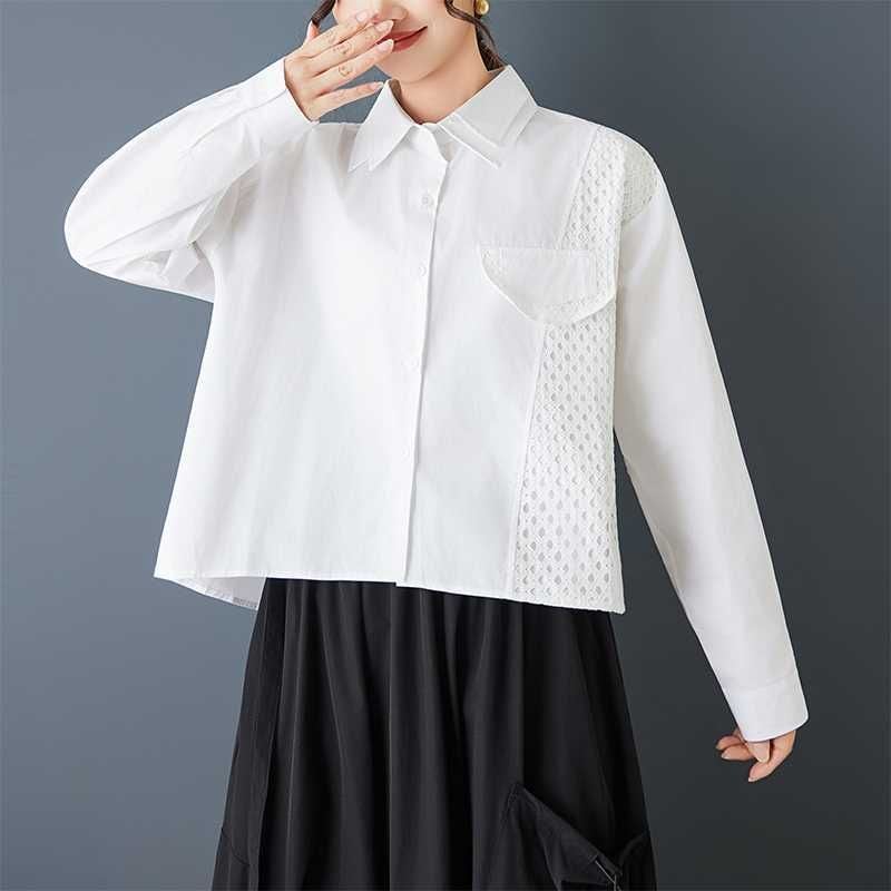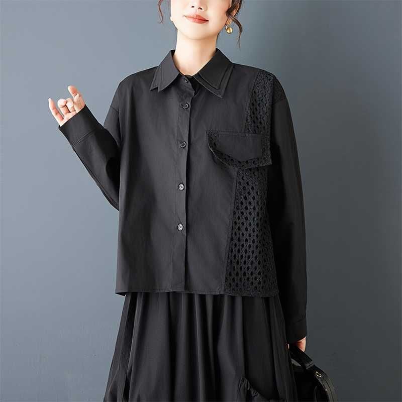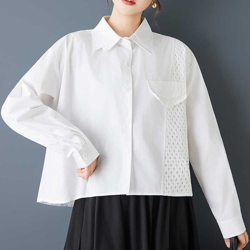 メッシュのスティッチやフラップ飾りがキュートな、ダブルカラー・長袖・ストレートカットのデザインシャツです。単色で何にでも合わせやすい、モードな印象のアイテムです。色はブラックとホワイトの2色から選べます。