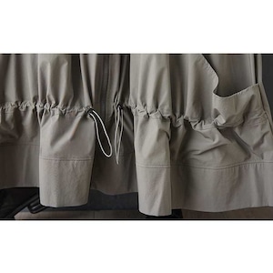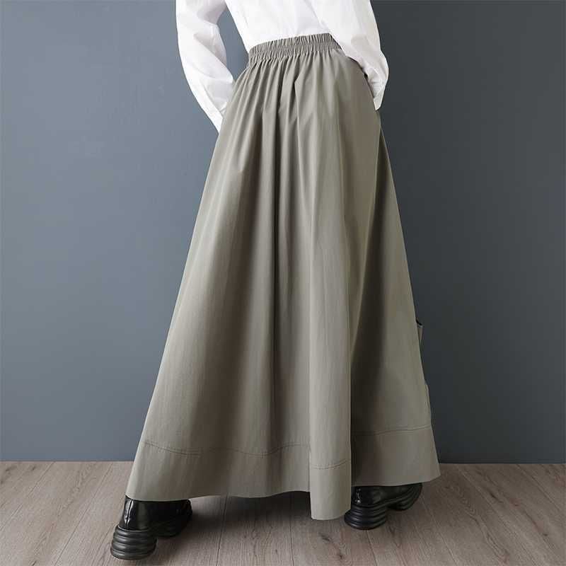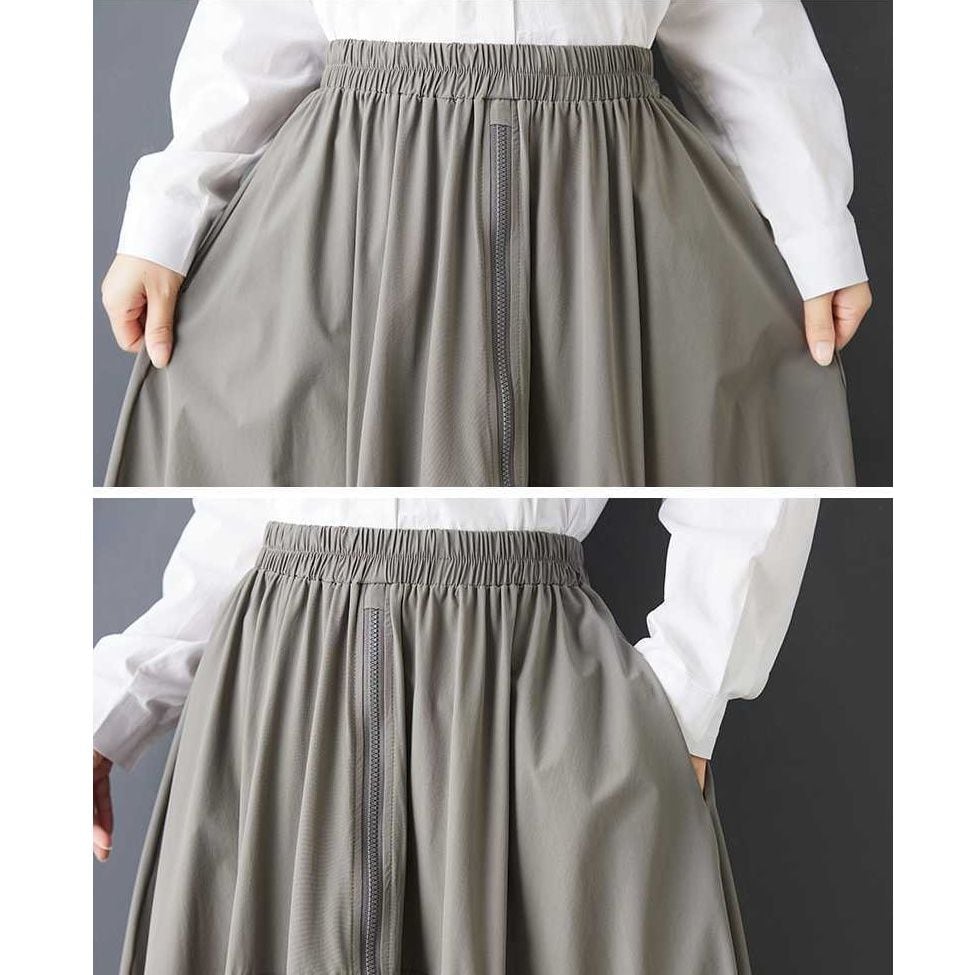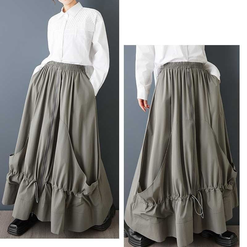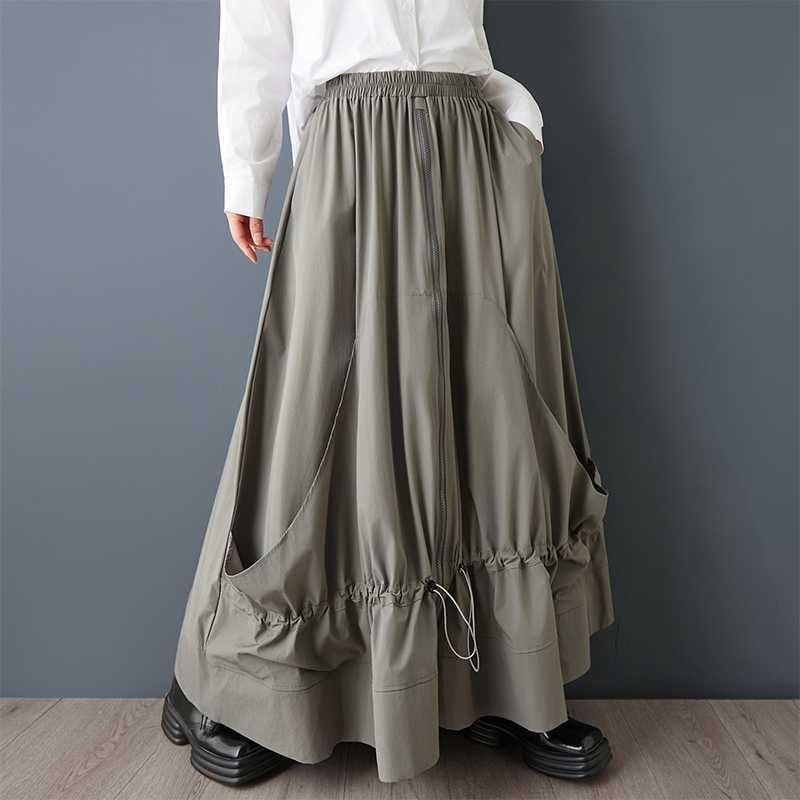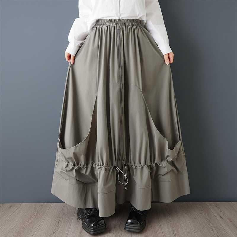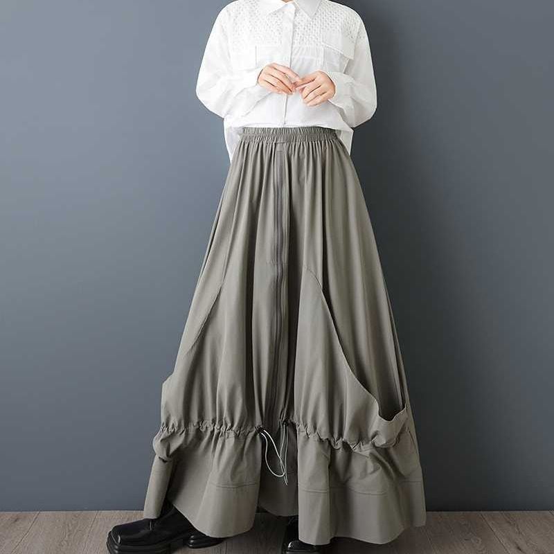 ジップ・レイヤー・ドローコードを使ったユニークなデザインが目を惹く、Aライン・マキシ丈のデザインスカートです。ウエストはゴムなので、着脱が簡単で履き心地が良いです。グレーの単色でコーディネートしやすい、シルエットが魅力的なカジュアルアイテムです。