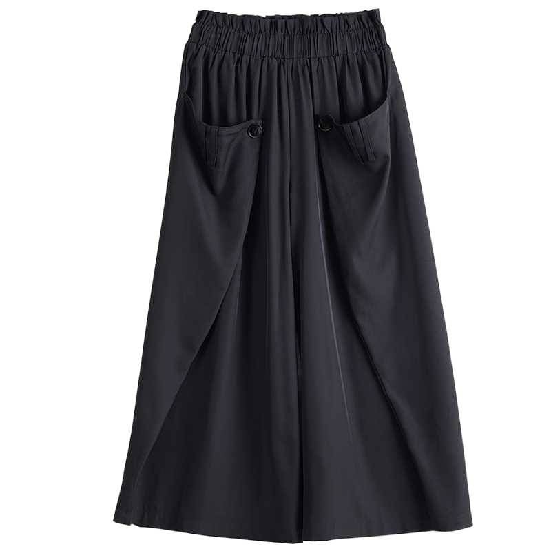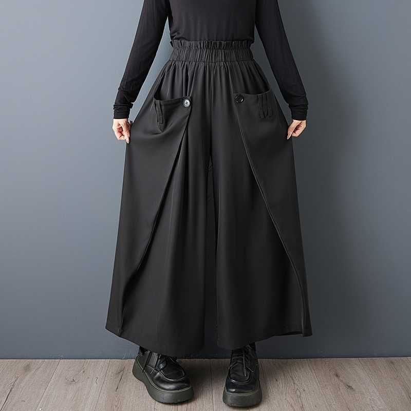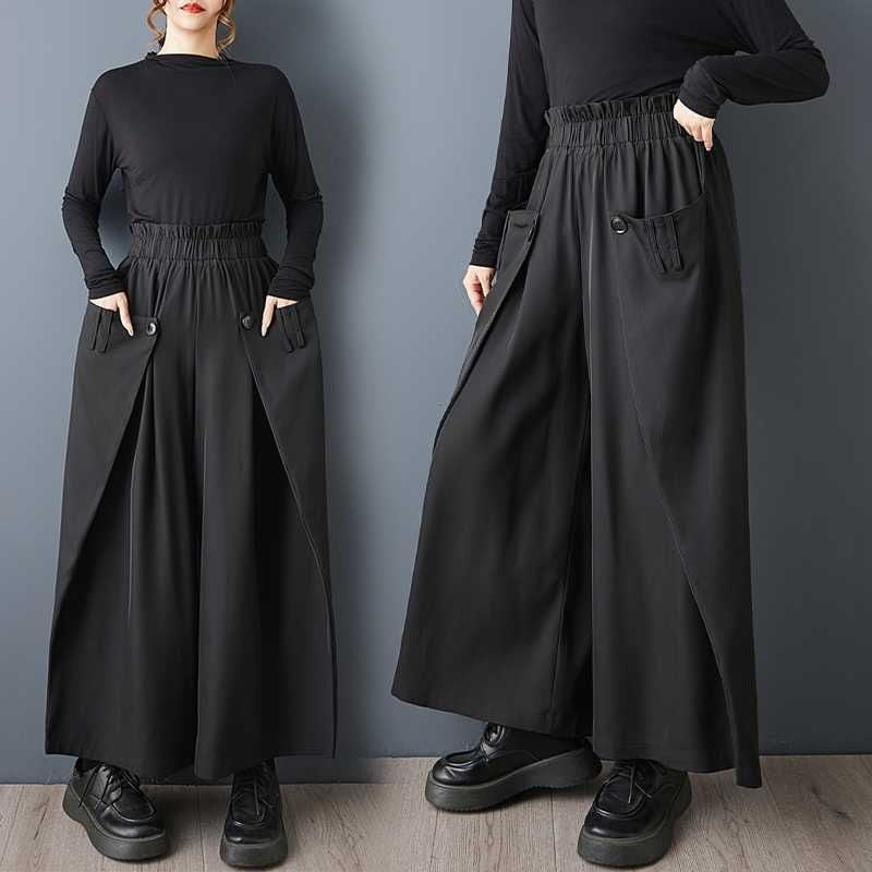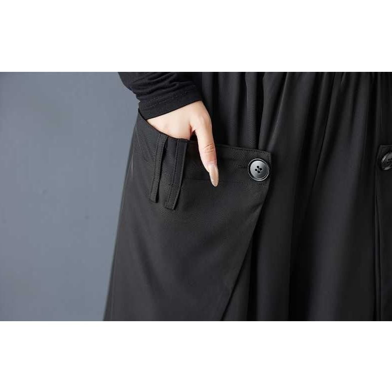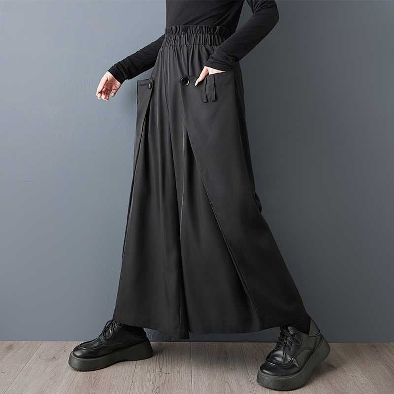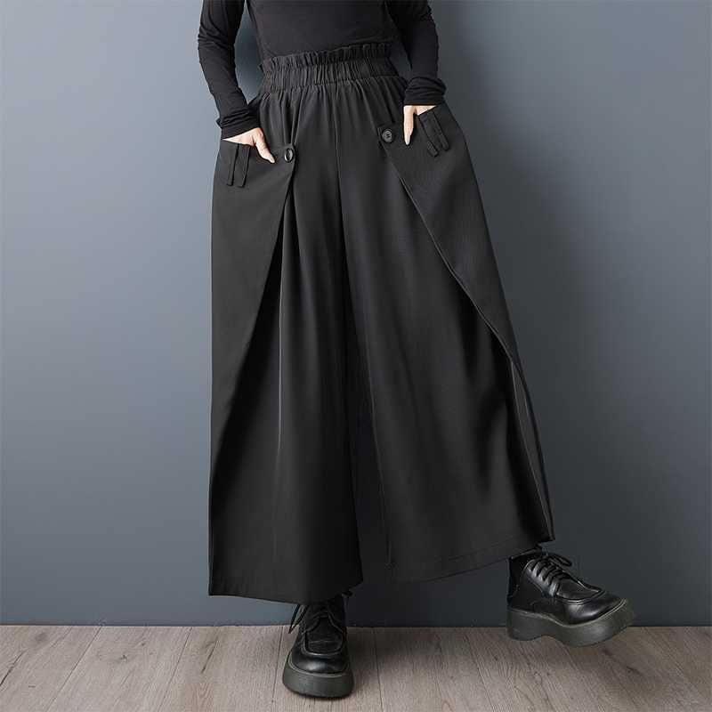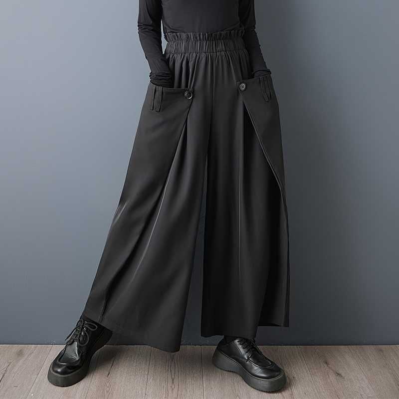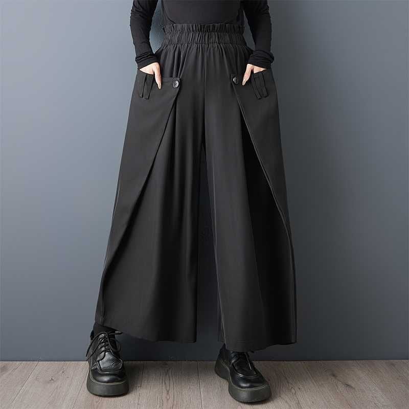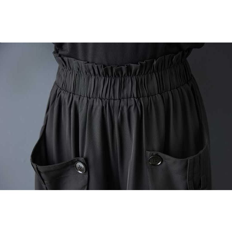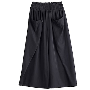 サイドを前に折ってボタンで留めたデザインがお洒落な、ワイドレッグ・クロップドパンツです。ウエストはゴムなので、着脱が簡単で履き心地が良いです。美しいシルエットが特徴的な、ブラックの単色でコーディネートしやすいアイテムです。