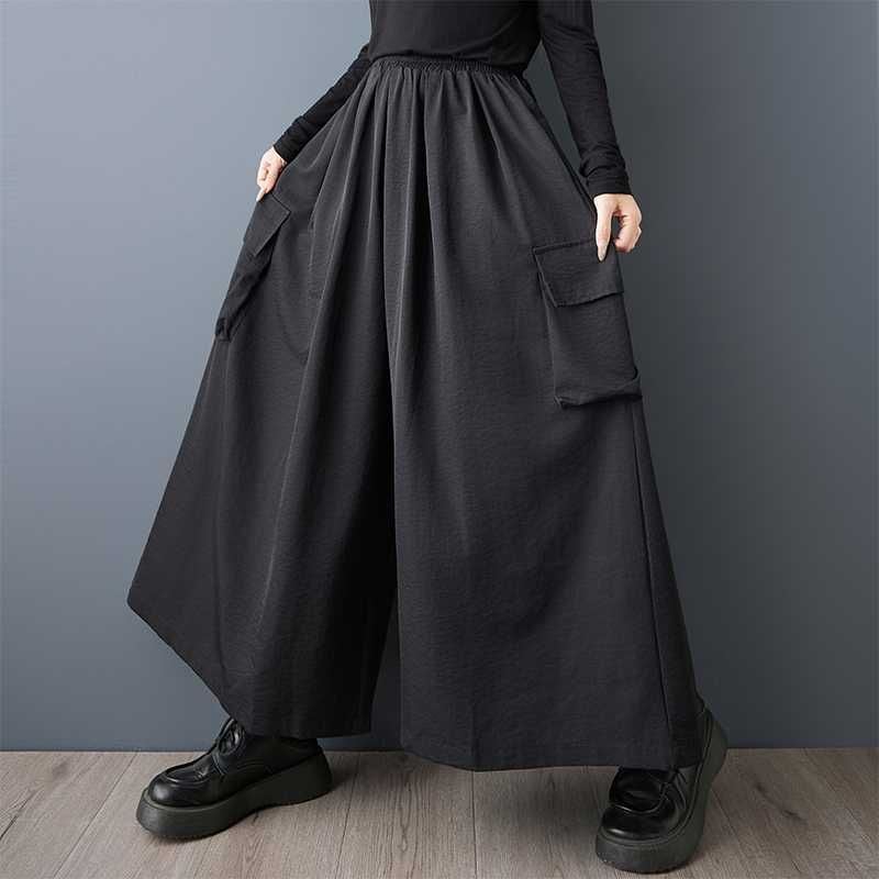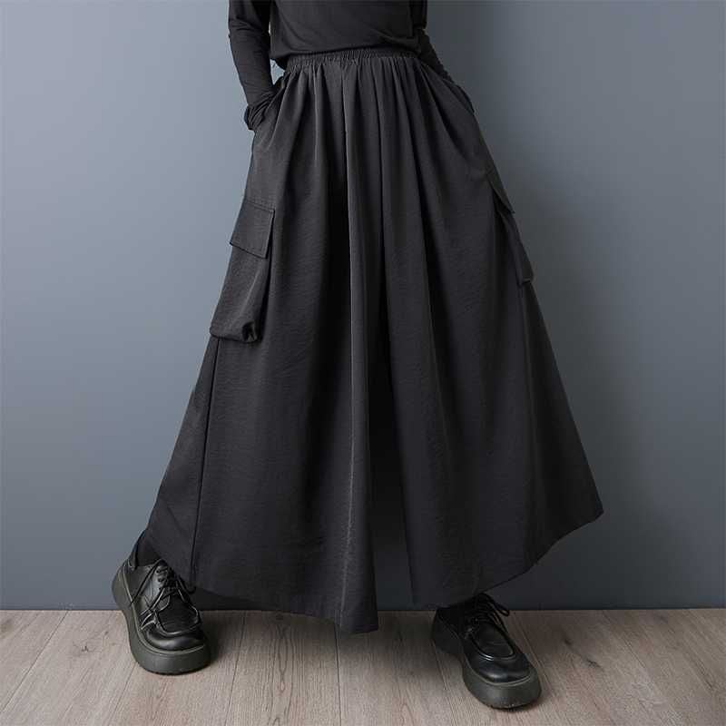 両サイドの立体的なフラップポケットがアクセントになった、ワイドレッグ・クロップドパンツです。ウエストはゴムなので、着脱が簡単で履き心地が良いです。Aラインシルエットのドレープが美しい、ブラックの単色でコーディネートしやすいアイテムです。