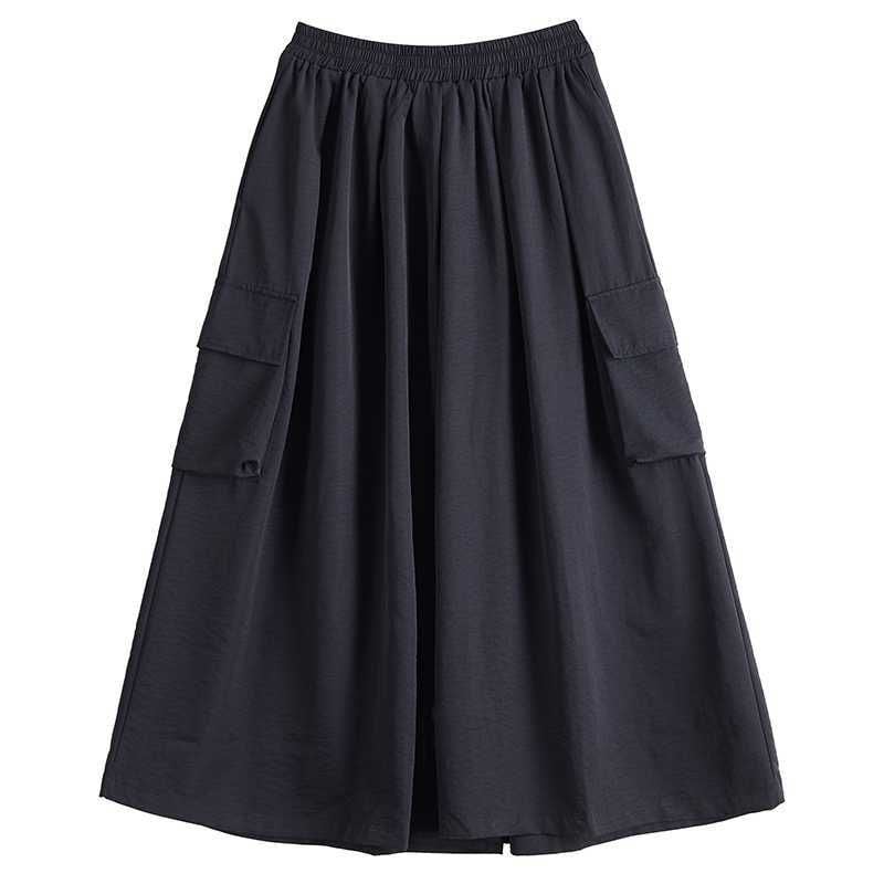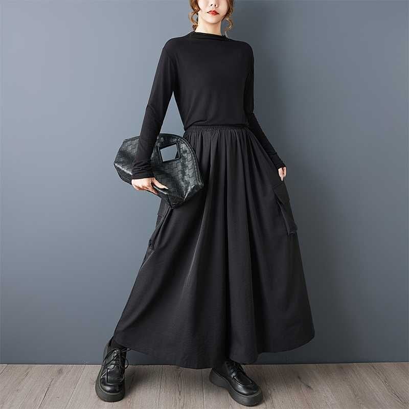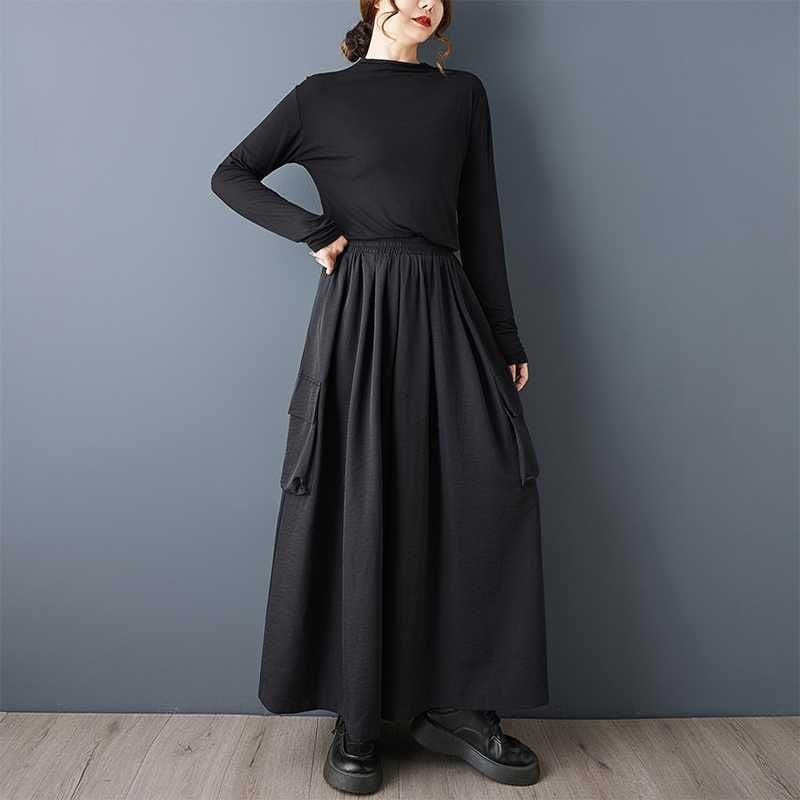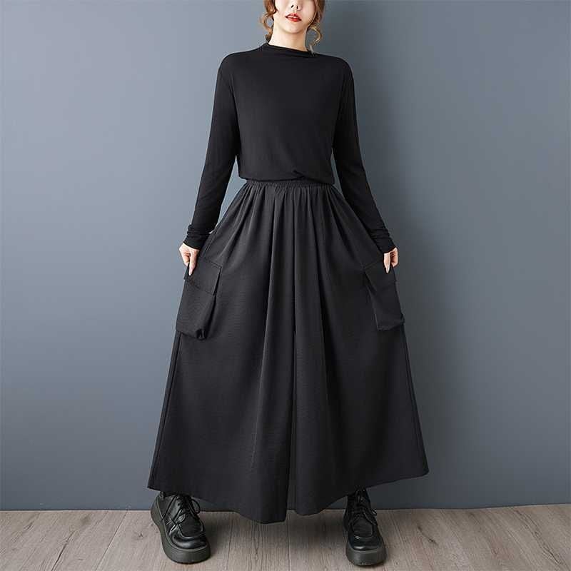 BLACK ELASTIC WAIST WIDE LEG A-LINE DESIGN PANTS 1color M-15814