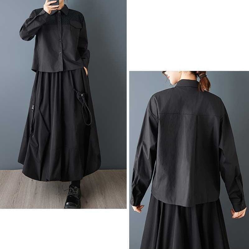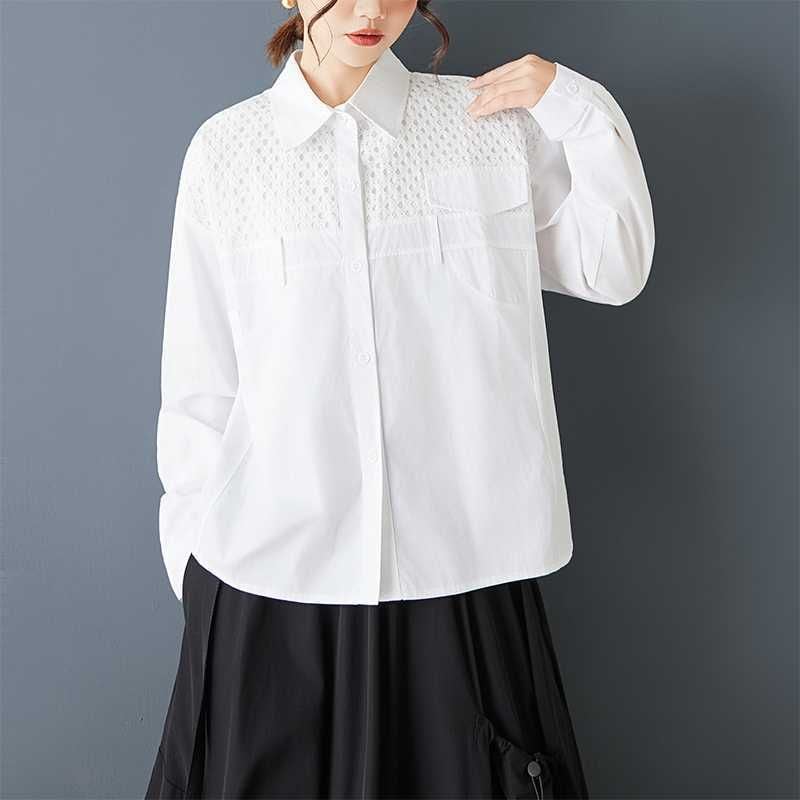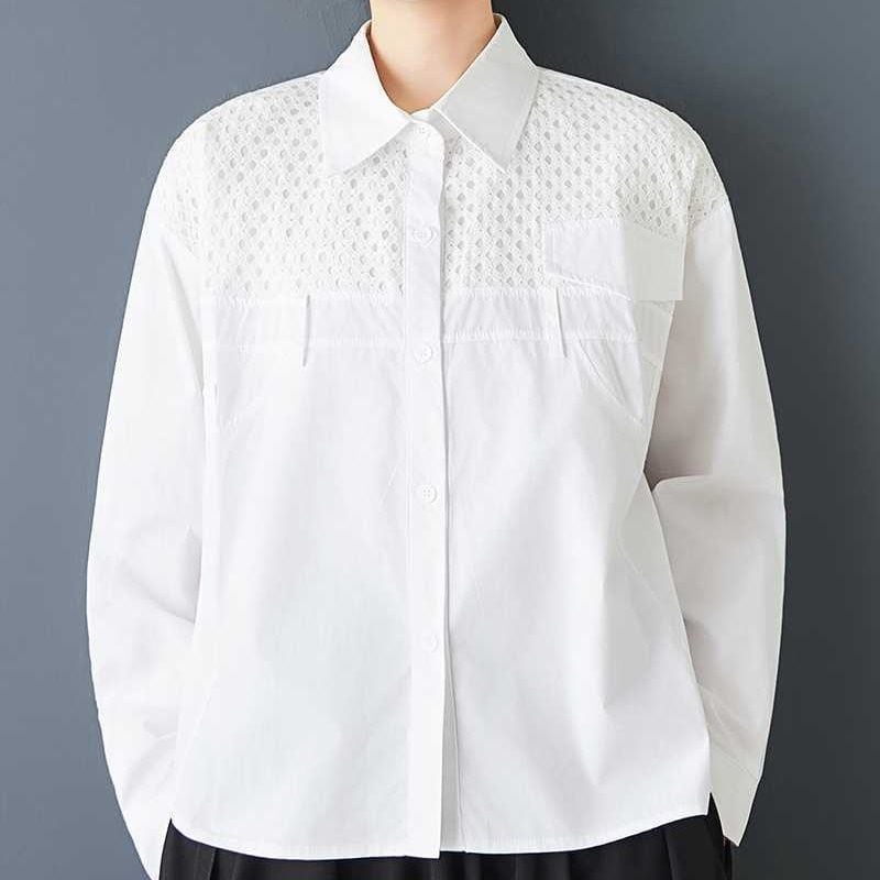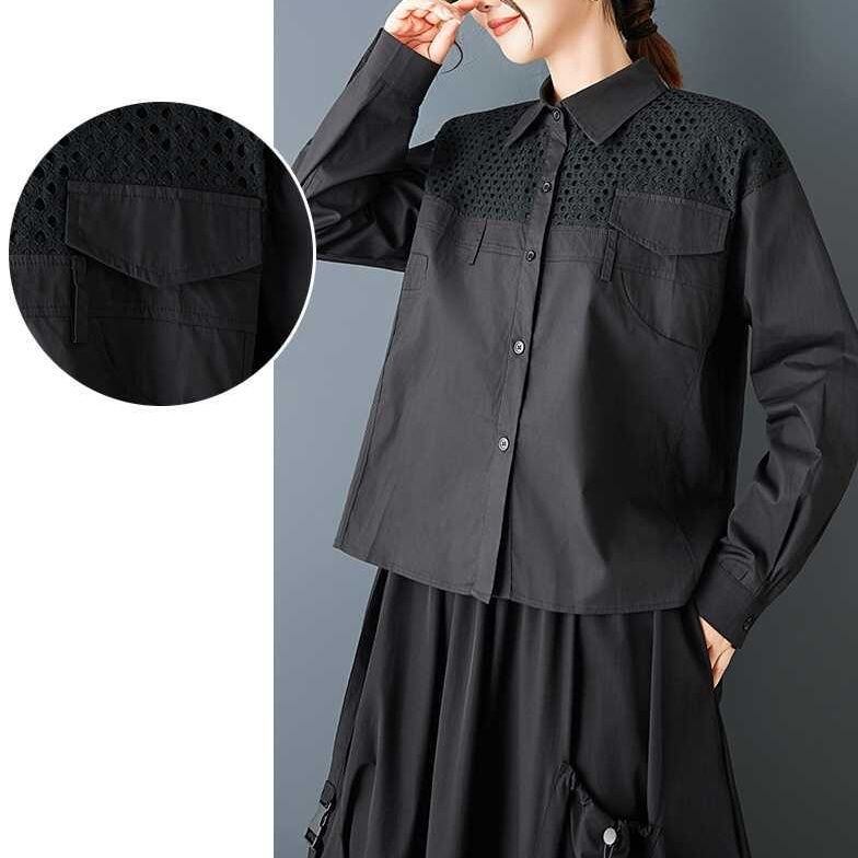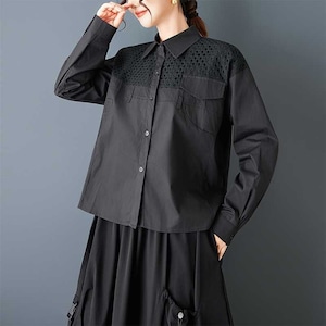 メッシュ素材のスティッチやポケットやベルト通しの飾りがお洒落な、ポロ襟・長袖・ストレートカットのデザインシャツです。単色で何にでも合わせやすい、モードな印象のアイテムです。ブラックとホワイトの2色から選べます。