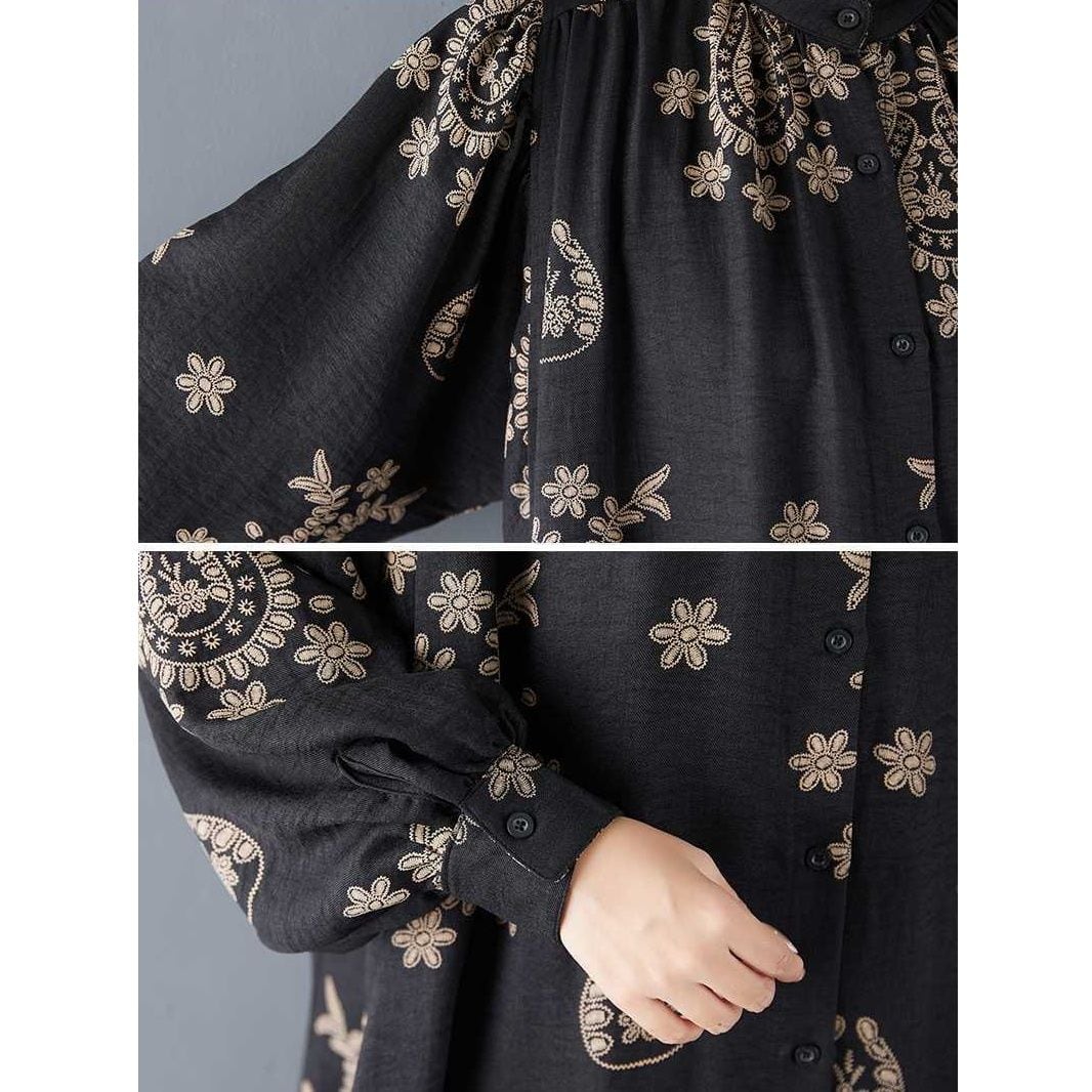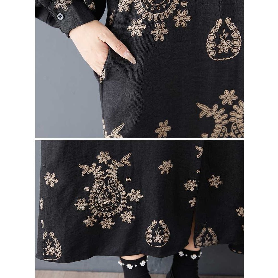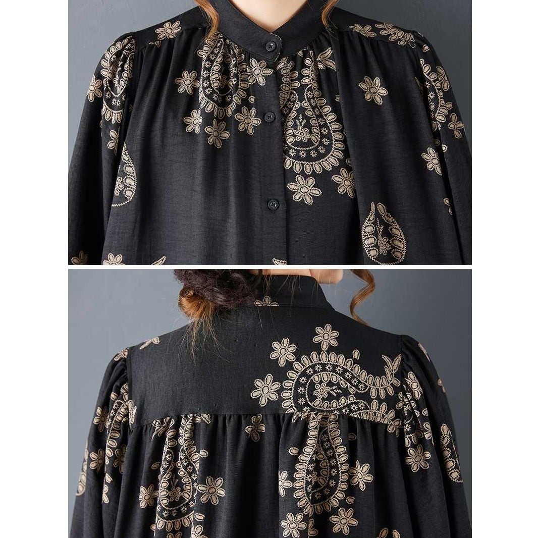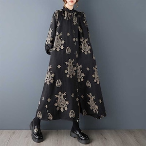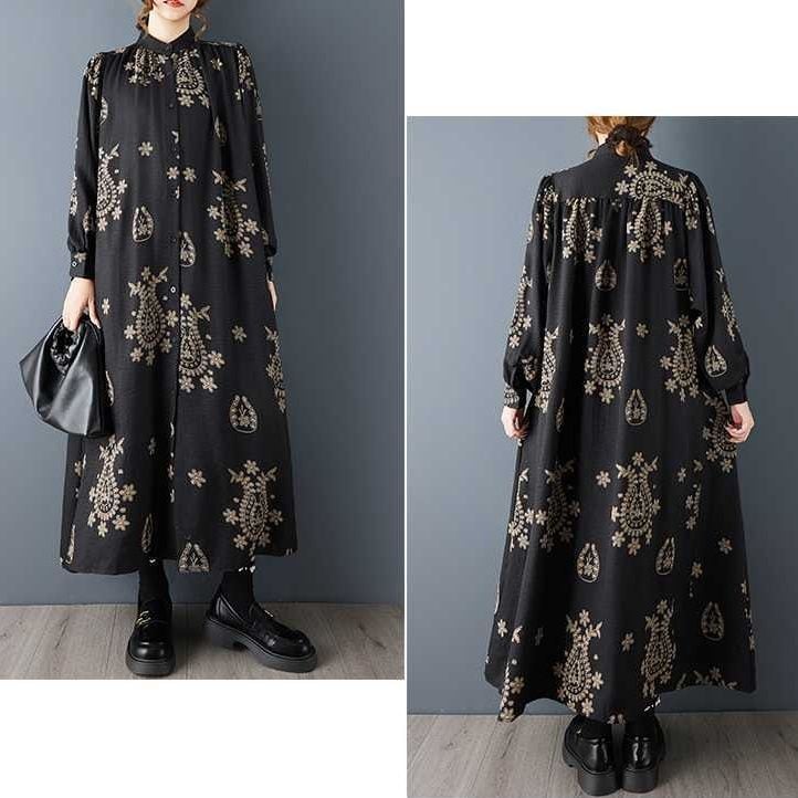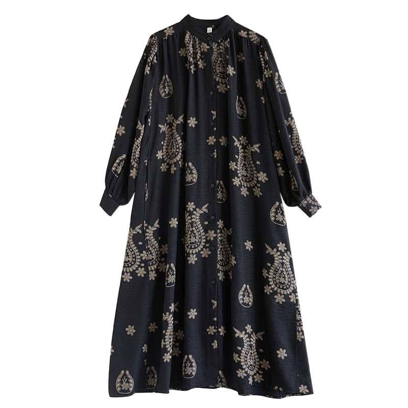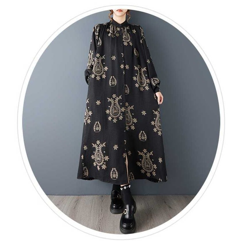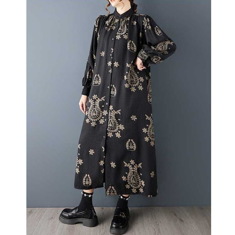 BLACK PRINT STAND COLLAR A-LINE LONG SHIRT DRESS 1color M-15819