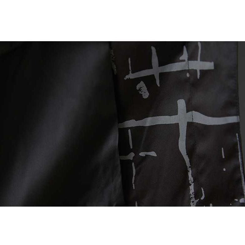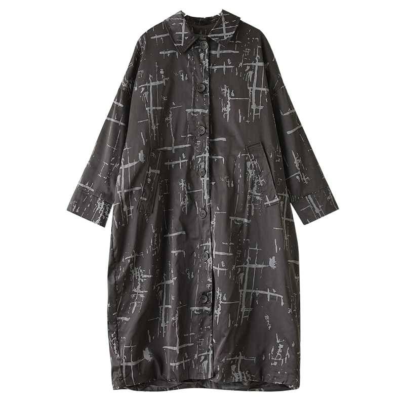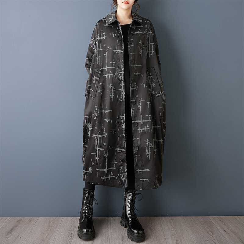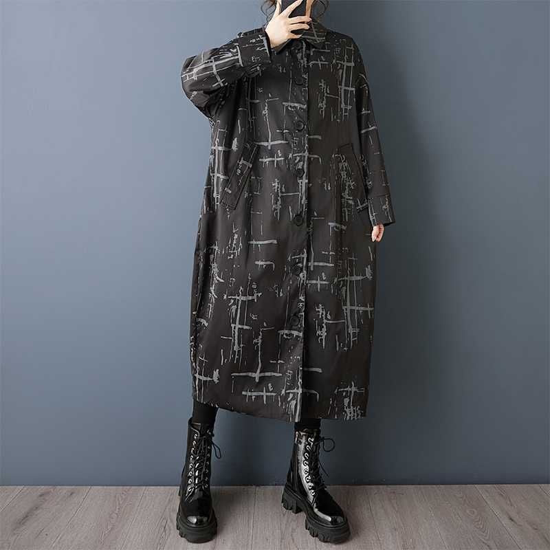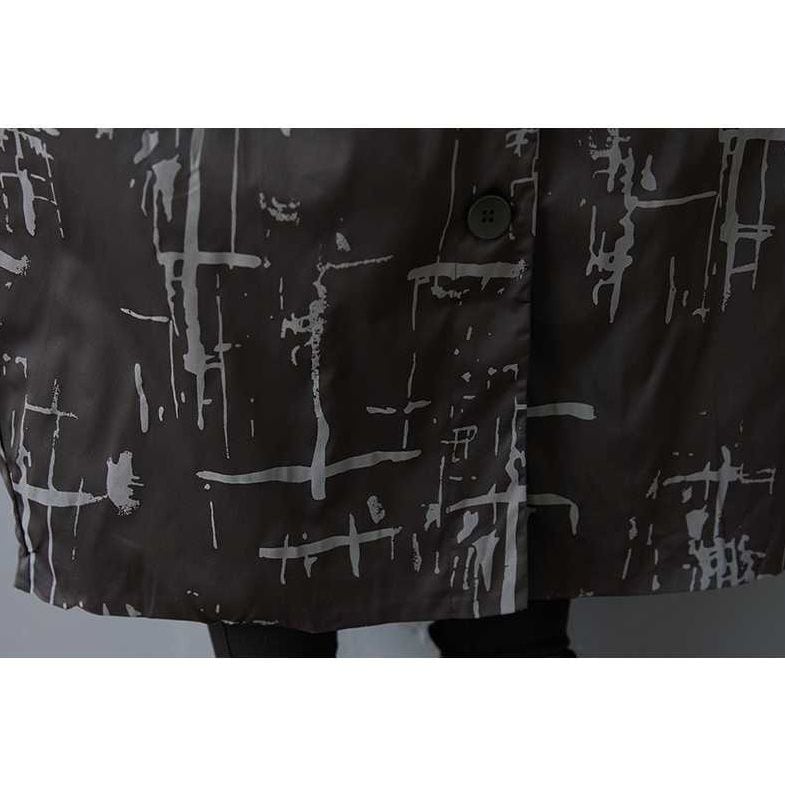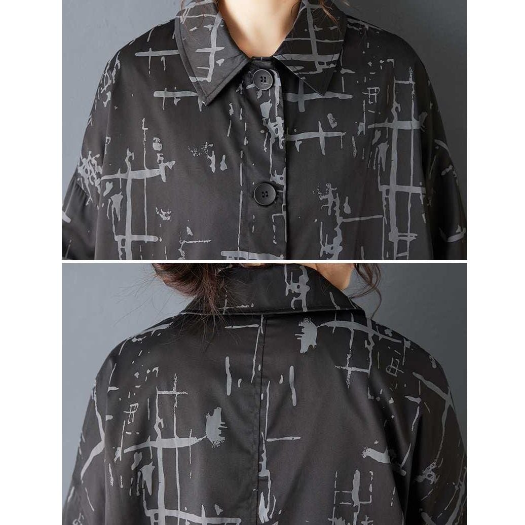 ブラックにグレーの柄プリントがクールな、ポロ襟・長袖・膝下丈のシャツコートです。コクーンのようなシルエットがお洒落な、落ち着いた色味で使いやすいカジュアルアイテムです。