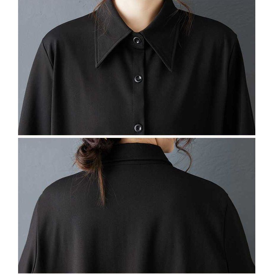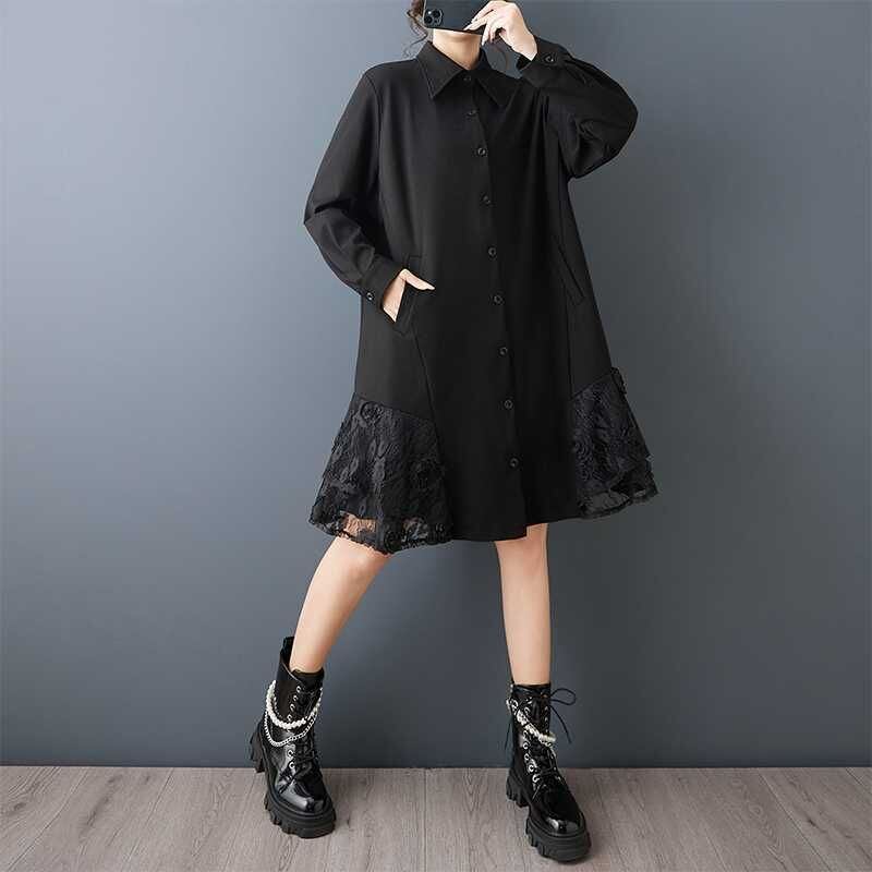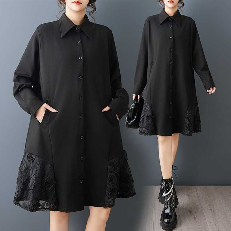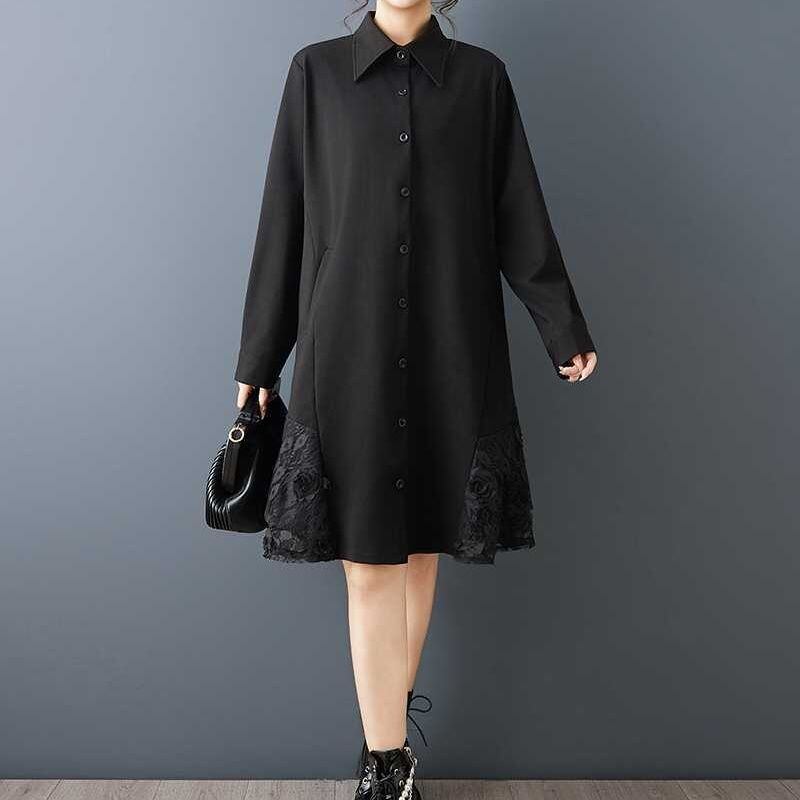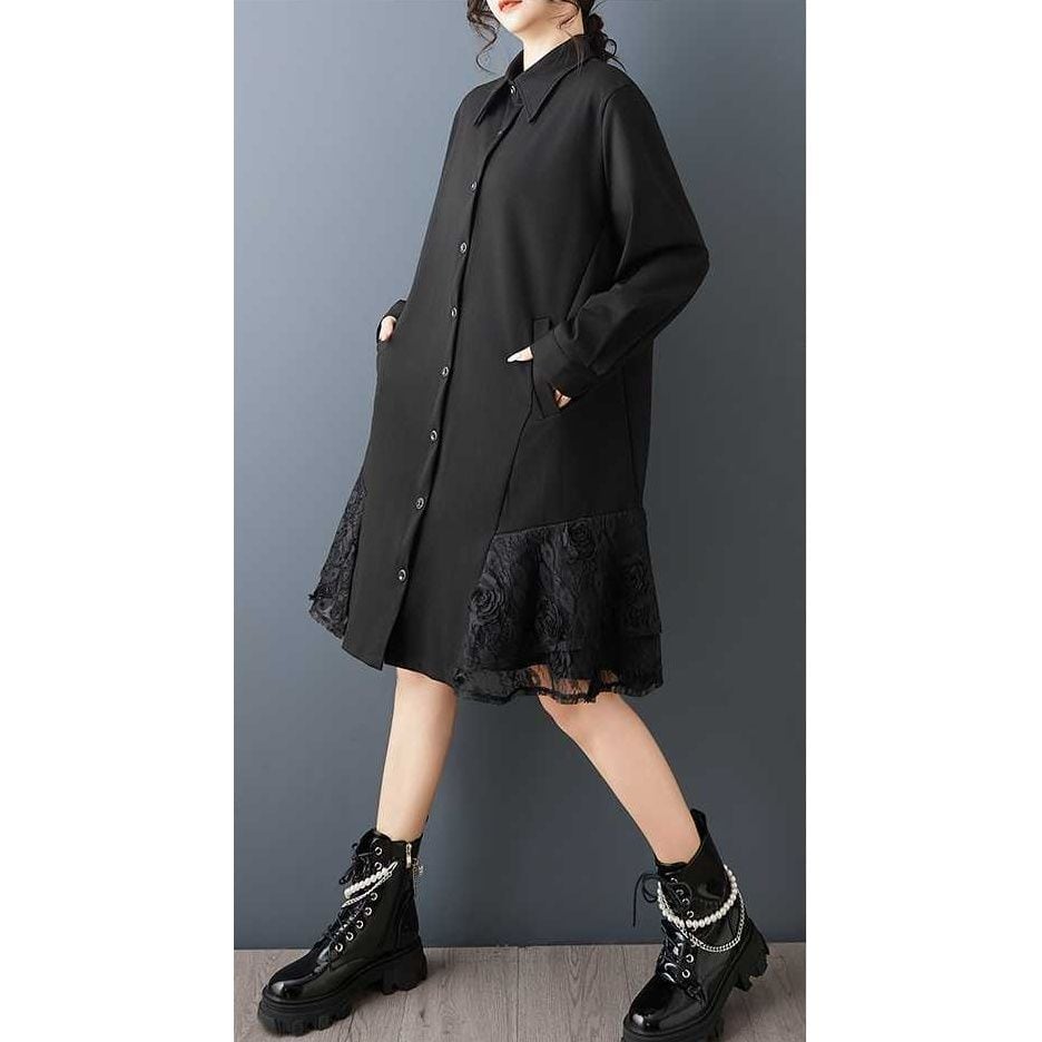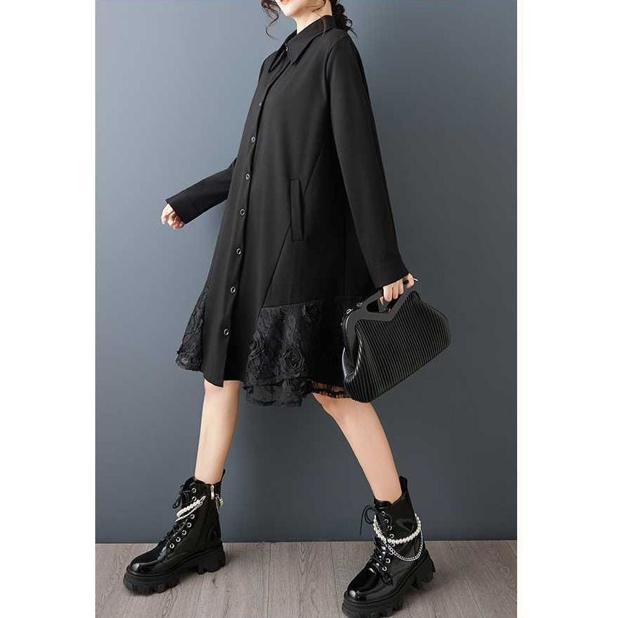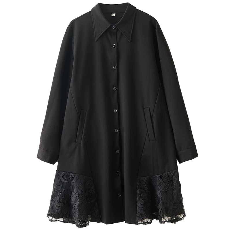 裾の両サイドにあしらわれたレースのスティッチが美しい、ポロ襟・長袖・ひざ上丈のシャツワンピースです。シックなブラックの単色で小物アレンジの利く、裾のシルエットがキュートなアイテムです。