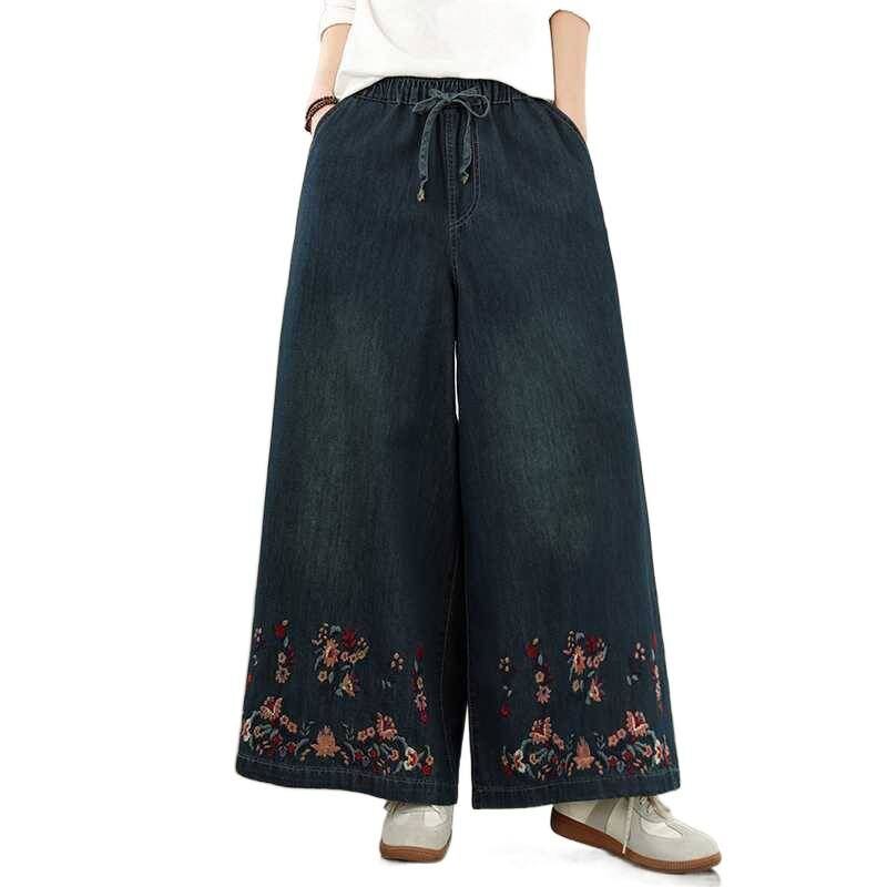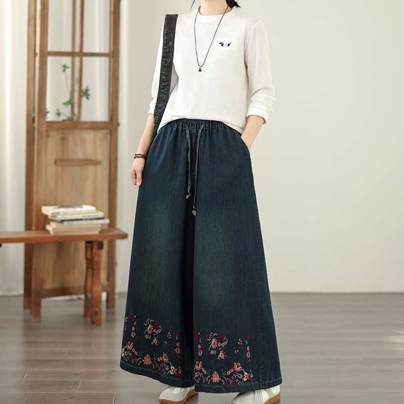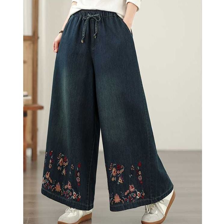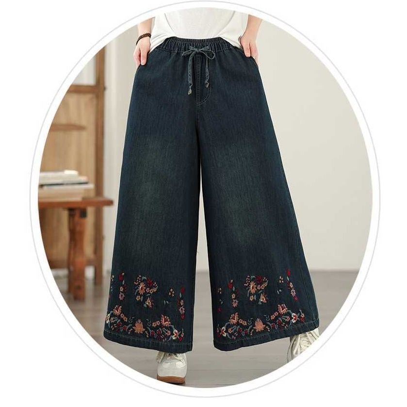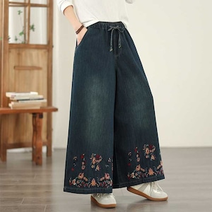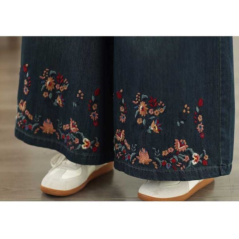 BOTANICAL EMBROIDERED A-LINE WIDE LEG DENIM PANTS 1color M-15832