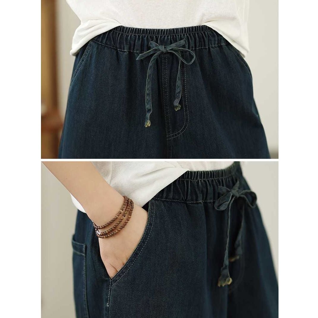 裾に施されたボタニカル刺繍が可愛らしい、Aラインシルエットのワイドレッグ・デニムパンツです。ウエストはゴム+ドローストリングで、履き心地が良いです。レッグラインをカバーする、何にでも合わせやすいカジュアルアイテムです。