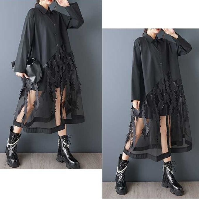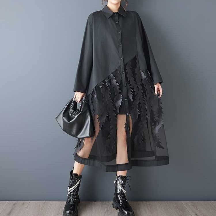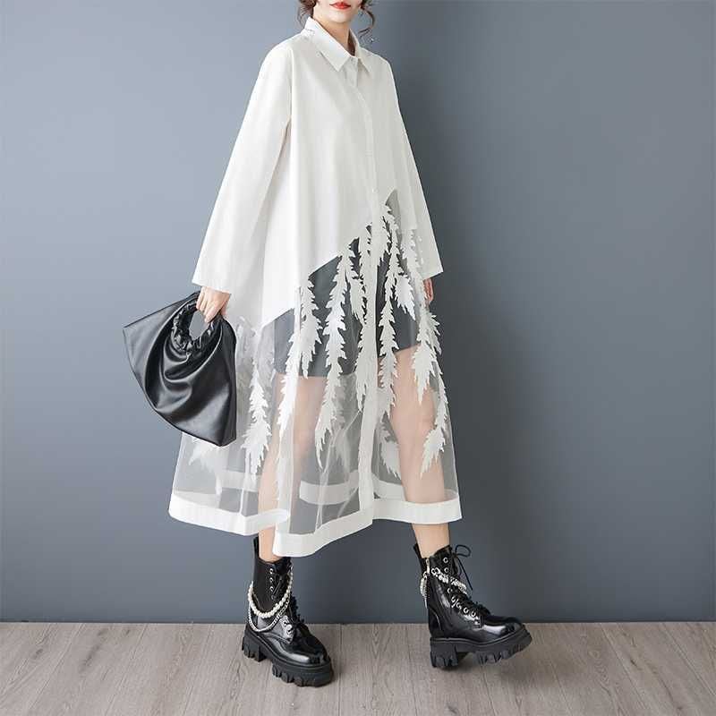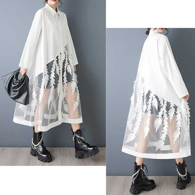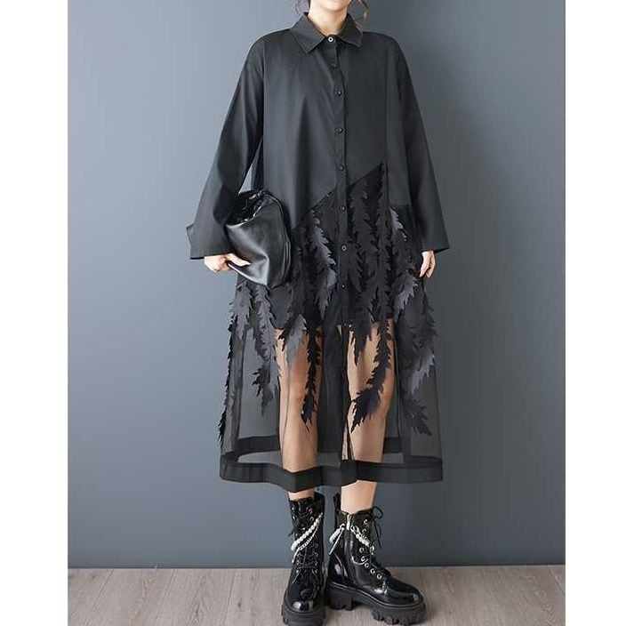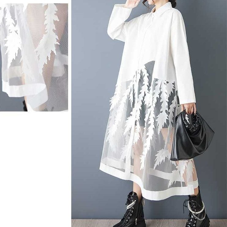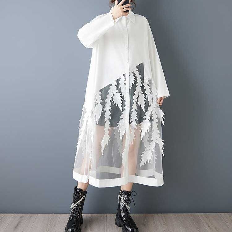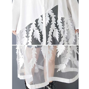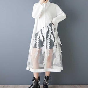 葉や羽のようなモチーフが付いたメッシュのスティッチが目を惹く、ポロ襟・長袖・ロング丈のシャツワンピースです。スカート部分の透け感がお洒落な、インナーとのアレンジを楽しめるアイテムです。ブラックとホワイトの2色から選べます。