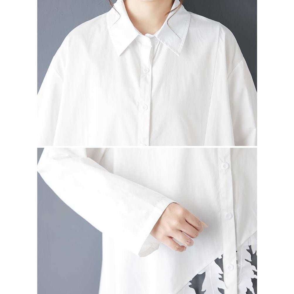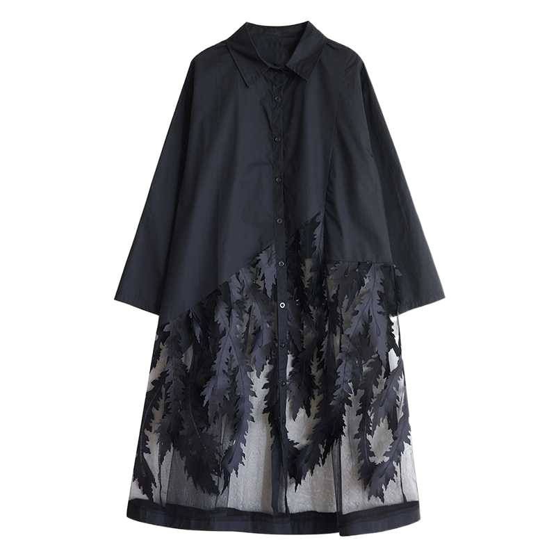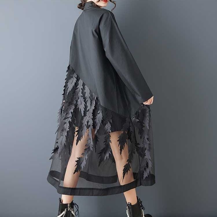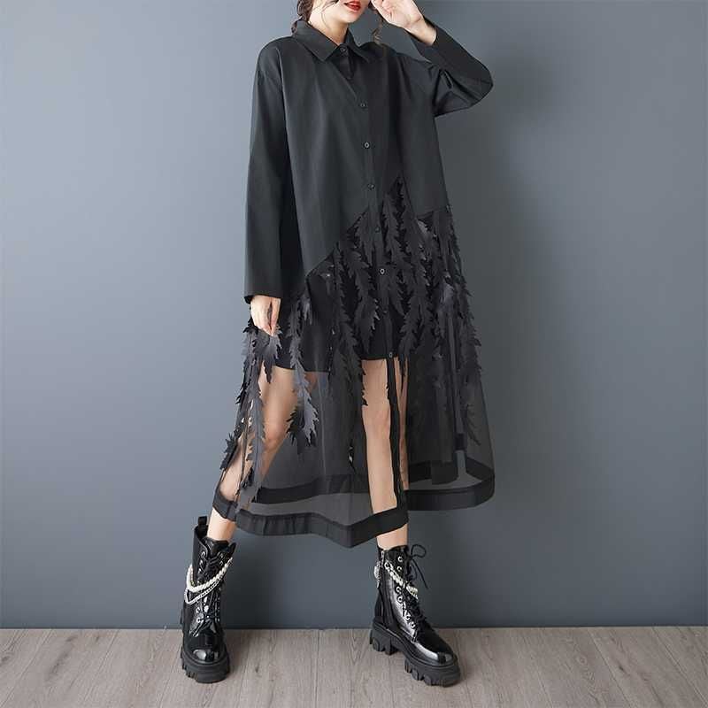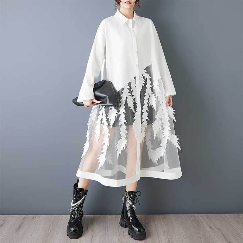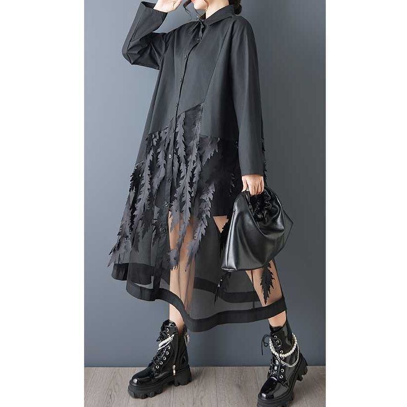 葉や羽のようなモチーフが付いたメッシュのスティッチが目を惹く、ポロ襟・長袖・ロング丈のシャツワンピースです。スカート部分の透け感がお洒落な、インナーとのアレンジを楽しめるアイテムです。ブラックとホワイトの2色から選べます。