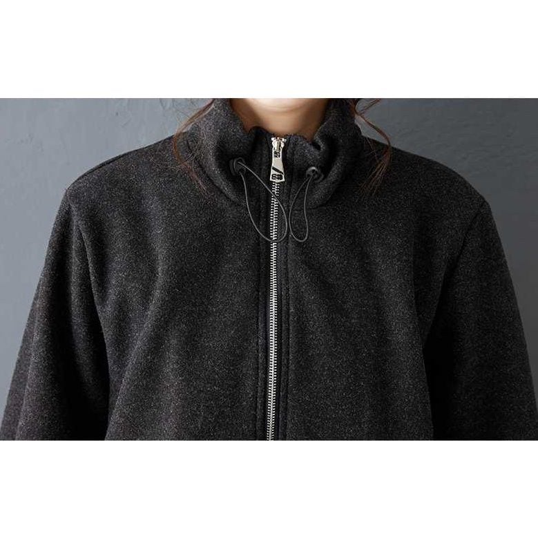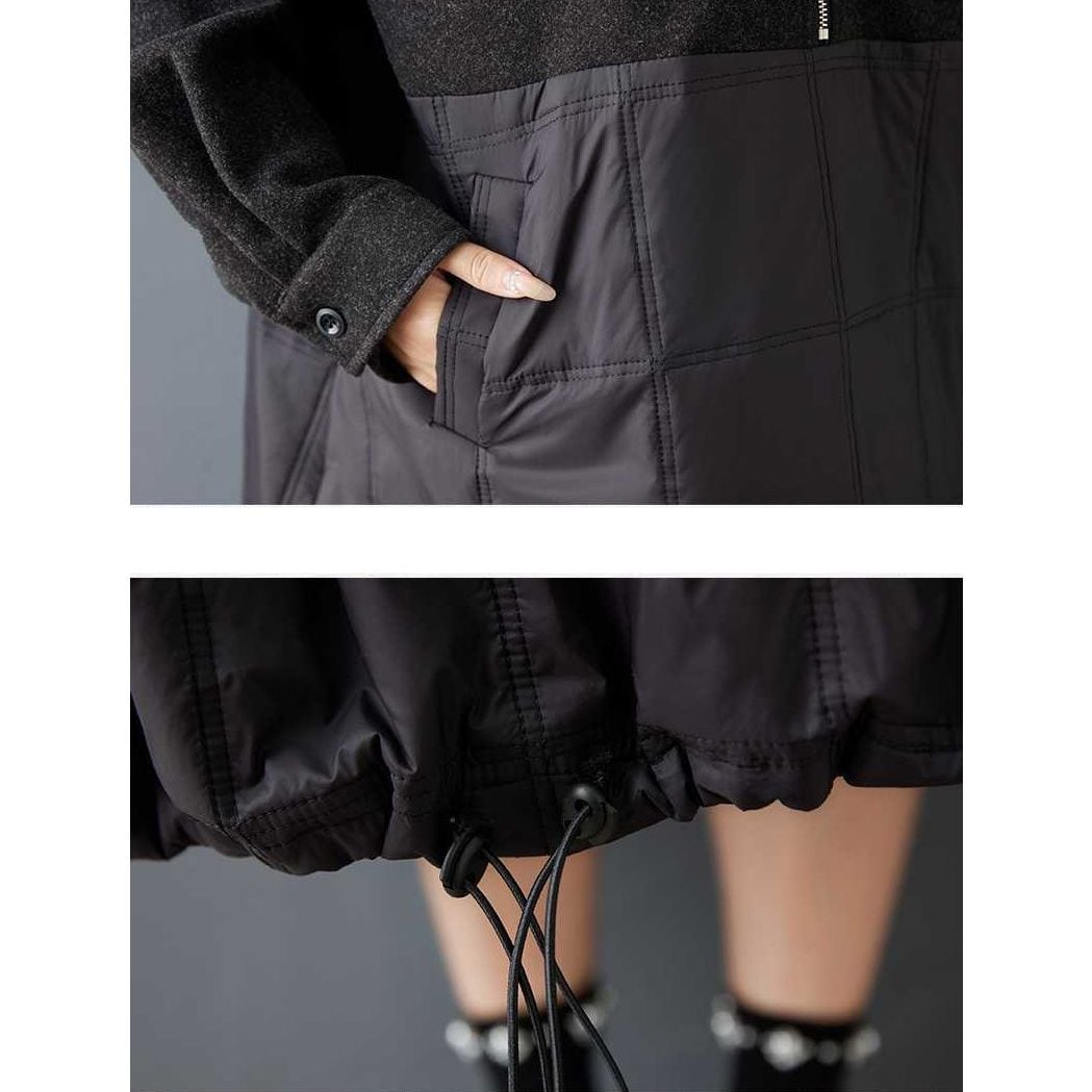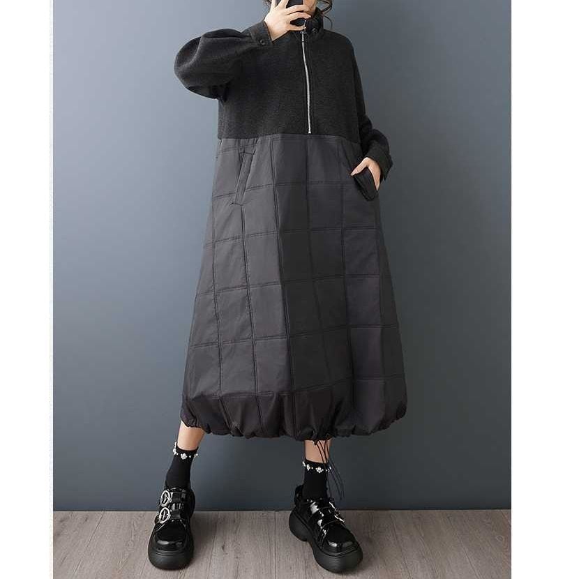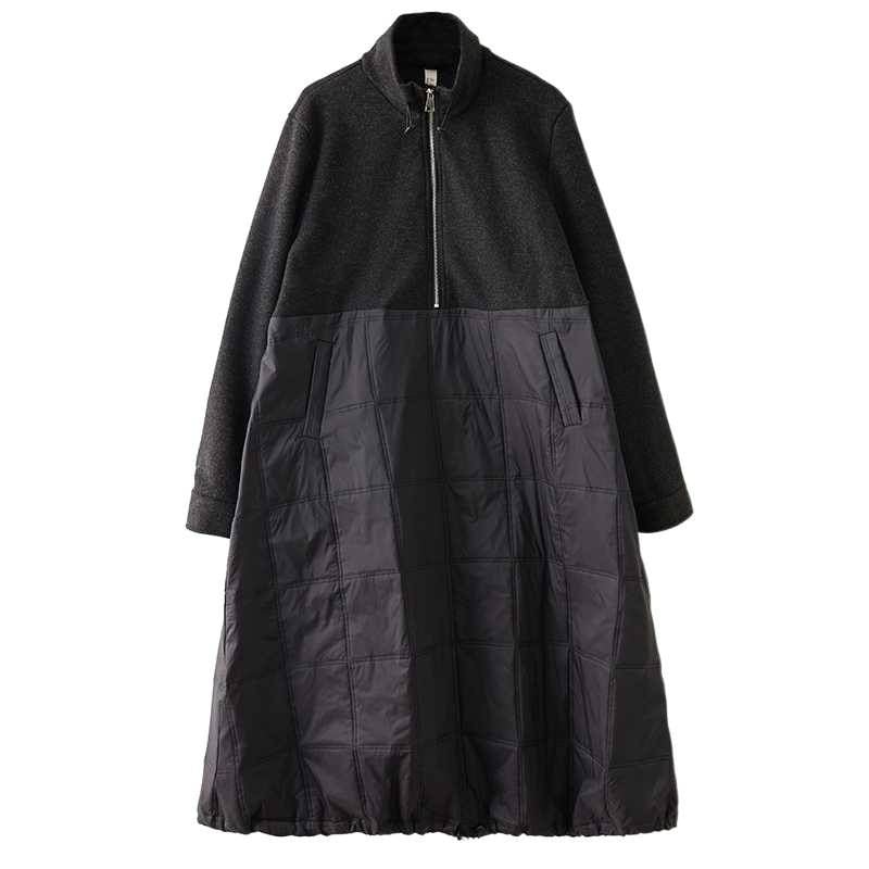 フリース素材にキルティングのスカートで暖かな、スタンドカラー・ハーフジップ・長袖・膝下丈のプルオーバーワンピースです。スタンドカラーと裾にドローコードが付いて、シルエットを調節できます。ブラックで差し色や小物アレンジの利く、寒い季節に活躍するカジュアルアイテムです。
