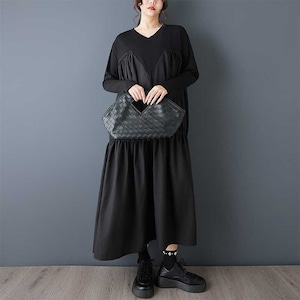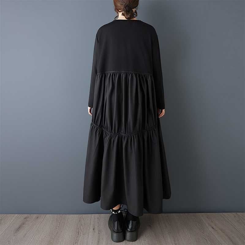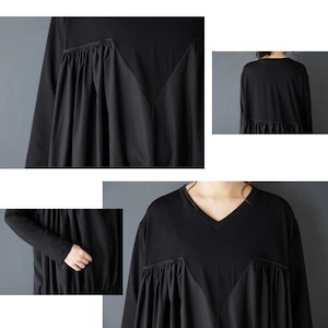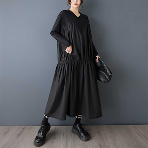 同色の異なる素材のスティッチデザインがお洒落な、Vネック・長袖・ロング丈のプルオーバーワンピースです。ブラックの単色で、小物や差し色アレンジが効きます。ティアードデザインの、ゆったりとしたAラインシルエットが魅力的なアイテムです。