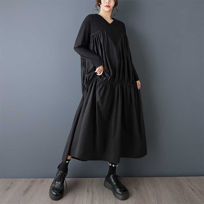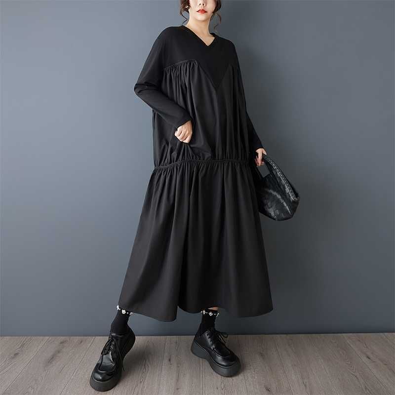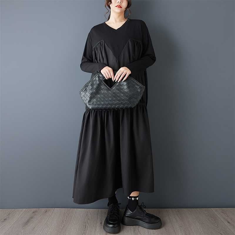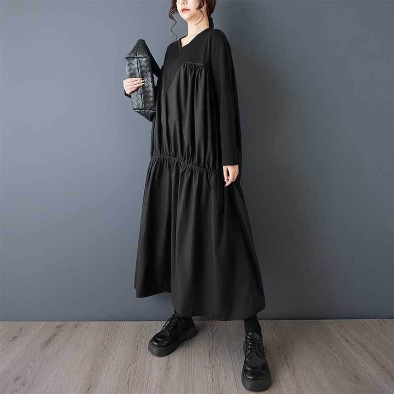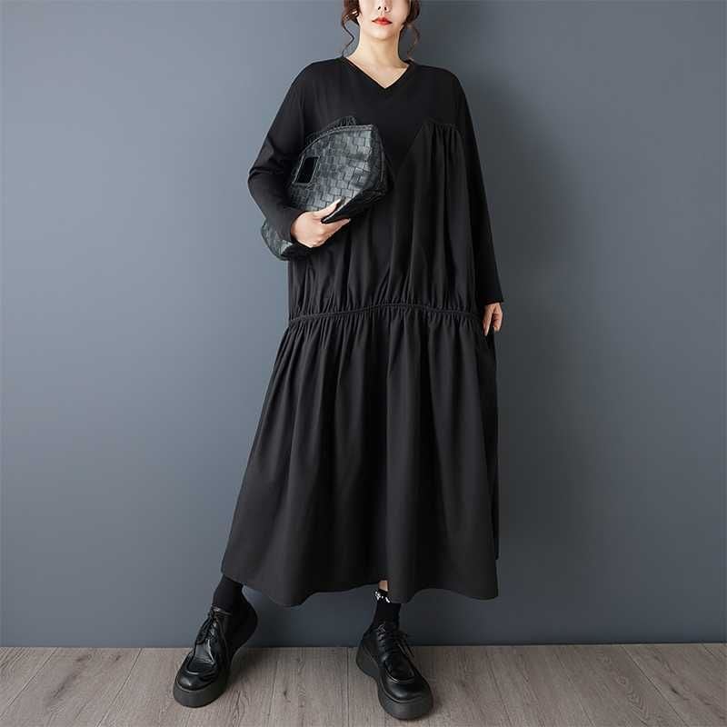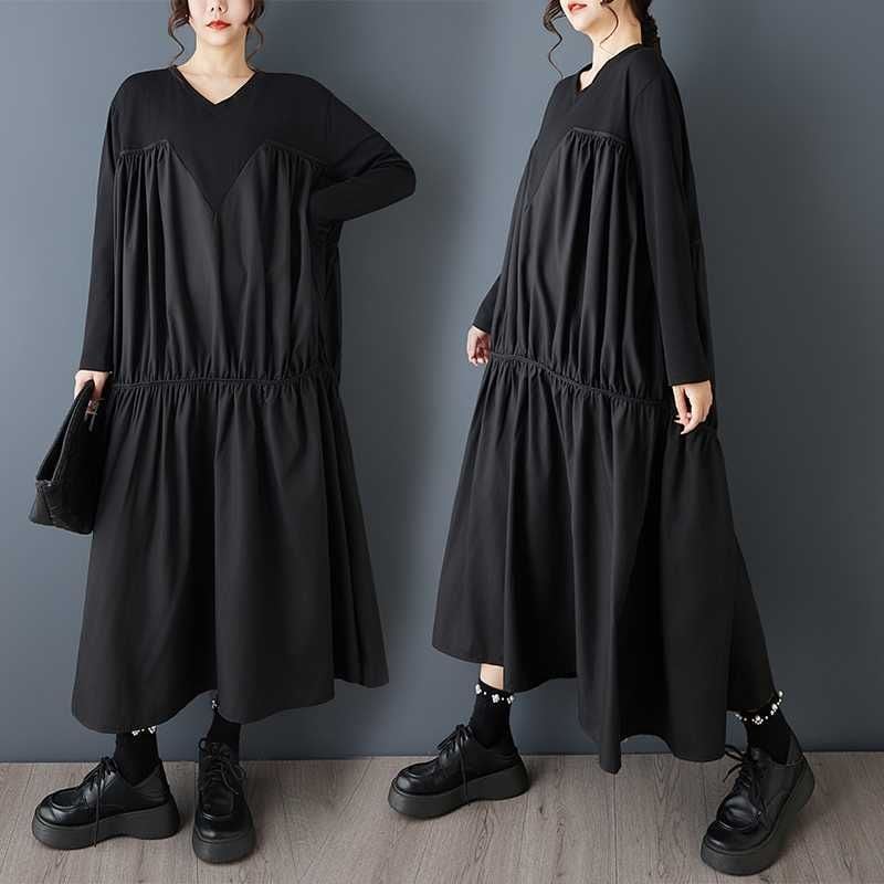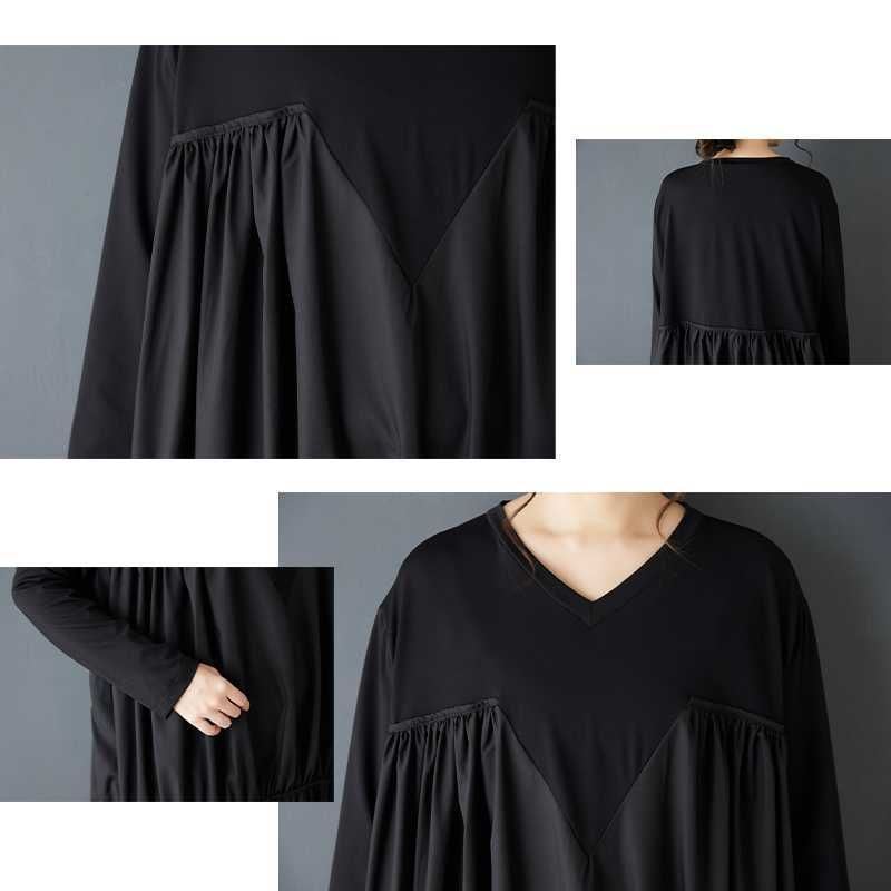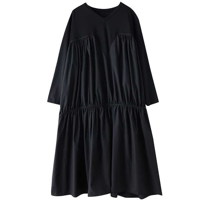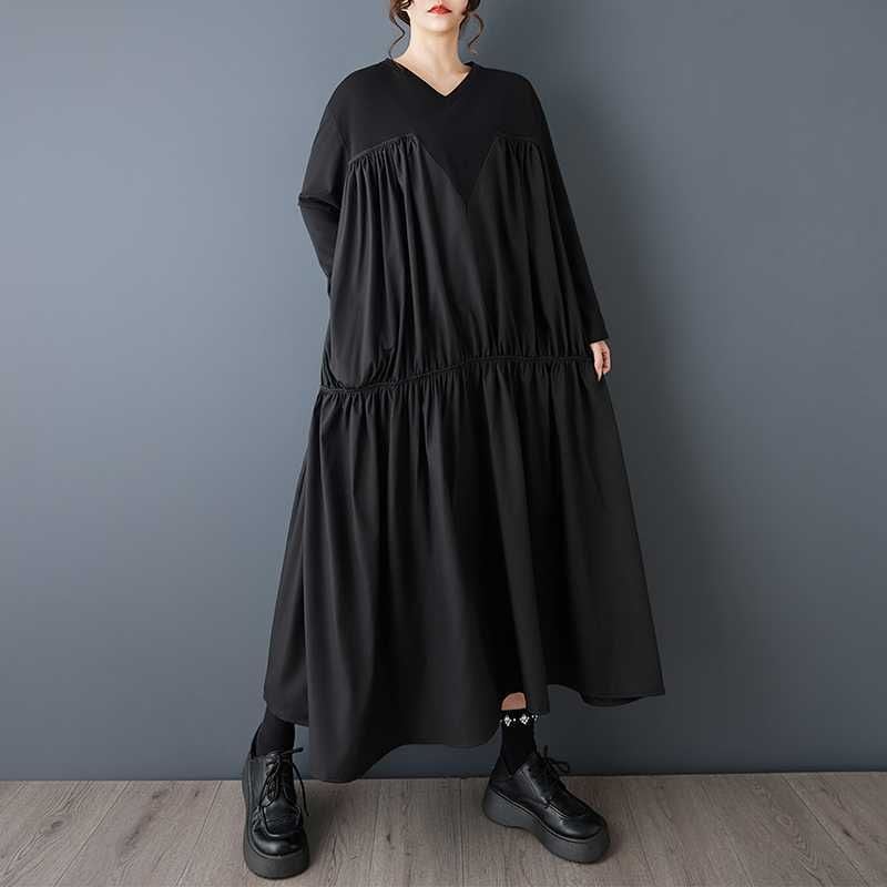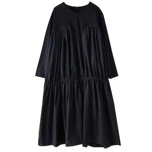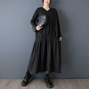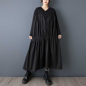 BLACK V-NECK A-LINE LONG PULLOVER DESIGN DRESS 1color M-15846