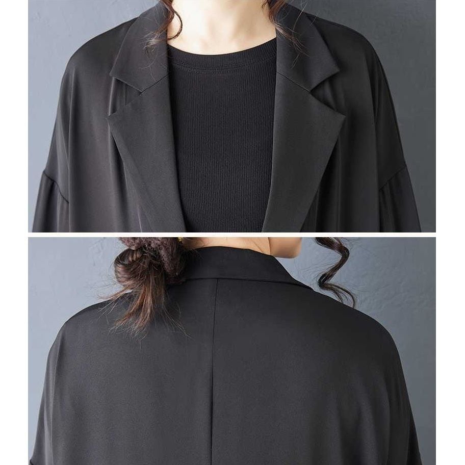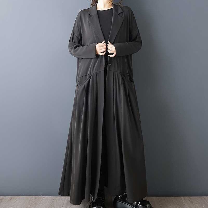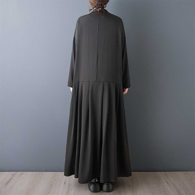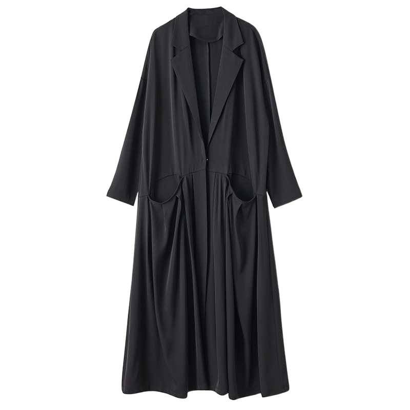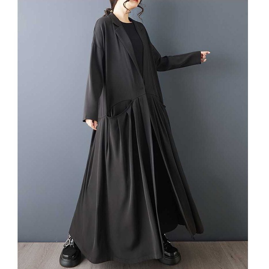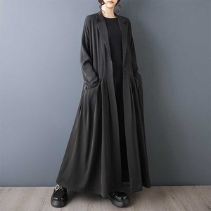 ブラックの単色で美しいドレープが目を惹く、ラペル付きVネック・長袖・マキシ丈のコートです。 腰の切り返しでプリーツ加工された、ゆったりとしたAラインシルエットがエレガントなアイテムです。