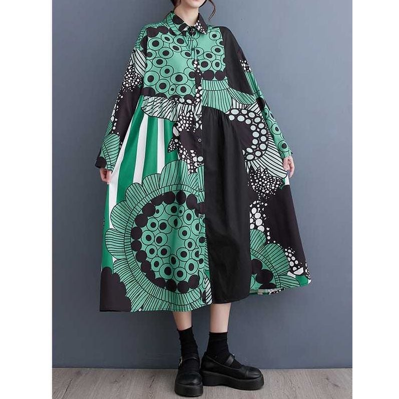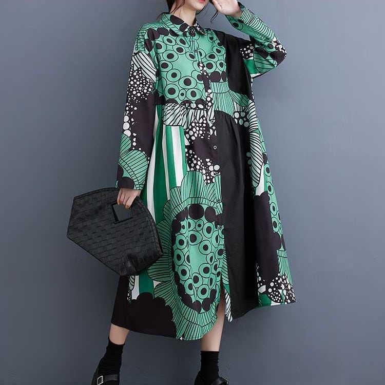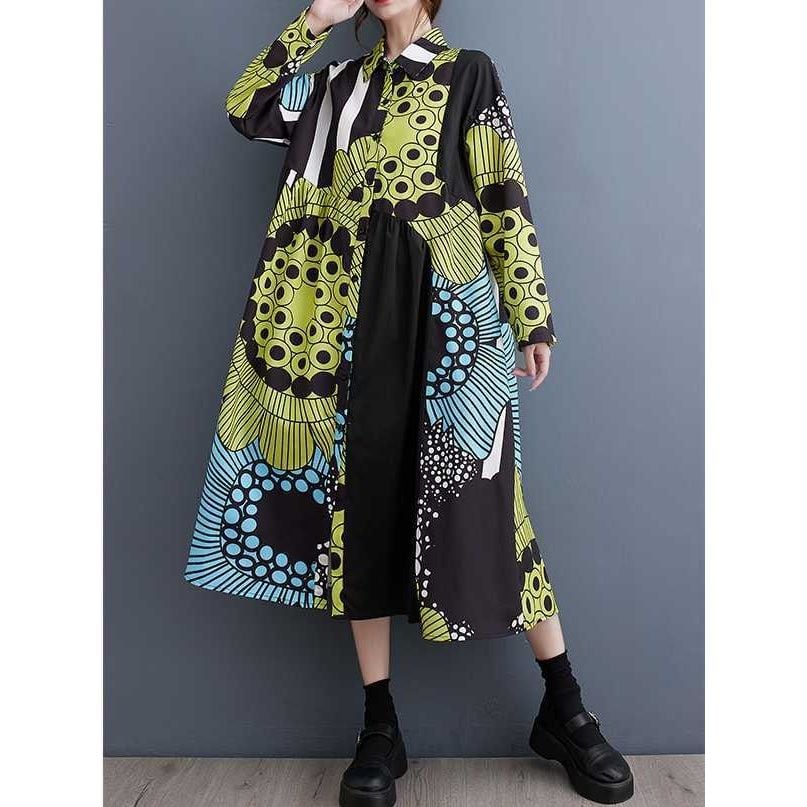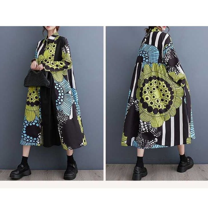 大きなフラワーモチーフのイラストプリントが目を惹く、ポロ襟・長袖・膝下丈のシャツワンピースです。Aラインシルエットが美しい、アーティスティックなデザインでコーディネートの主役になるアイテムです。グリーンとイエローの2色から選べます。