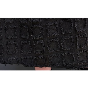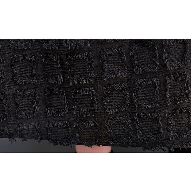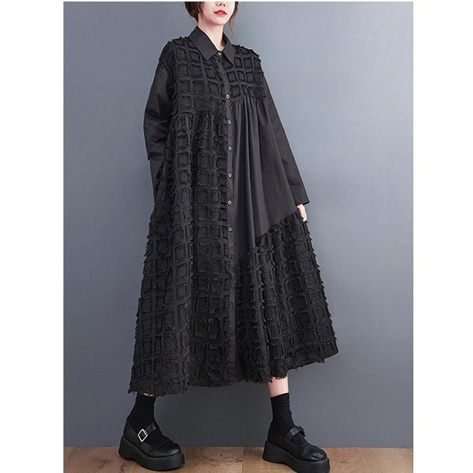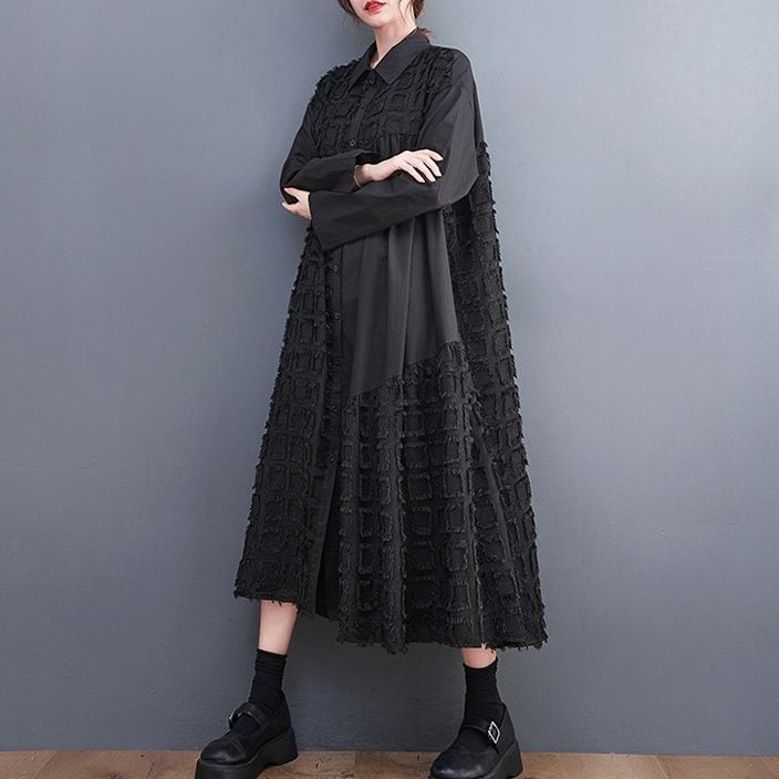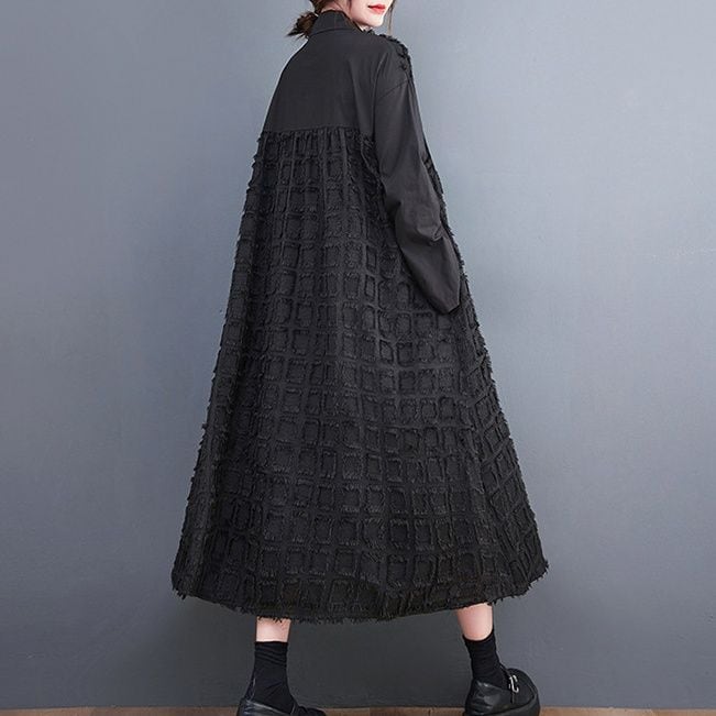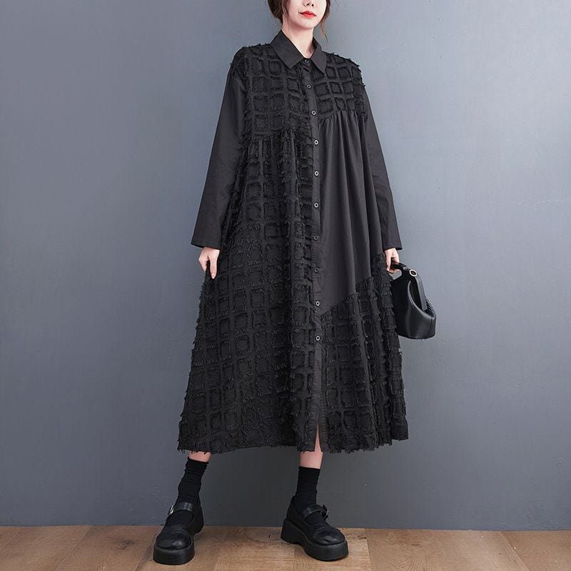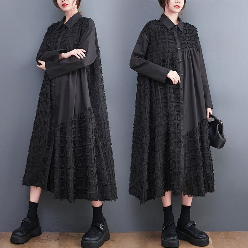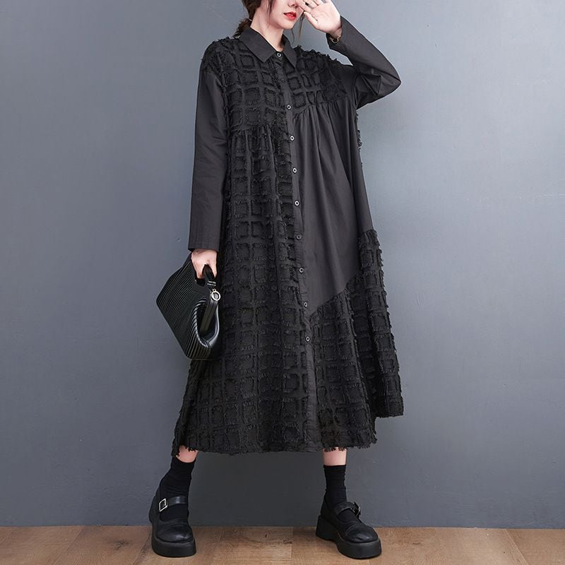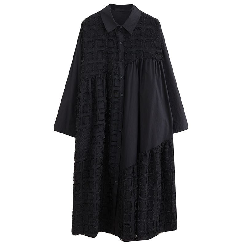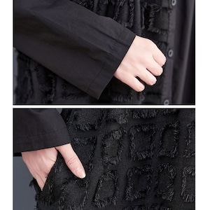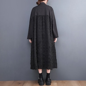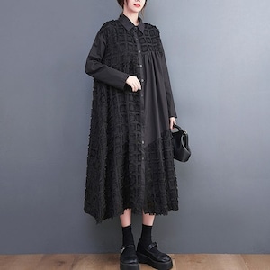 ブラックの無地と凹凸柄のアシンメトリックなスティッチデザインがお洒落な、ポロ襟・長袖・膝下丈のシャツワンピースです。ゆったりとしたAラインが魅力的な、ブラックの単色でアクセサリーなどの小物アレンジが利くアイテムです。