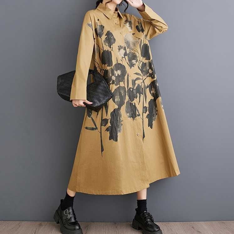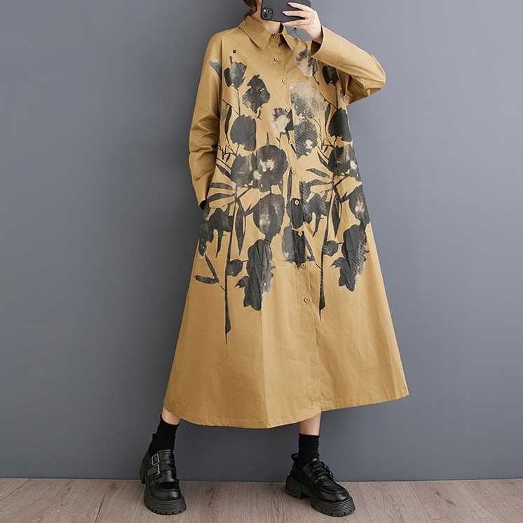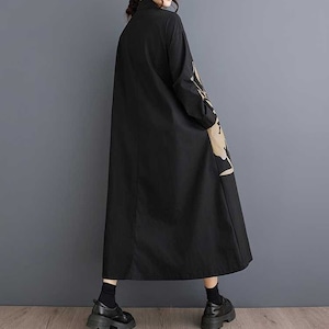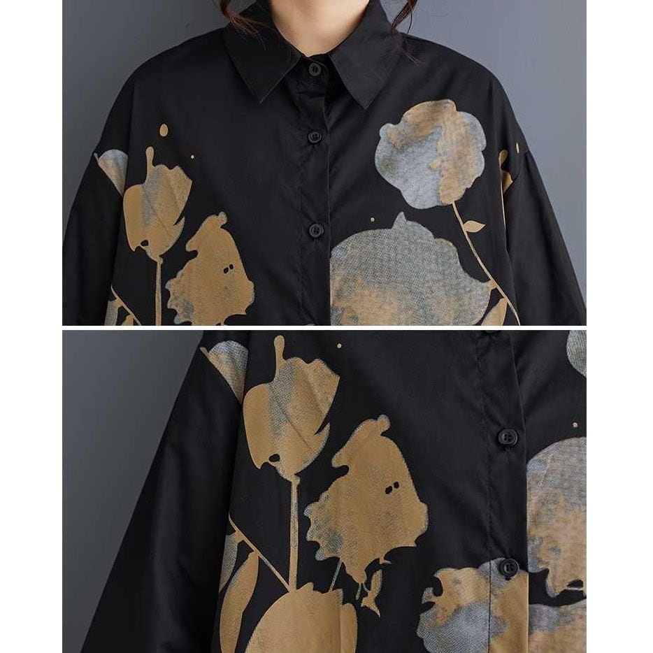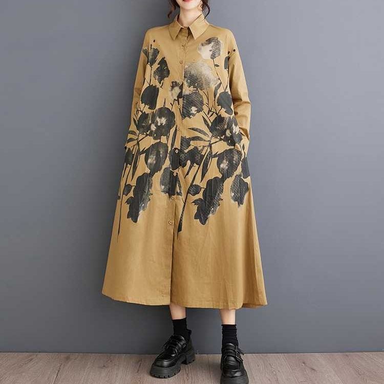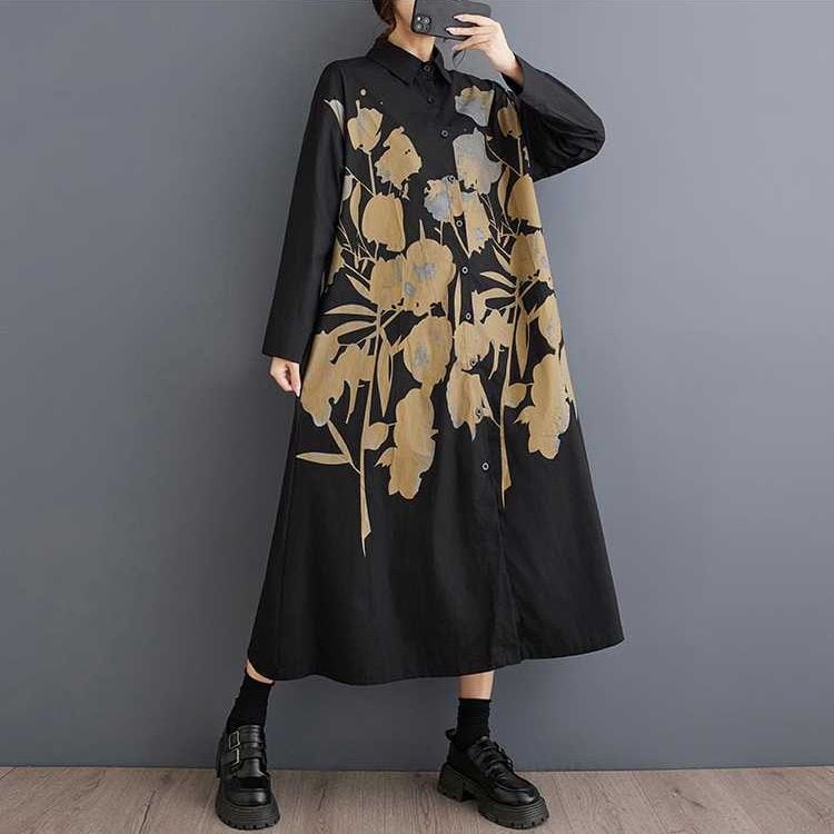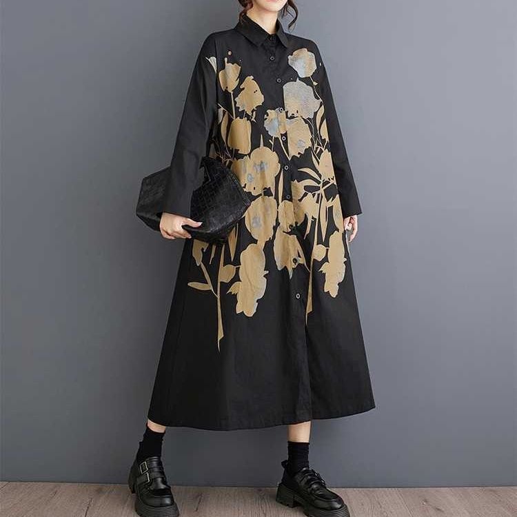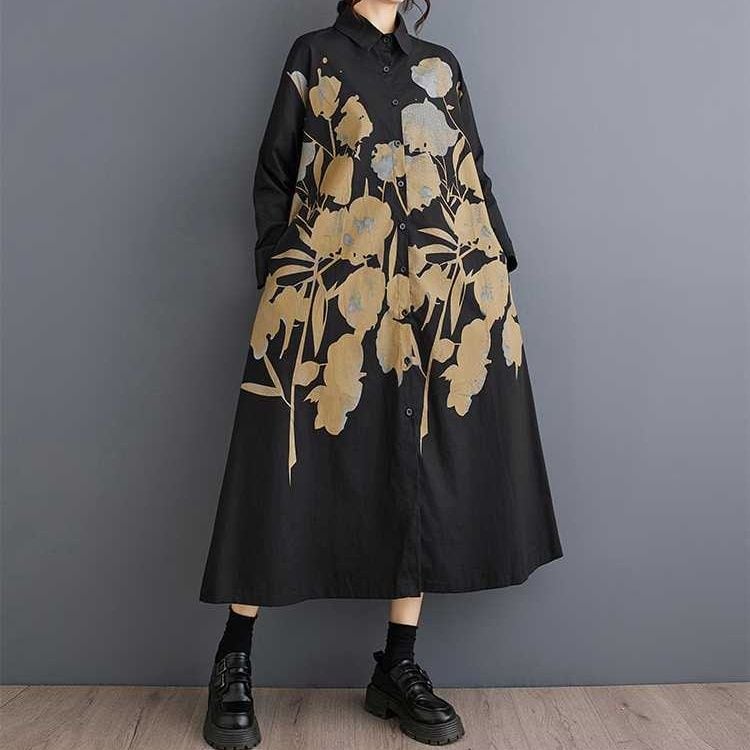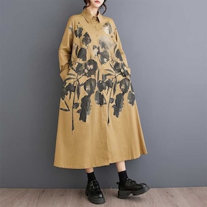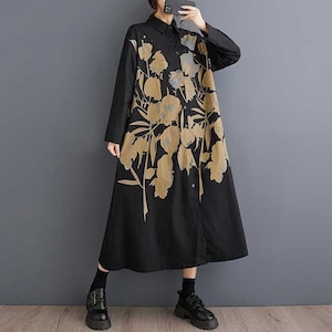 BOTANICAL PRINT A-LINE LONG SHIRT DRESS 2colors M-15853