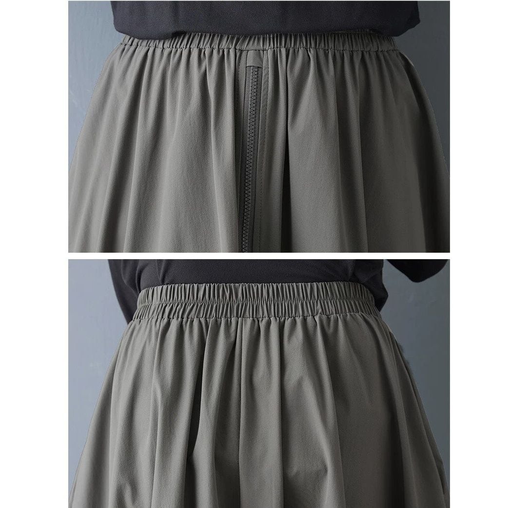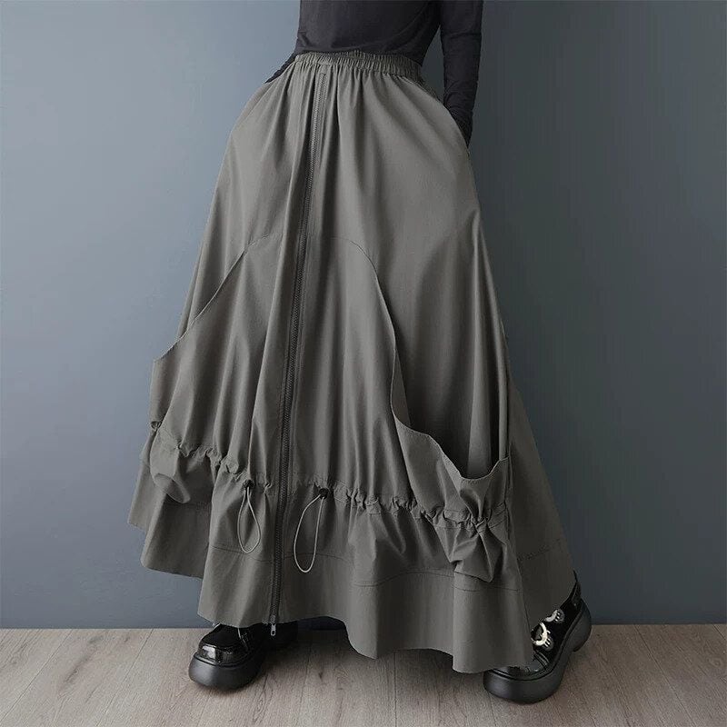 ドローコードが付いたスティッチが作り出すシルエットが魅力的な、Aライン・フルジップ・ロング丈のデザインスカートです。ウエストはゴムなので、着脱が簡単で履き心地が良いです。単色でどんなトップスとも合わせやすい、ドレープが美しいアイテムです。ブラックとグレーの2色から選べます。