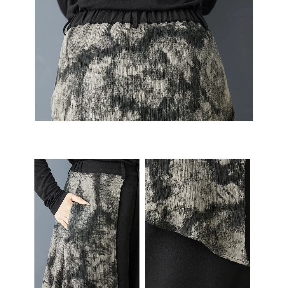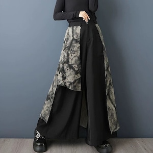 アシンメトリックにあしらわれた柄生地のフラップ飾りがお洒落な、ブラックのワイドレッグパンツです。ウエストは後ろがゴムなので、履き心地が良いです。ロングスカートのようなAラインのシルエットが美しいアイテムです。