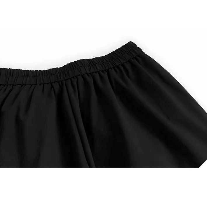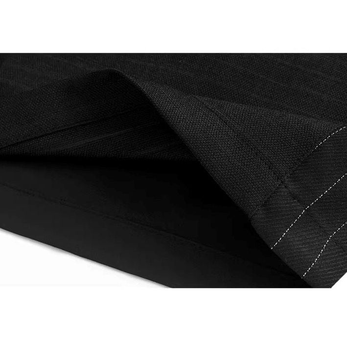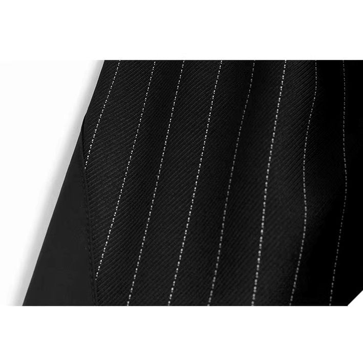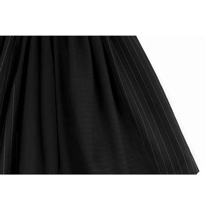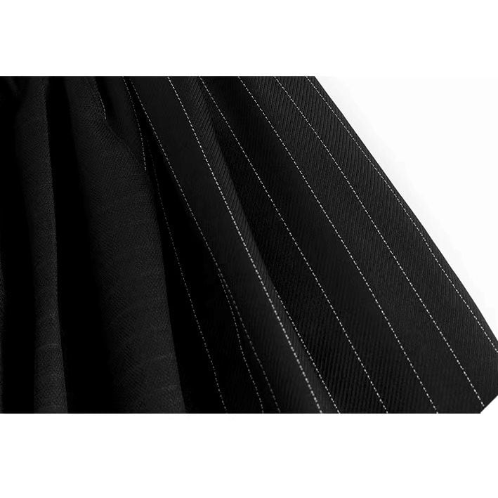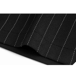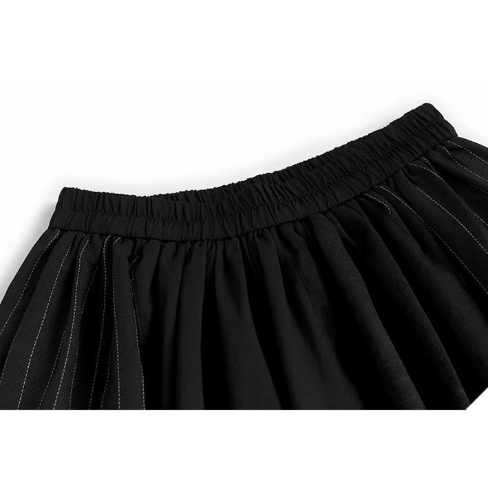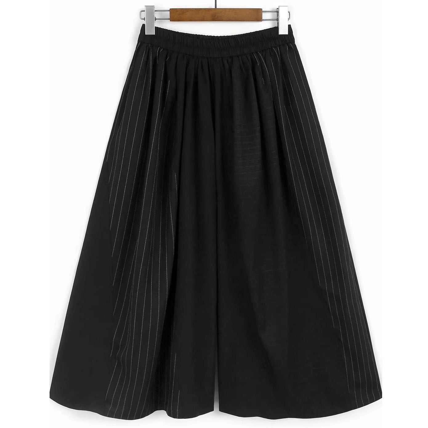 スーツのようなストライプの生地のスティッチデザインがクールな、ブラックのワイドレッグ・クロップドパンツです。ウエストはゴムなので、着脱が簡単で履き心地が良いです。ロングスカートのようなAラインのシルエットが魅力的なアイテムです。