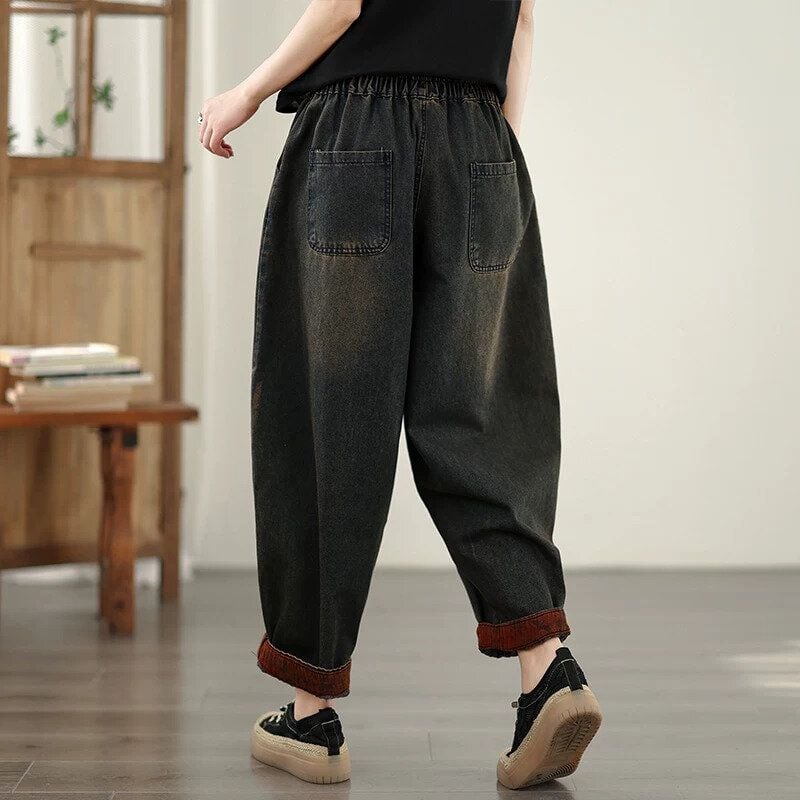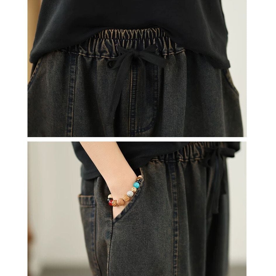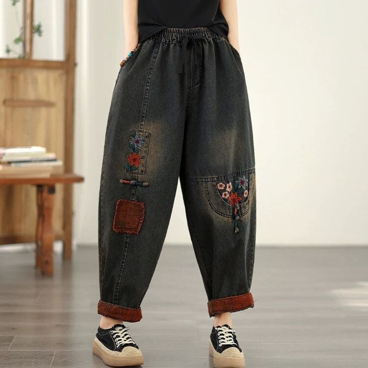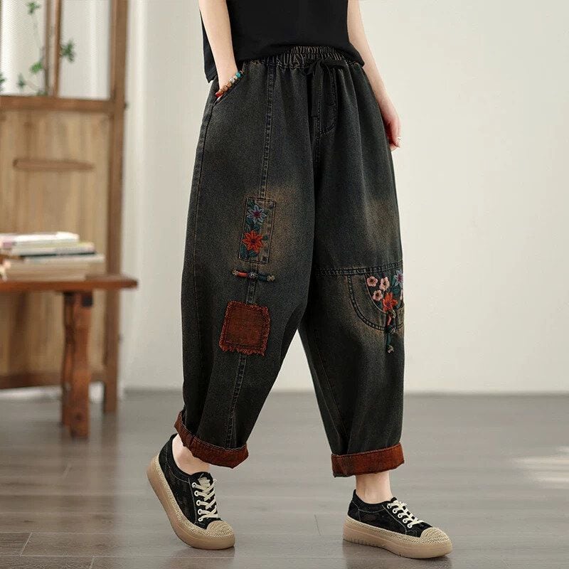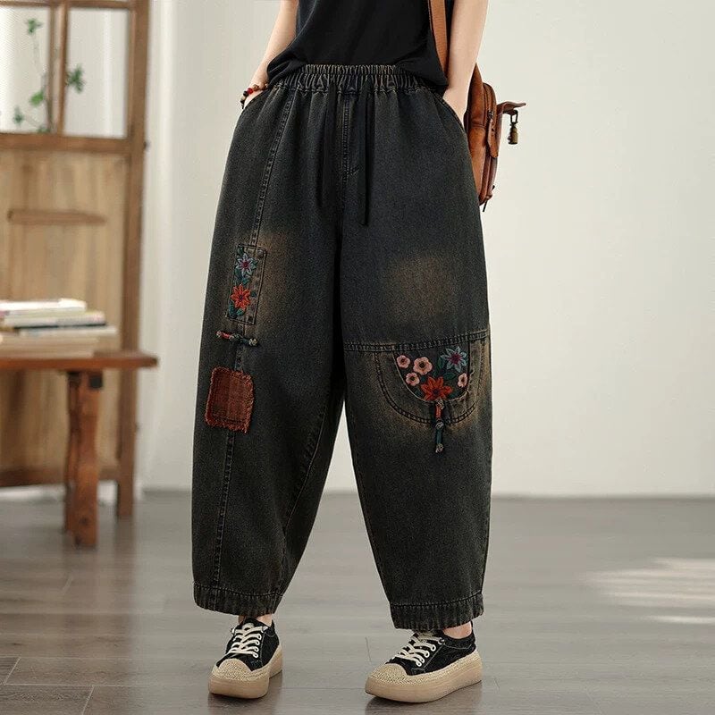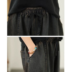 EMBROIDERED ELASTIC WAIST CROPPED DESIGN DENIM PANTS 1color M-15959
