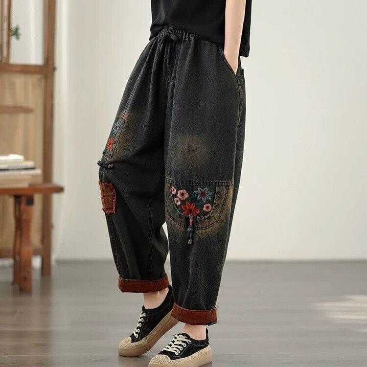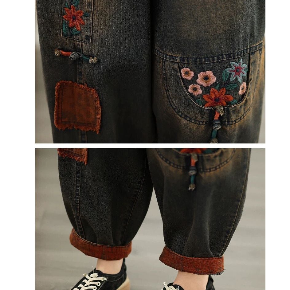 アシンメトリックに施されたお花の刺繍やチャイナ風留め具飾りがキュートな、ワイドレッグ・クロップド・デニムパンツです。ウエストはゴム+ドローストリングで、履き心地が良いです。どんなトップスとも合わせやすい、コーディネートのアクセントになるカジュアルアイテムです。