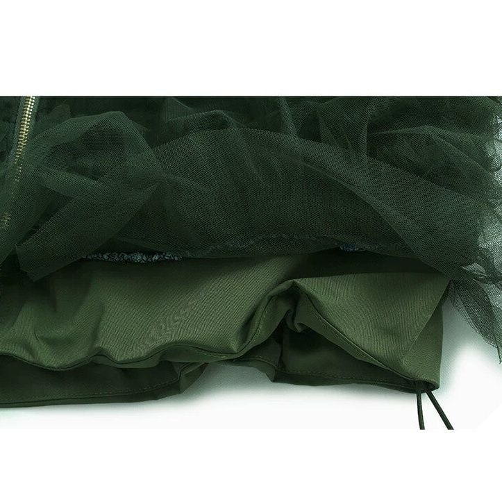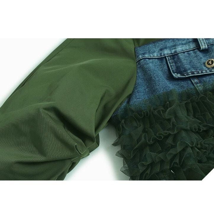 デニムのスティッチやメッシュ素材のフリル飾りが目を惹く、Vネック・長袖・ドローコードヘムのデザインジャケットです。ネックの後ろまで伸びたジップラインがユニークな、コーディネートの主役になるアイテムです。色は3色から選べます。