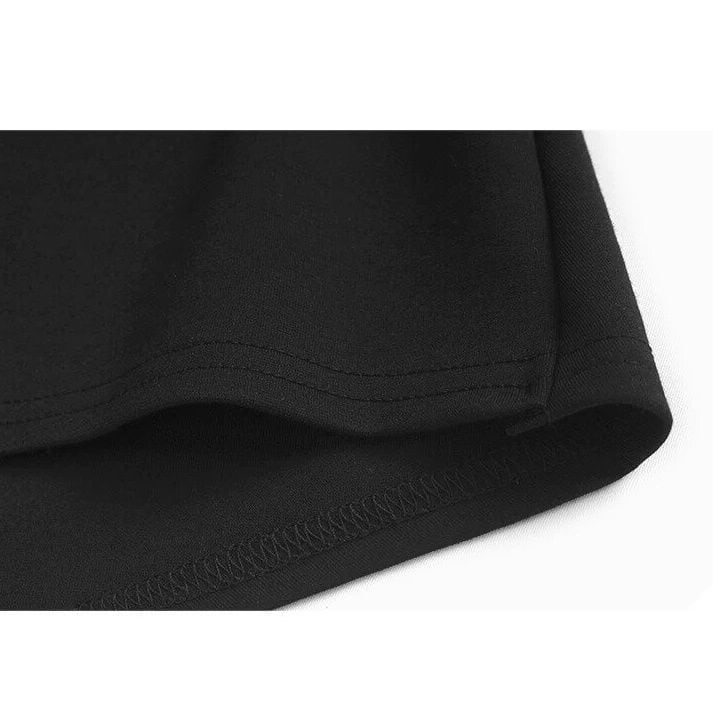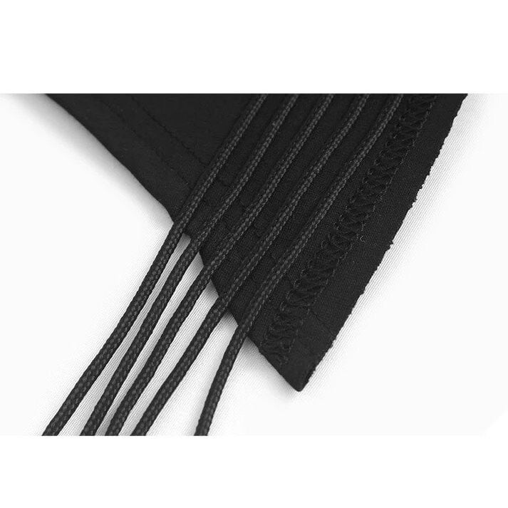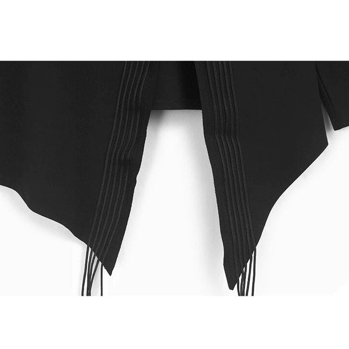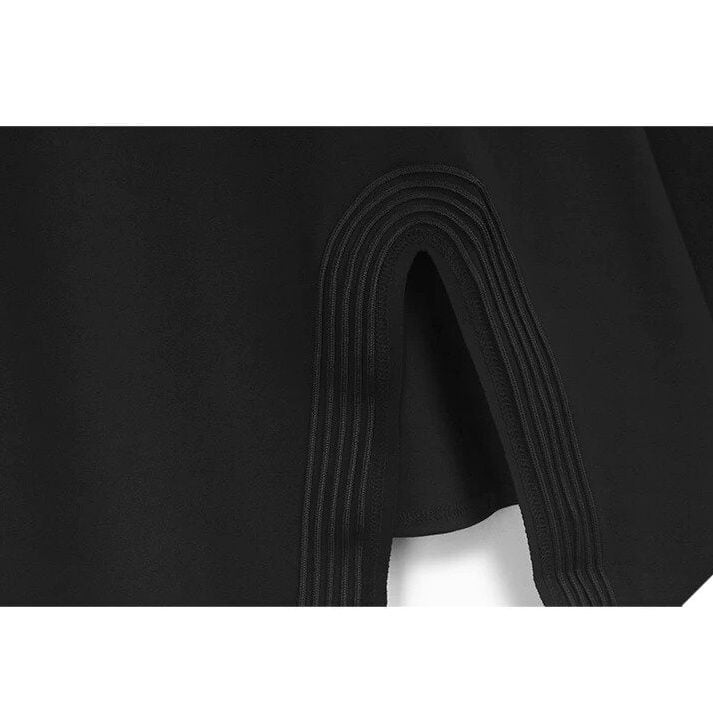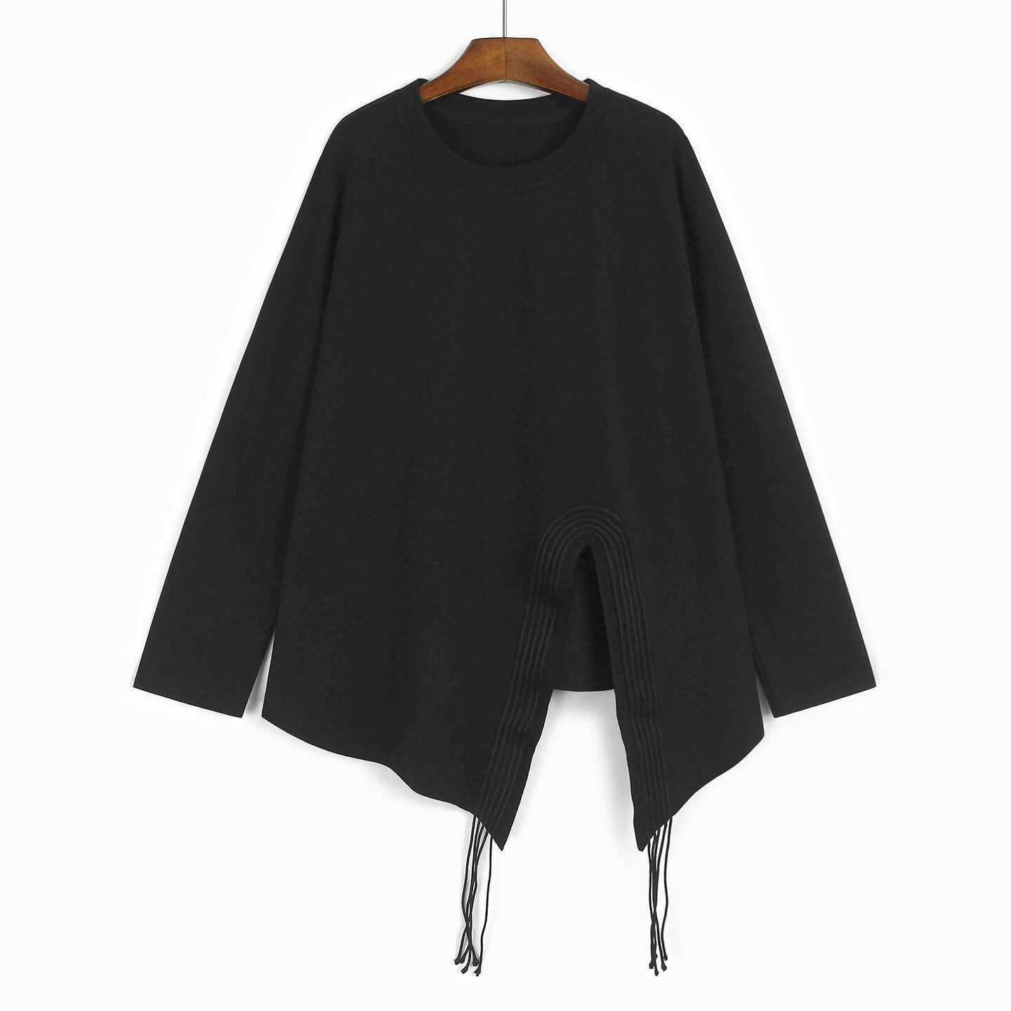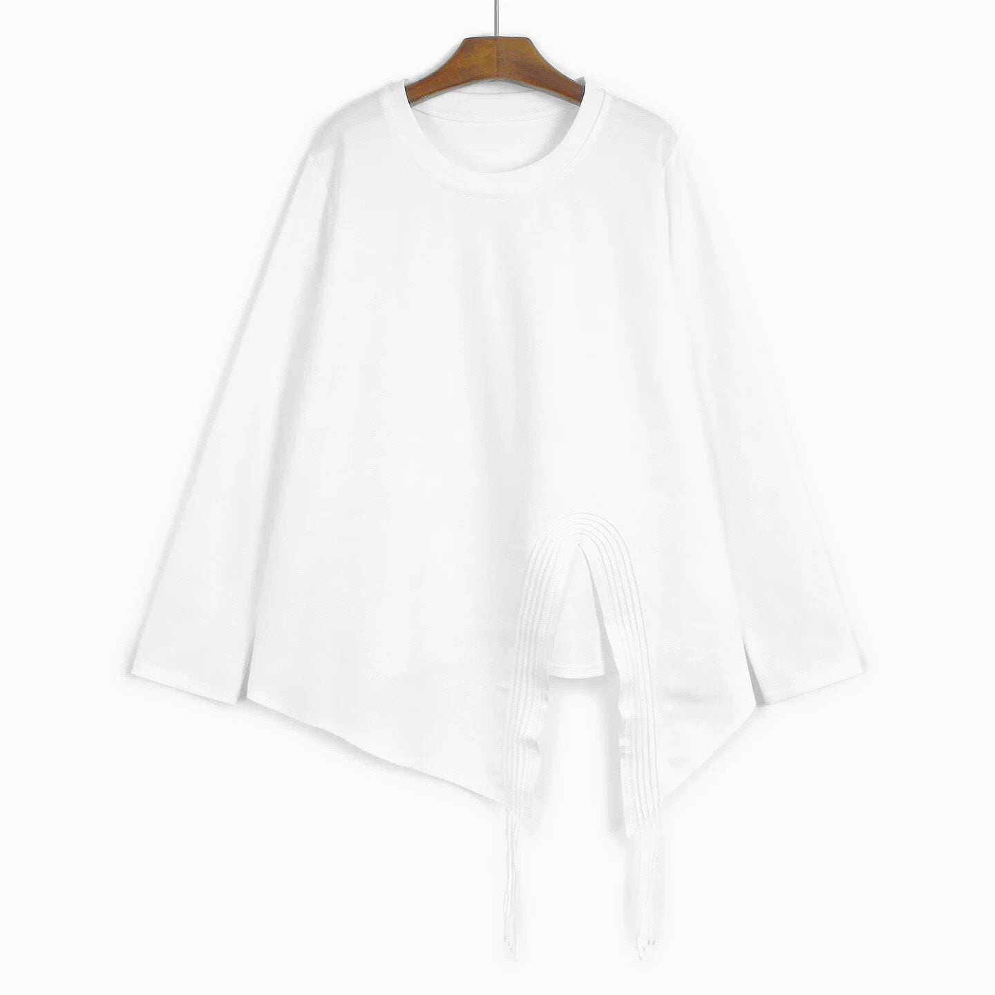 5本のひもで縁取られたフロントのスリットがアクセントになった、ラウンドネック・イレギュラーヘムの長袖Tシャツです。Aラインのシルエットがウエストをカバーする、単色で合わせやすいアイテムです。色はブラックとホワイトの2色から選べます。