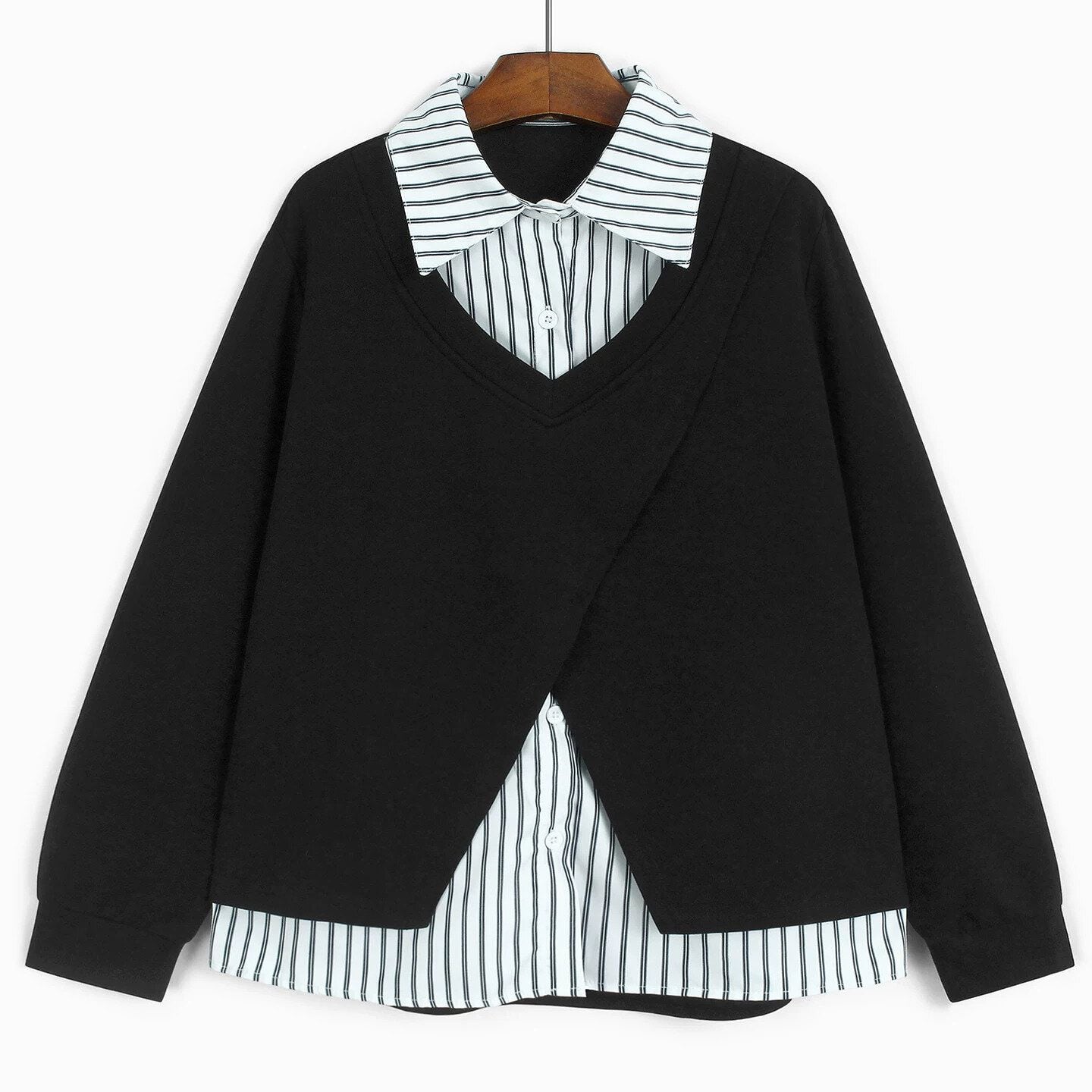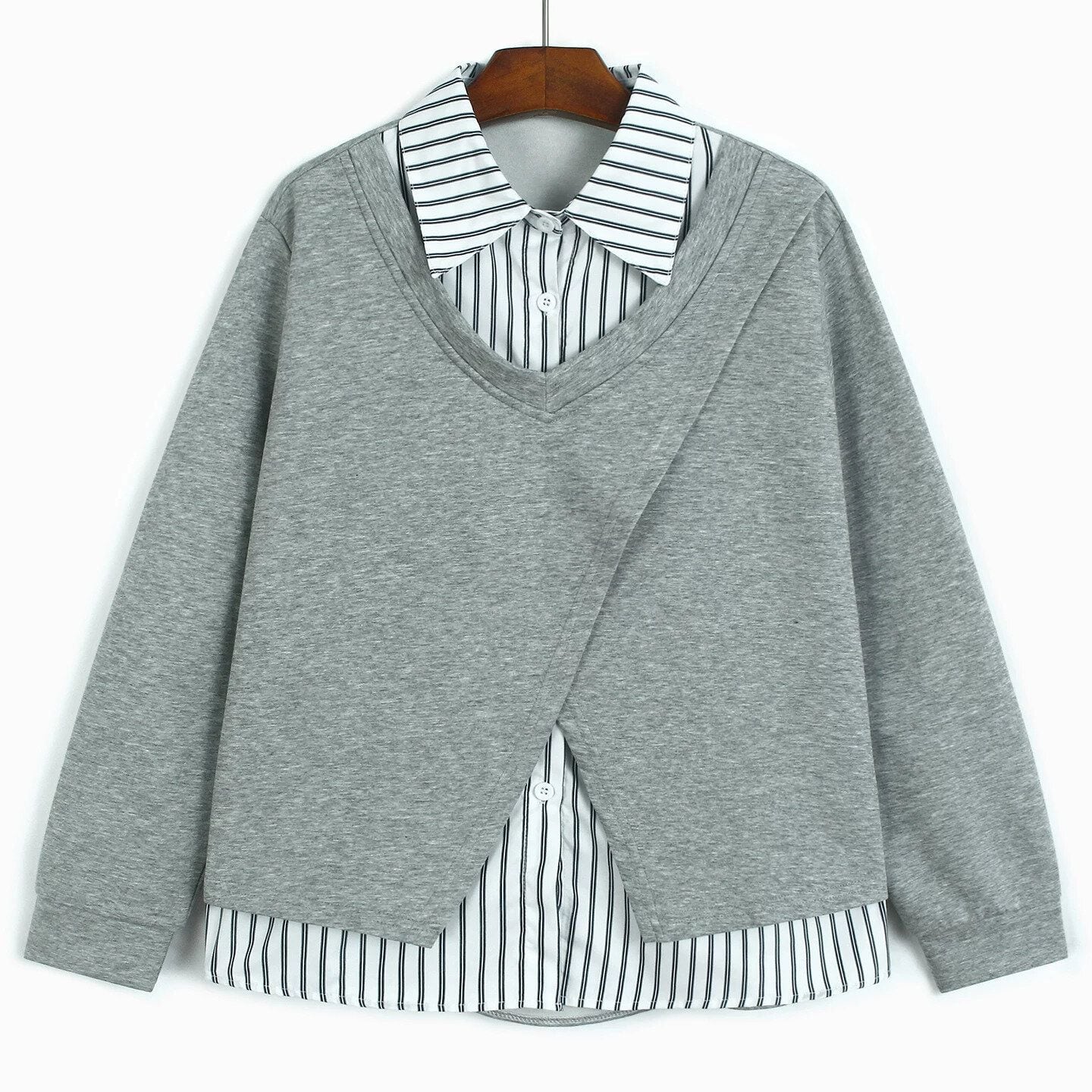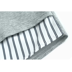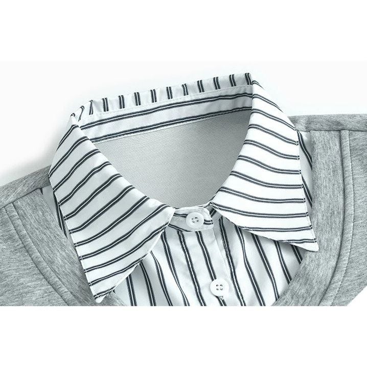 Vネックのスウェットシャツとストライプシャツを合わせたフェイクツーピースデザインがお洒落な、ポロ襟・長袖・ストレートカットのデザイントップです。落ち着いた色味でどんなボトムスとも合わせやすい、清潔感のあるカジュアルアイテムです。色は3色から選べます。