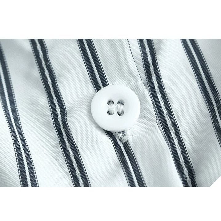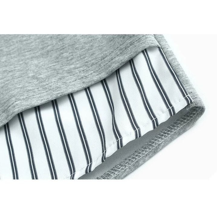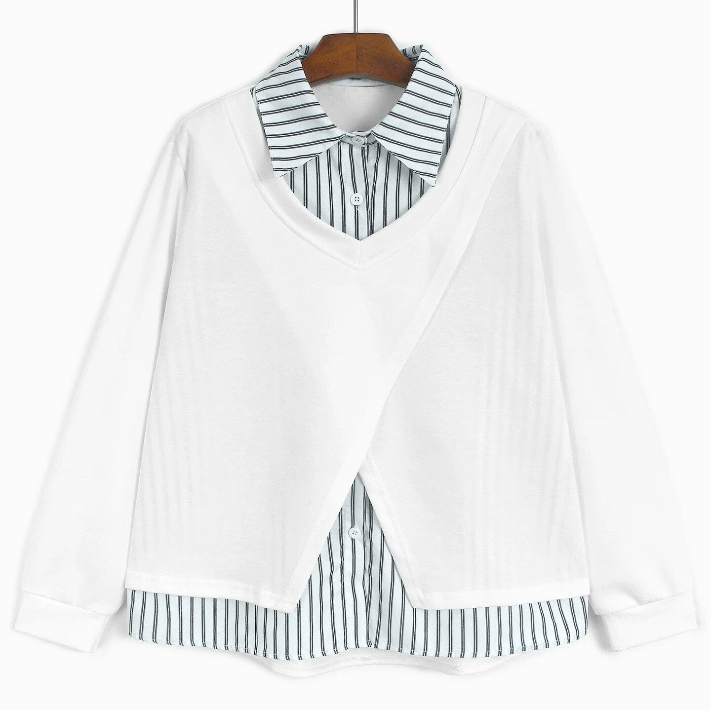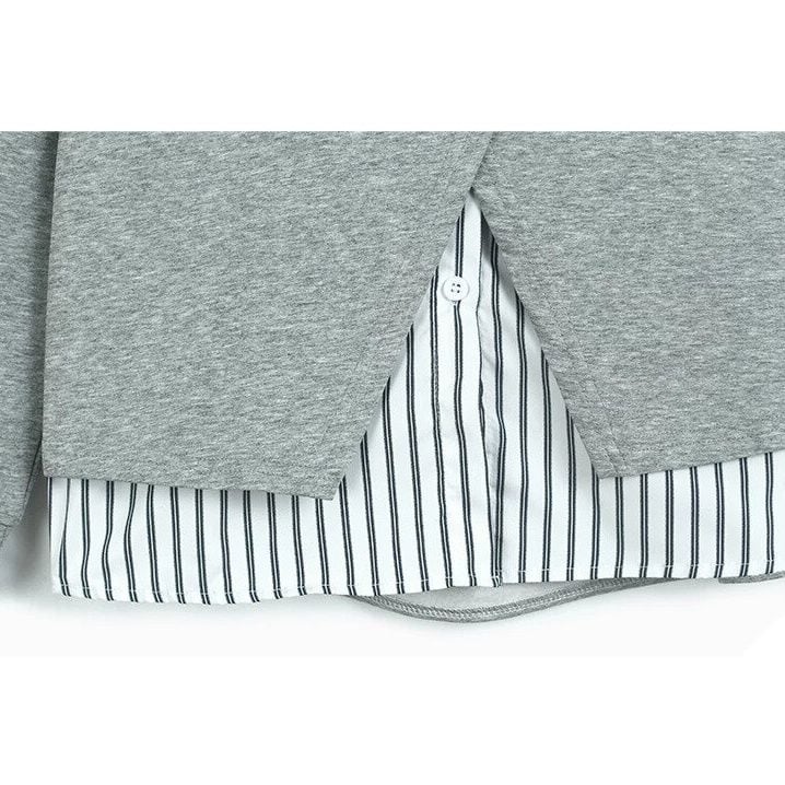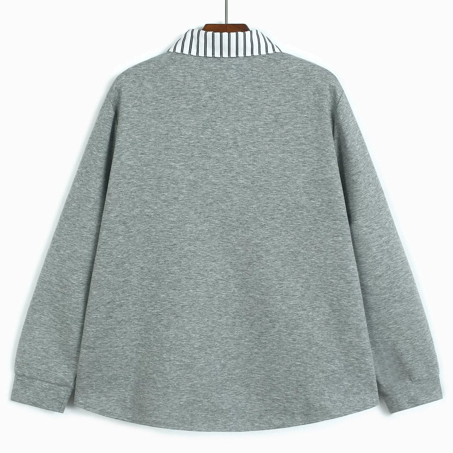 Vネックのスウェットシャツとストライプシャツを合わせたフェイクツーピースデザインがお洒落な、ポロ襟・長袖・ストレートカットのデザイントップです。落ち着いた色味でどんなボトムスとも合わせやすい、清潔感のあるカジュアルアイテムです。色は3色から選べます。