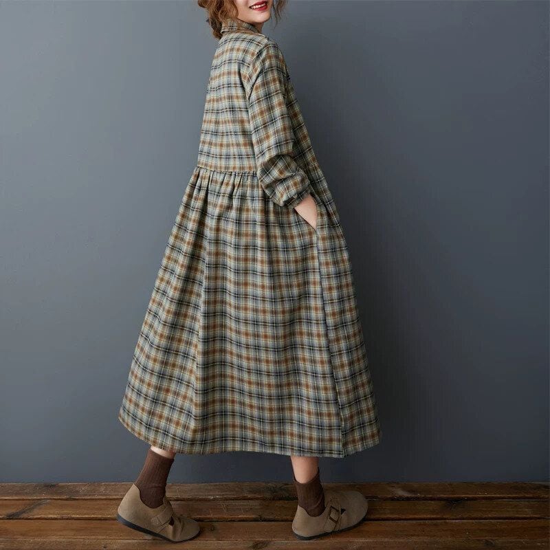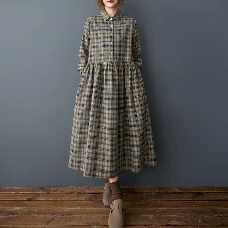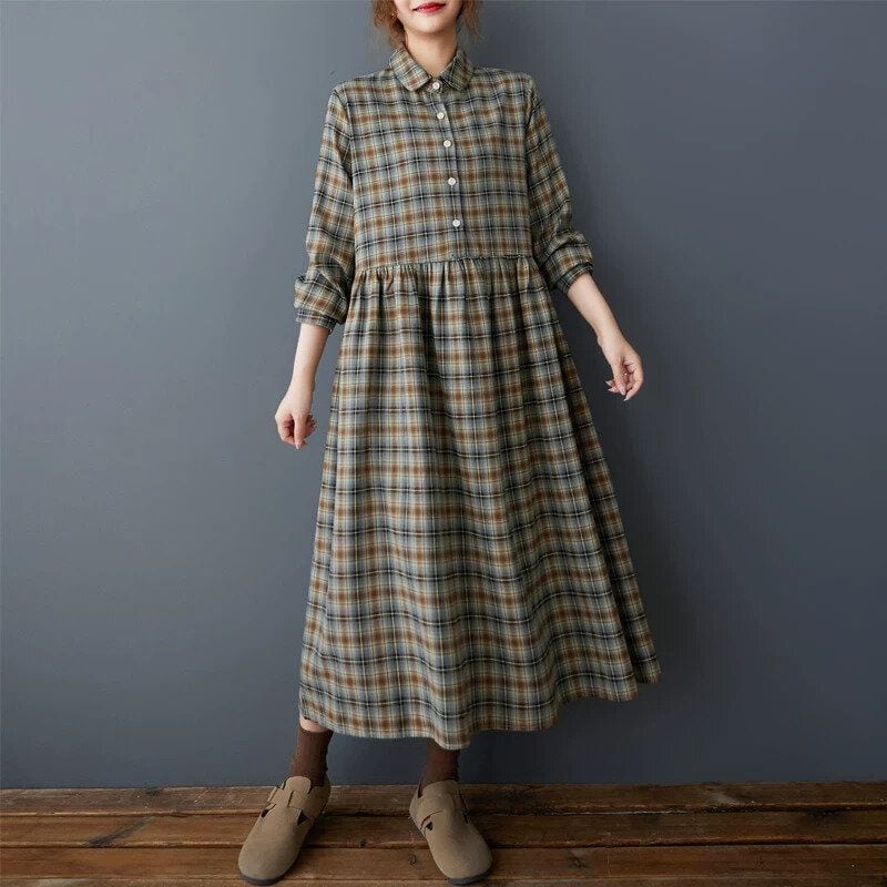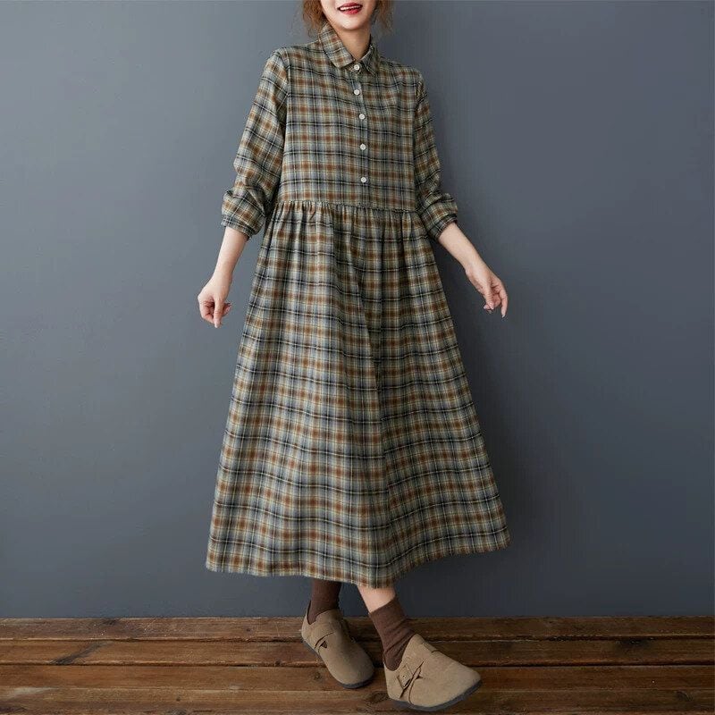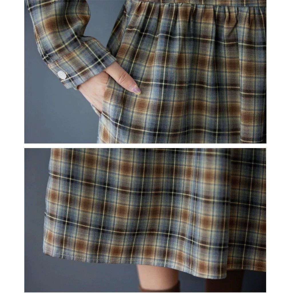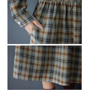 レトロなチェック柄がお洒落な、ポロ襟・長袖・ミドル丈のシャツワンピースです。ハーフボタンで、ウエストの高い位置の切り返しにギャザーの入ったシルエットが魅力的なカジュアルアイテムです。