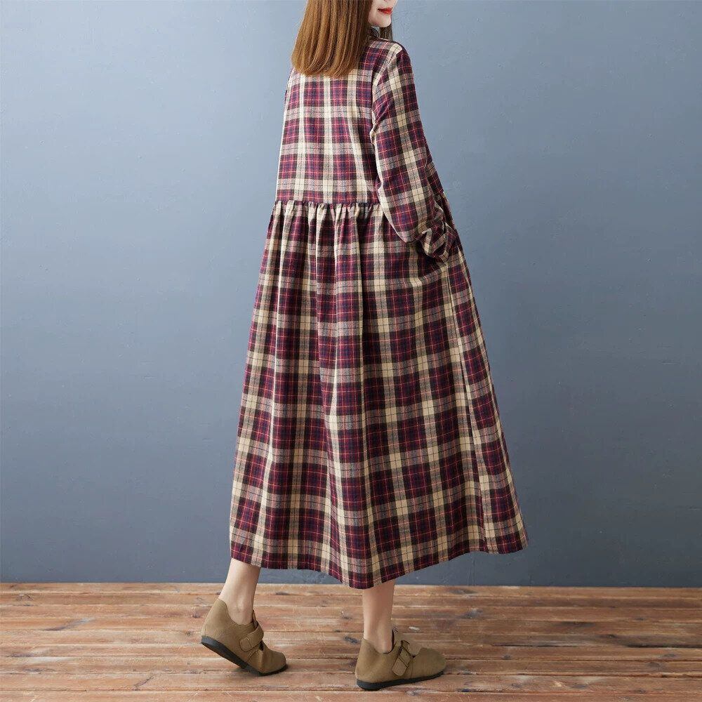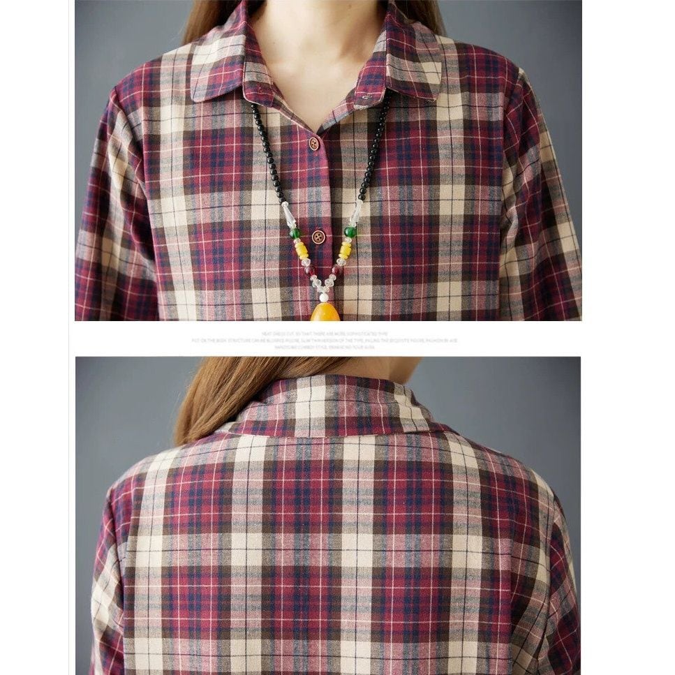 CHECKERED HALF BUTTON MIDI SHIRT DRESS 1color M-15974