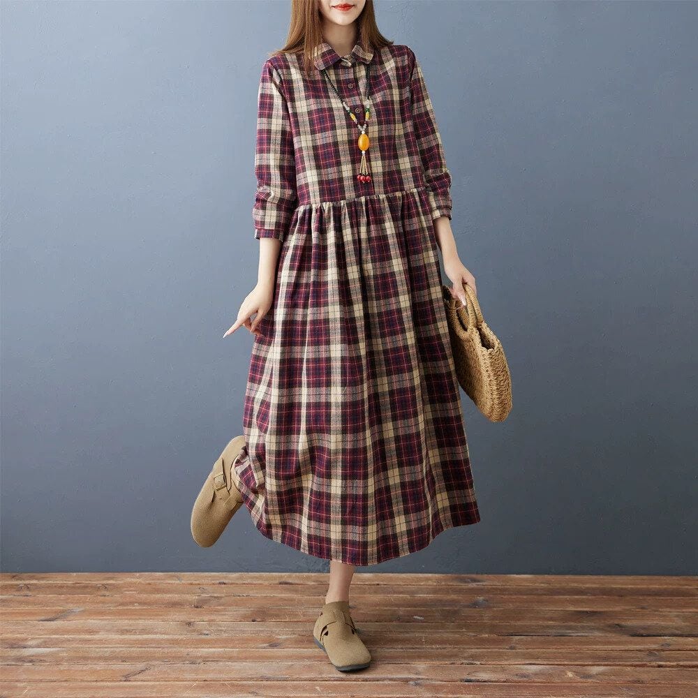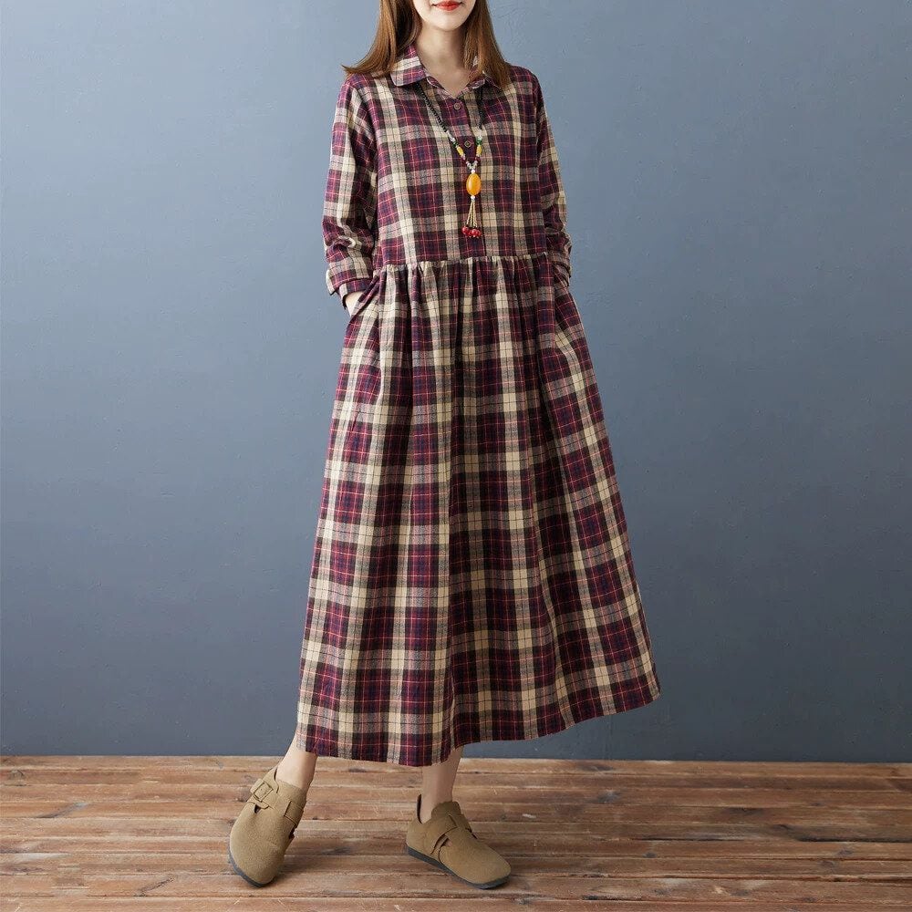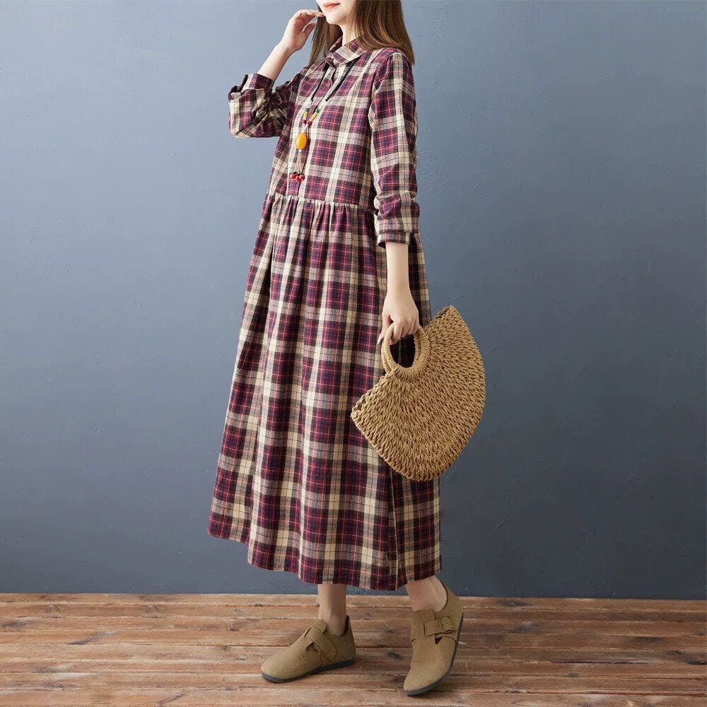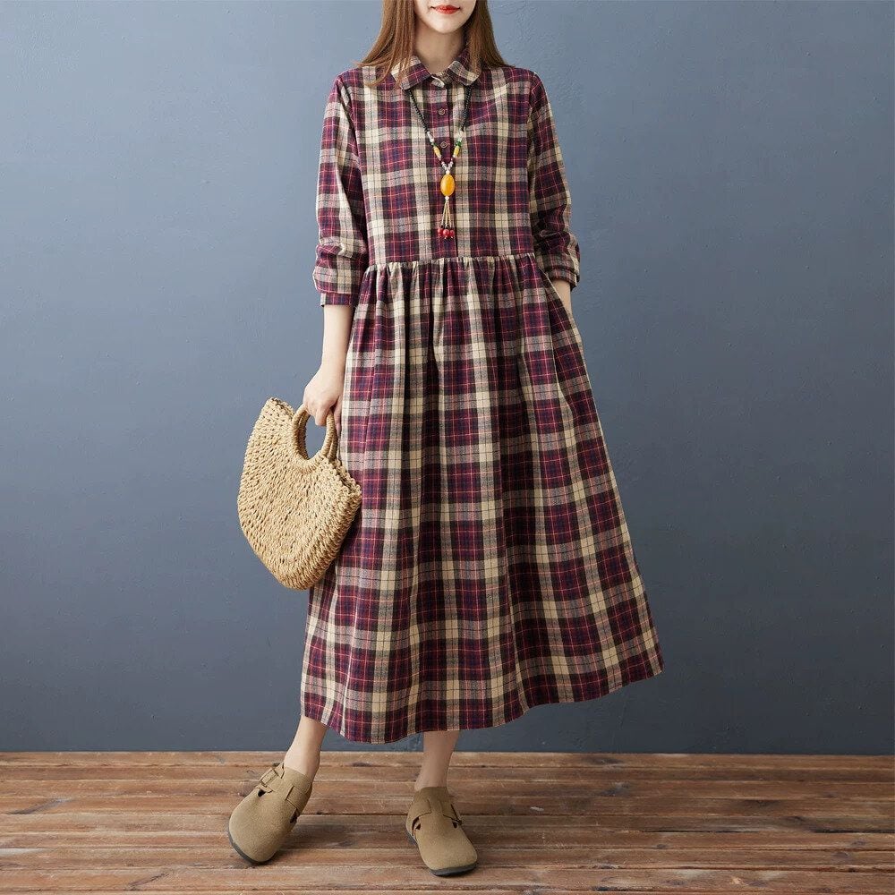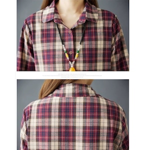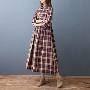 赤紫のオーバーチェック柄がお洒落な、ポロ襟・長袖・ミドル丈のシャツワンピースです。ハーフボタンで、ウエストの高い位置の切り返しにギャザーの入ったシルエットが魅力的なカジュアルアイテムです。