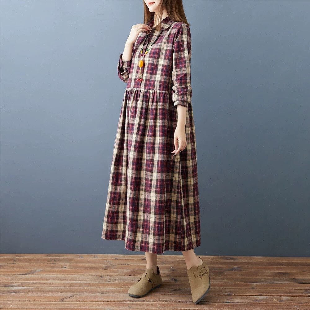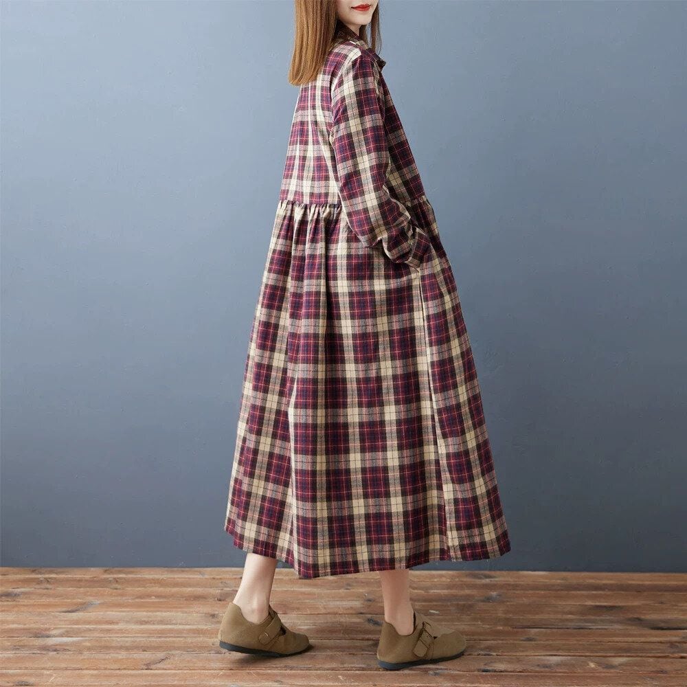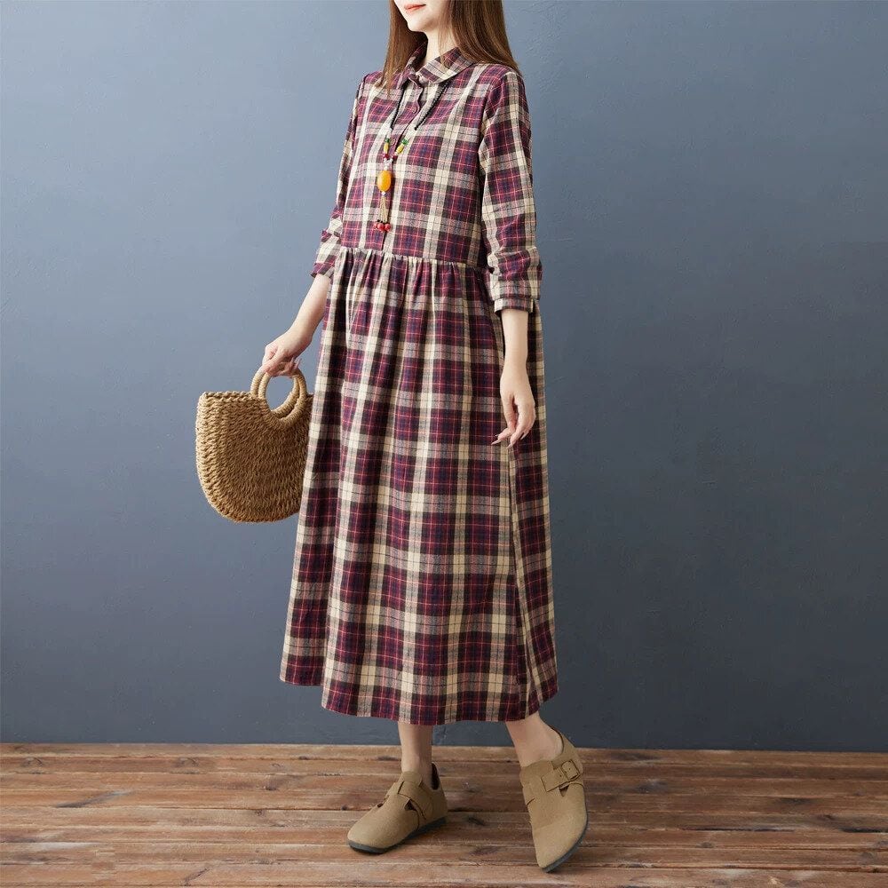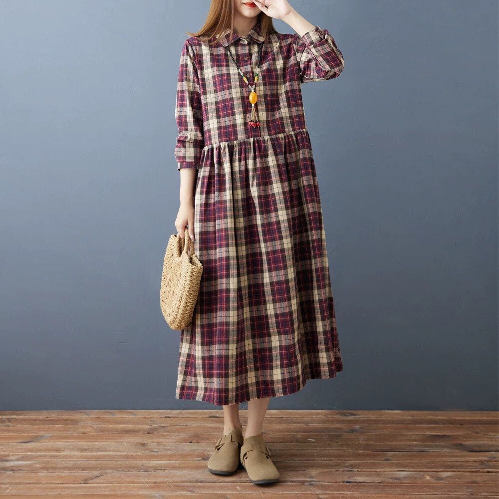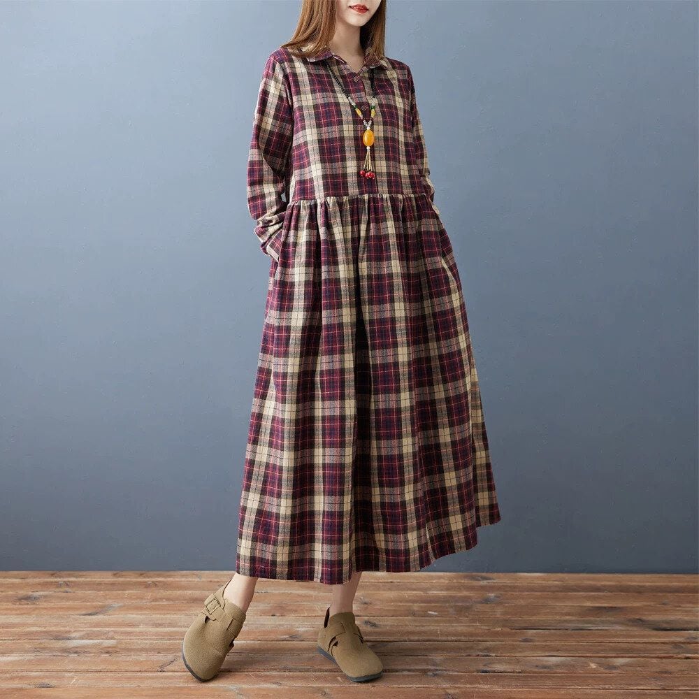 赤紫のオーバーチェック柄がお洒落な、ポロ襟・長袖・ミドル丈のシャツワンピースです。ハーフボタンで、ウエストの高い位置の切り返しにギャザーの入ったシルエットが魅力的なカジュアルアイテムです。