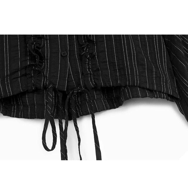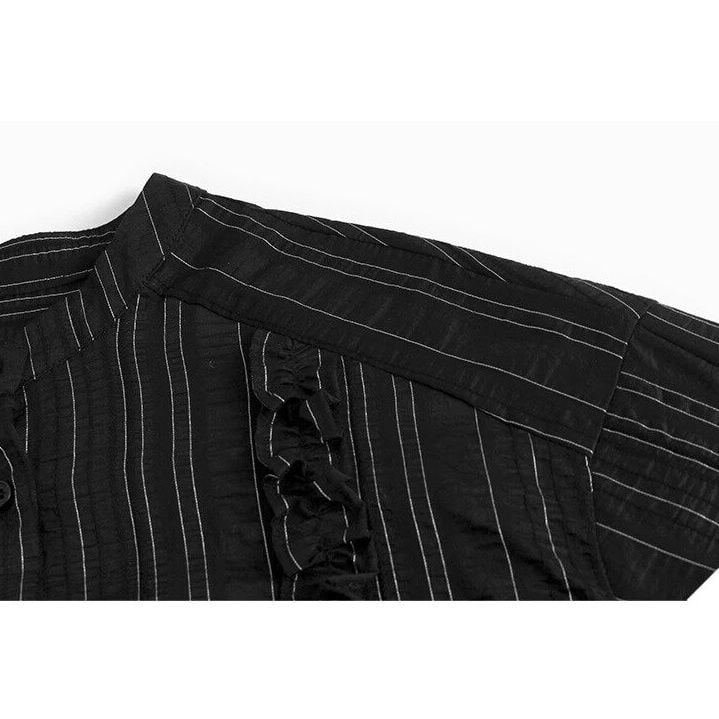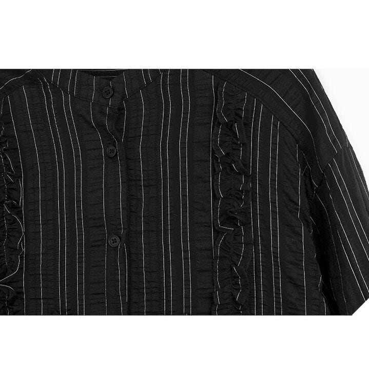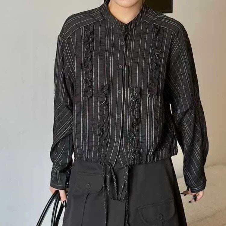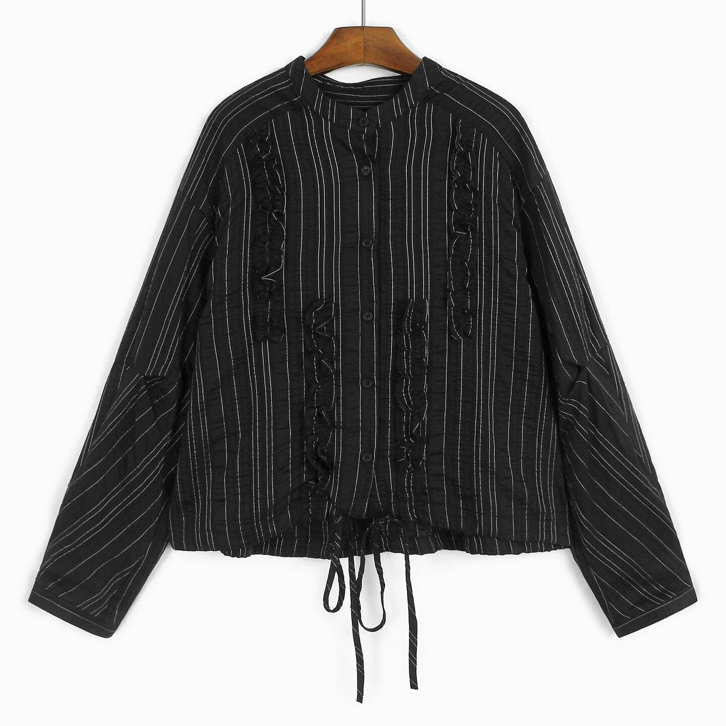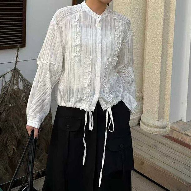 デザインストライプにフリルラインの飾りがお洒落な、スタンドカラー・長袖・シャツブラウスです。短めの裾にはドローストリングが付いて、シルエットを調節できます。オンでもオフでも使える上品な印象のアイテムです。色はブラックとホワイトの2色から選べます。