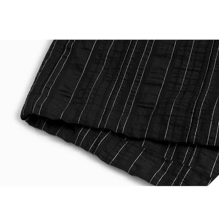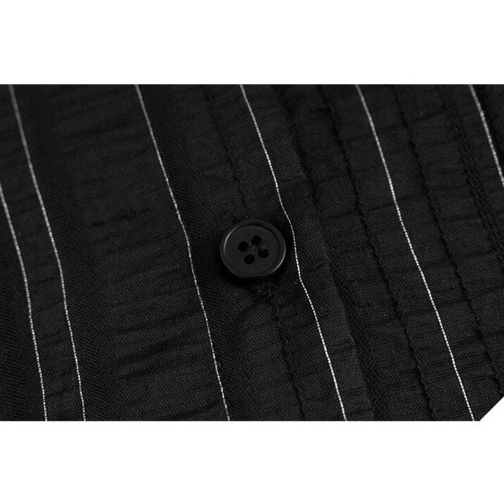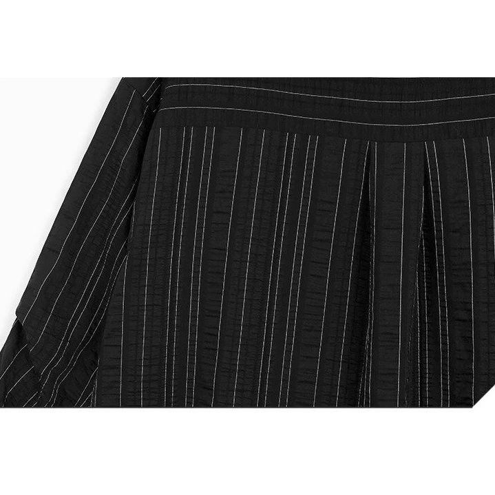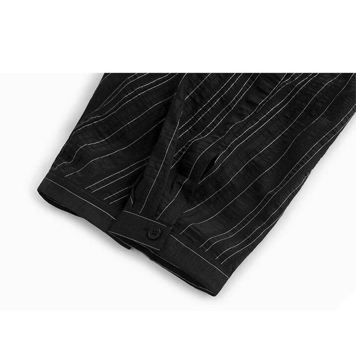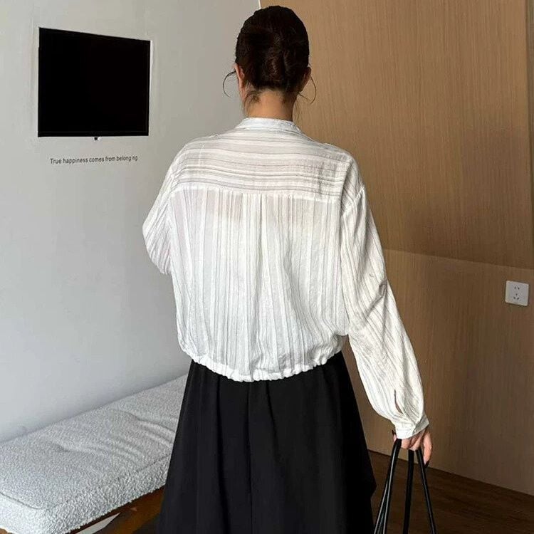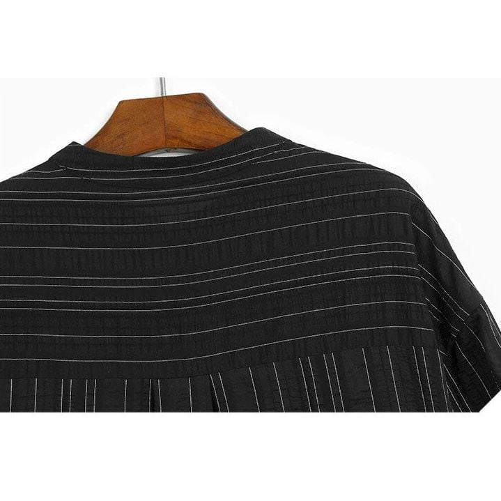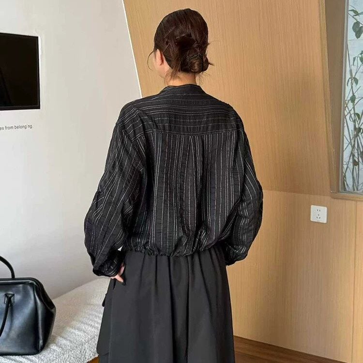 STRIPE STAND COLLAR DRAW STRING HEM SHIRT BLOUSE 2colors M-15978