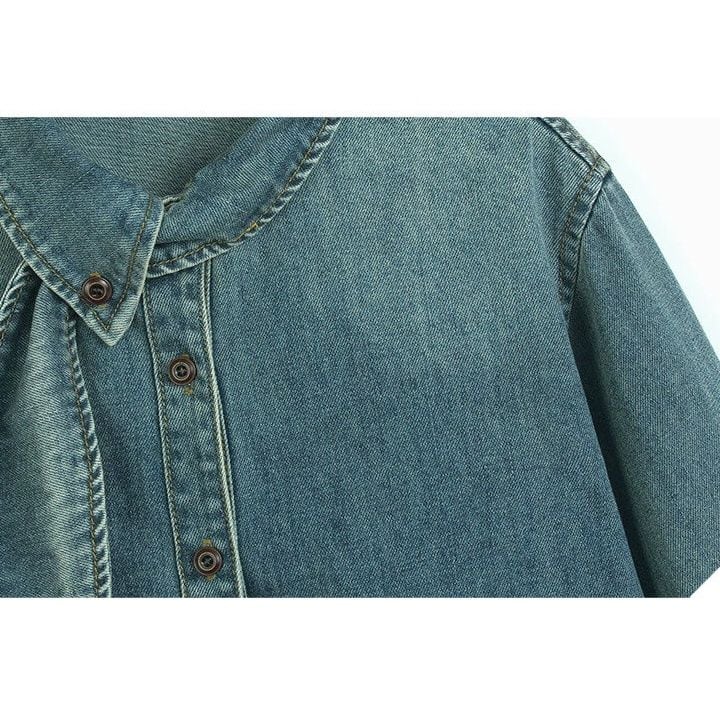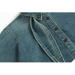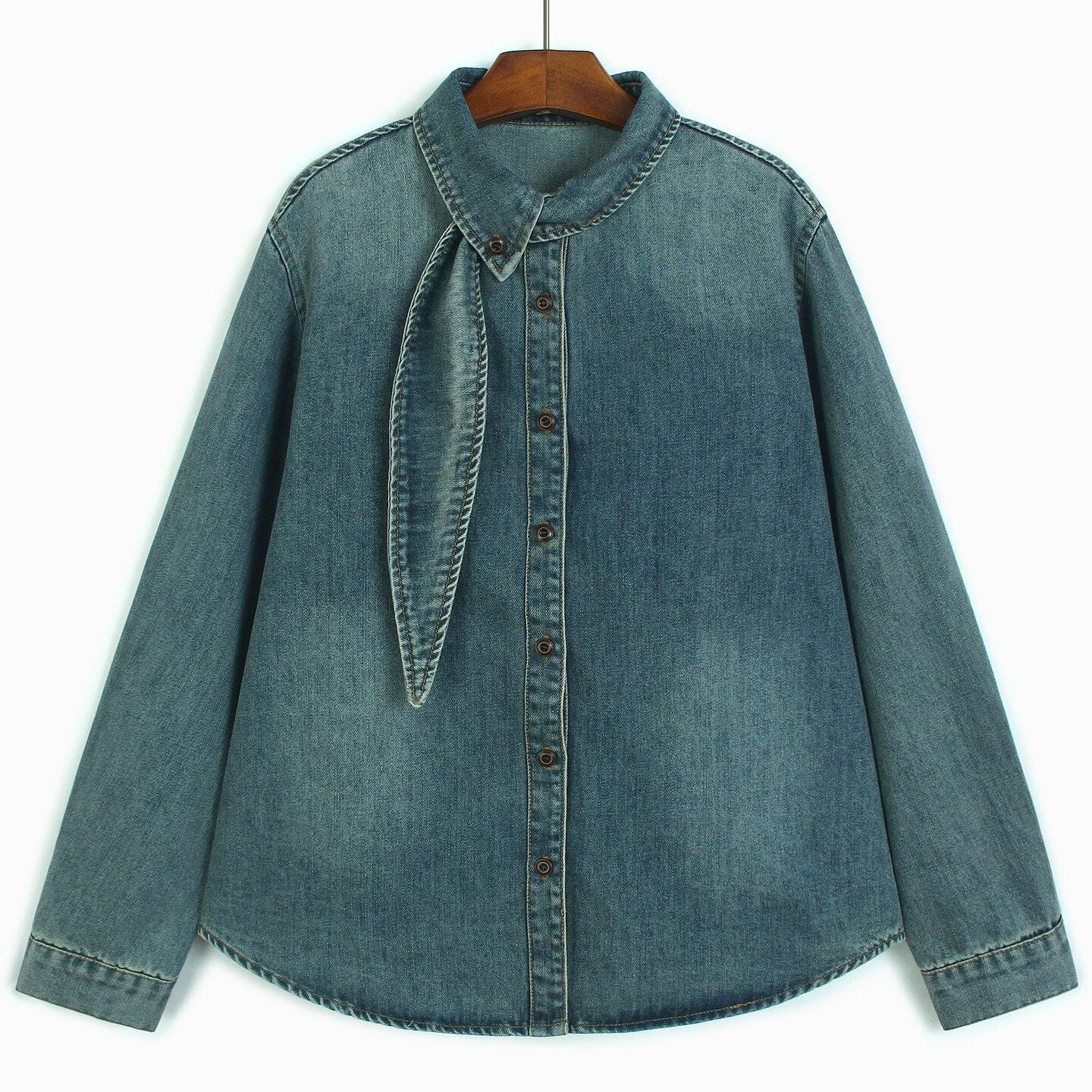 アシンメトリックなデザインの襟がキュートな、長袖・ラウンドカットのデニムシャツです。色落ち加工がお洒落な、ゆったりとしたシルエットのカジュアルアイテムです。色はライトブルーとダークブルーの2色から選べます。