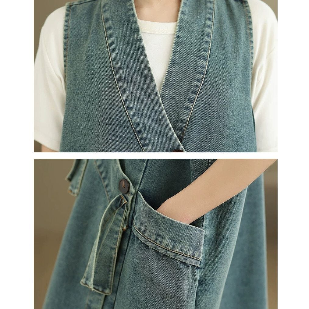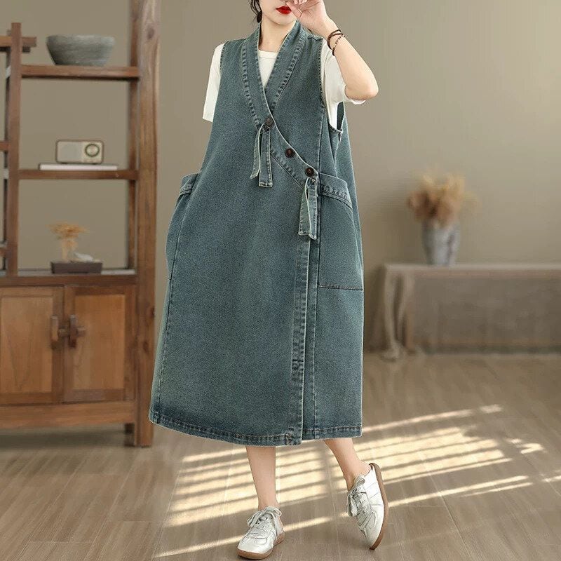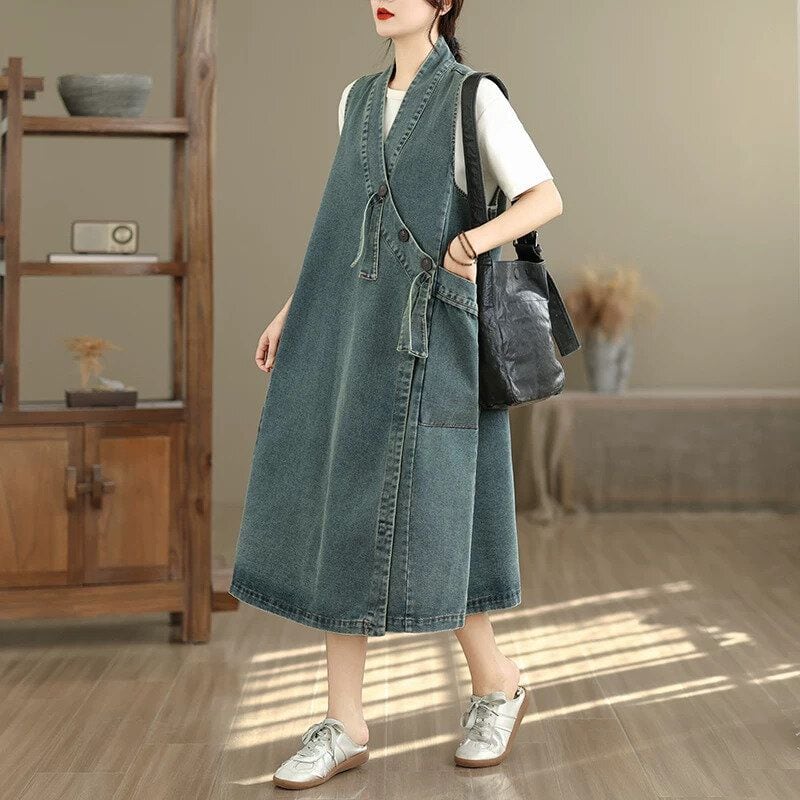 V-NECK A-LINE MIDI DENIM JUMPER DRESS 1color M-15981