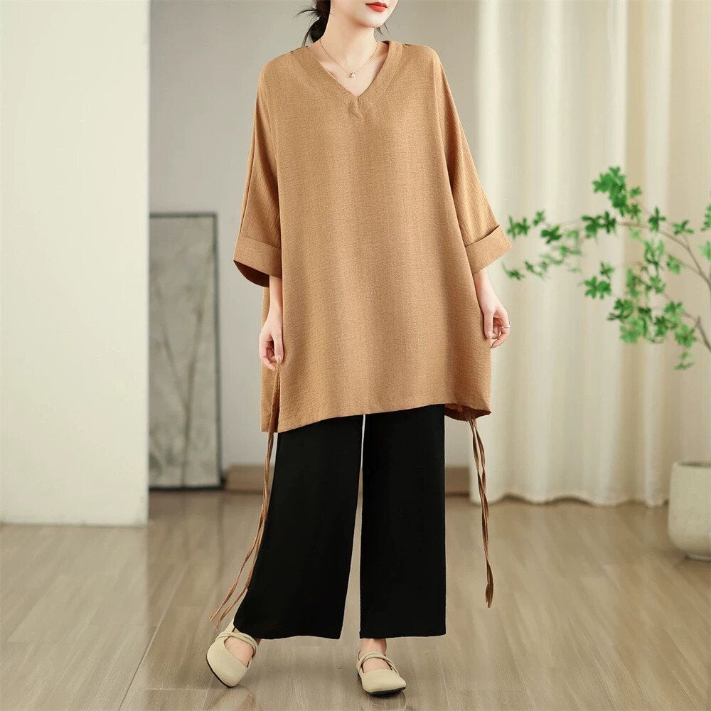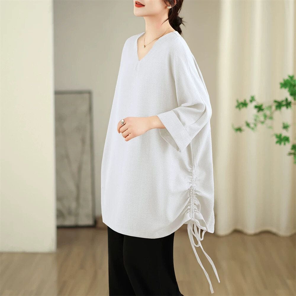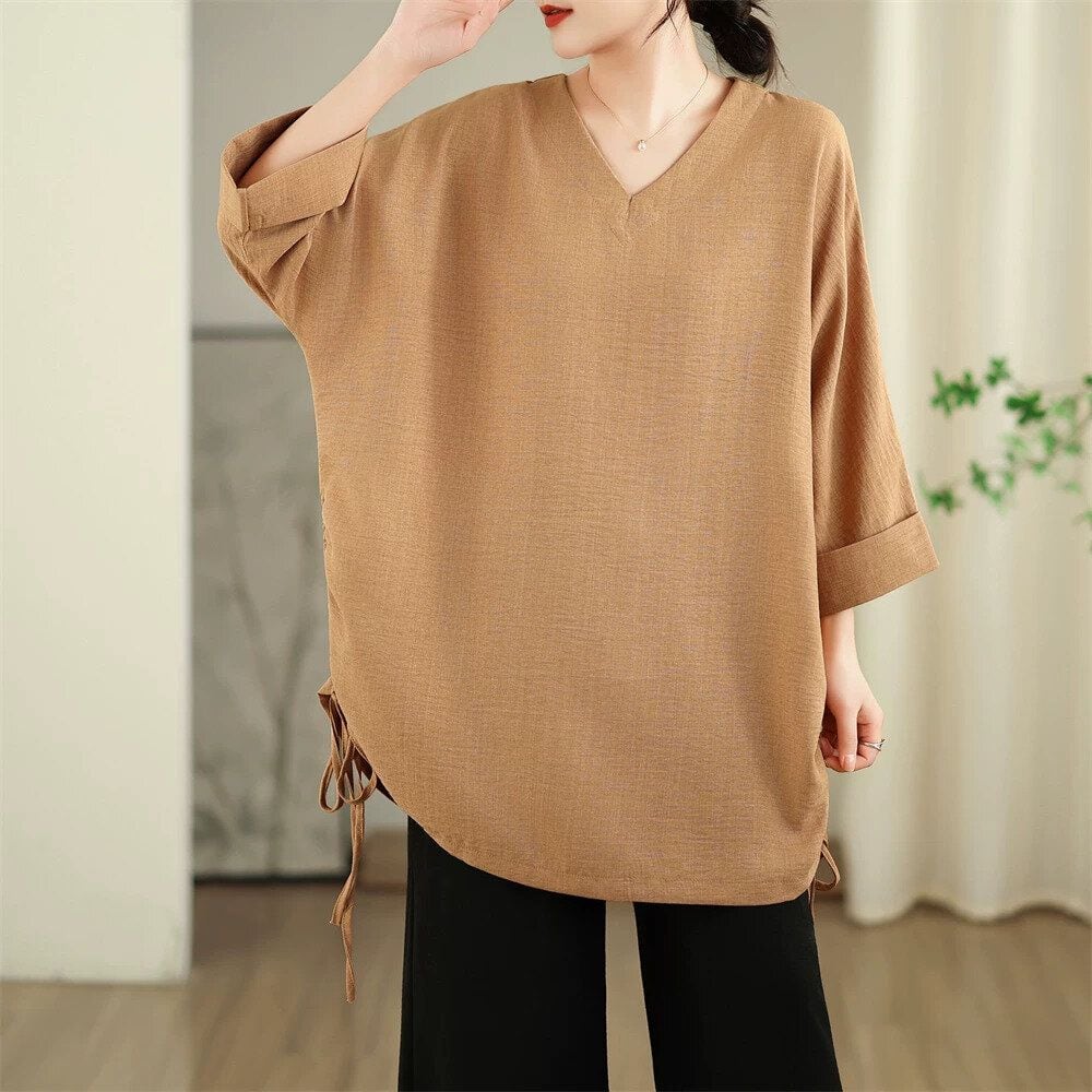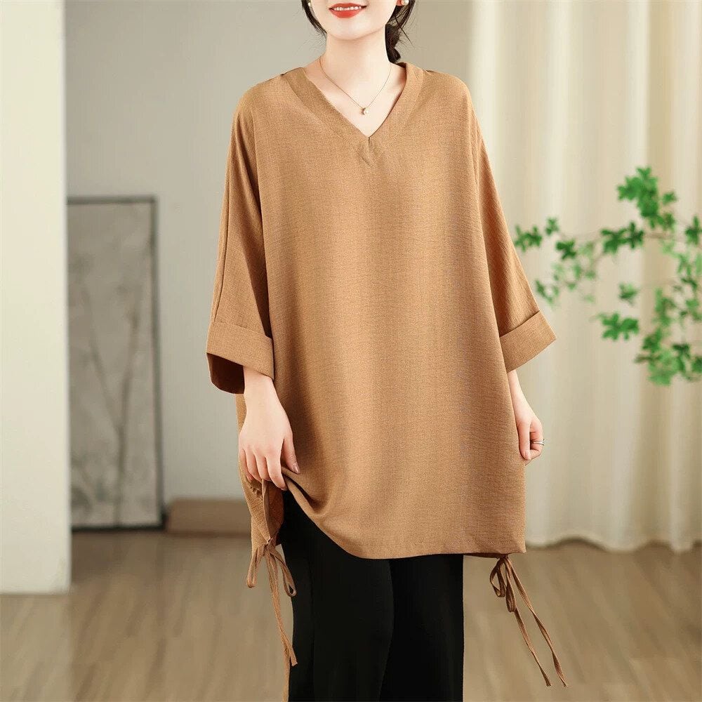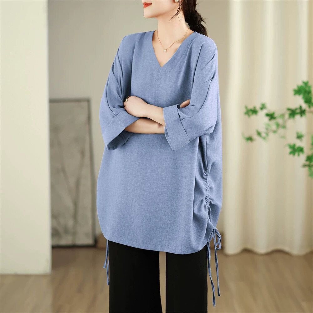 さらりと滑らかな単色素材でできた、Vネック・7分袖・チュニック丈のプルオーバーデザイントップです。ゆったりとしたオーバーサイズで、サイドのドローストリングでシルエットをアレンジできます。色は4色から選べます。 SIZE:※測り方によって2-3cmの差が生じる場合がございます。 【FREE SIZE】バスト140cm 裄丈52cm 着丈80cm COLOR:White、Black,、Blue、Khaki 素材:ポリエステル、その他 モデル着用サイズ:L モデル情報:身長161cm 体重49kg STYLE CALENDAR:春◎ 夏◎ 秋〇 冬△ お届けについて こちらの商品は海外店舗より直接発送となる為、 ご決済から到着までは、多くの場合【10日-2週間前後】でお届けしております。 ※在庫状況や輸送の混雑により、4週間前後かかる場合がございます。 注意事項 ・商品在庫切れにより注文キャンセルとさせていただく恐れもございますので、予めご了承くださいませ。 ・仕入れ工場を変えることがあるため、記載サイズと若干異なる場合がございます。 ・商品の色味は、お手持ちのスマートフォンの画面によって実物と若干異なる場合がございます。 ・イメージ違いやサイズ交換等、お客さまご都合による交換・返品はご遠慮ください。 送料について 全国一律580円(沖縄県は1,500円) ※10,000円以上のご注文で沖縄県を含む全国送料無料。 お支払い方法について ・クレジットカード決済(VISA/Mastercard/JCB/アメリカン・エクスプレス/ Diners Club) ・コンビニ決済/Pay-easy ※前払いのお支払い方法 ・Pay ID あと払い(コンビニ払い、口座振替) ※あと払いのお支払い方法 ・キャリア決済(d払い/au PAY(auかんたん決済)/ソフトバンク・ワイモバイルまとめて支払い) 管理番号:M-15982
