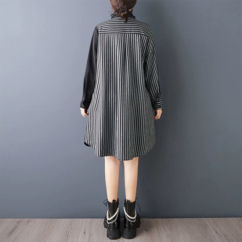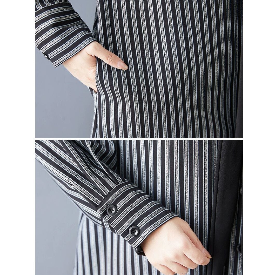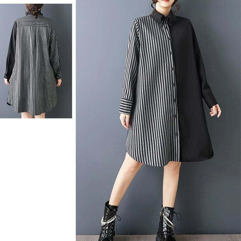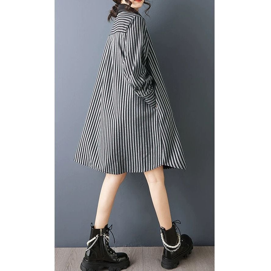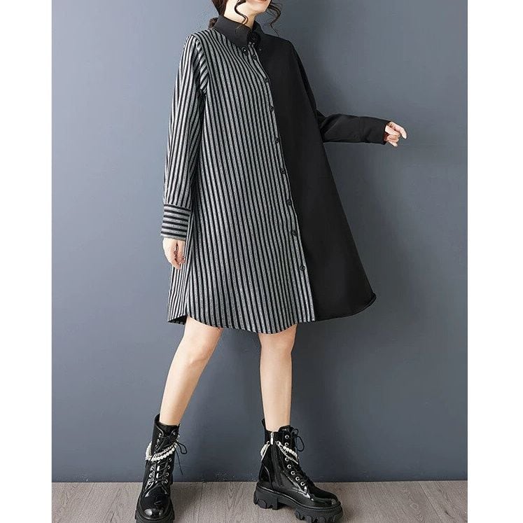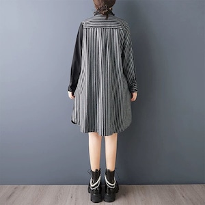 BLACK STRIPE ASYMMETRIC DESIGN A-LINE MINI SHIRT DRESS 1color M-15983