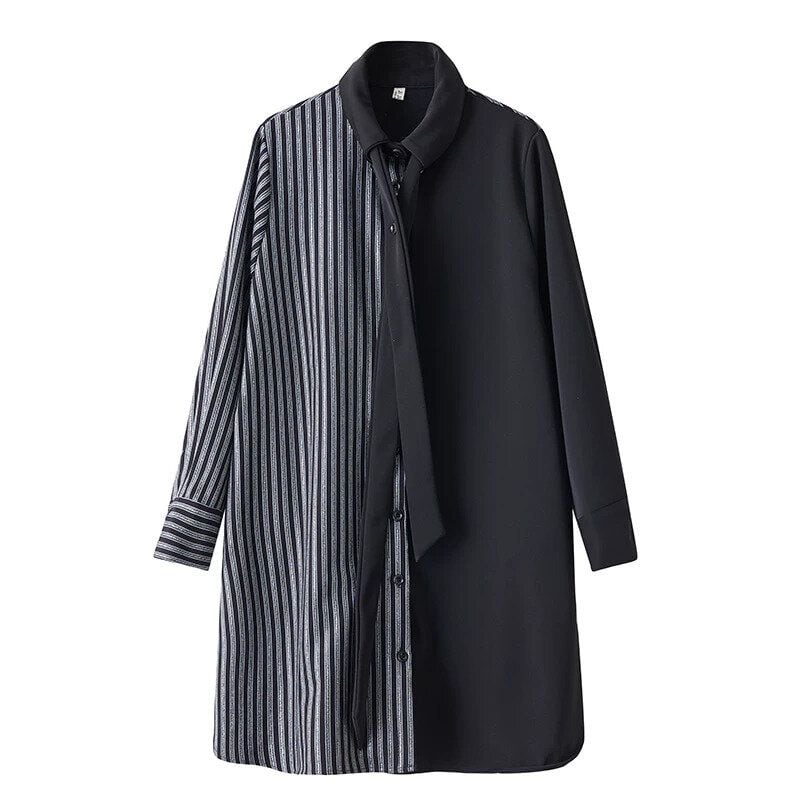 ストライプとブラックの大胆なコントラストスティッチが作るアシンメトリックなフロントのデザインが目を惹く、ボタンダウンカラー・長袖・ミニ丈のシャツワンピースです。長く垂れるタイの付いた、クールでハンサムな印象のカジュアルアイテムです。