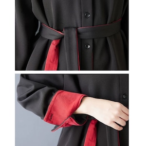 レッドとブラックのコントラストがクールな、ポロ襟・長袖・ひざ丈のシャツワンピースです。ストラップベルトでシルエットをアレンジできる、滑らかな素材で着心地が良いアイテムです。