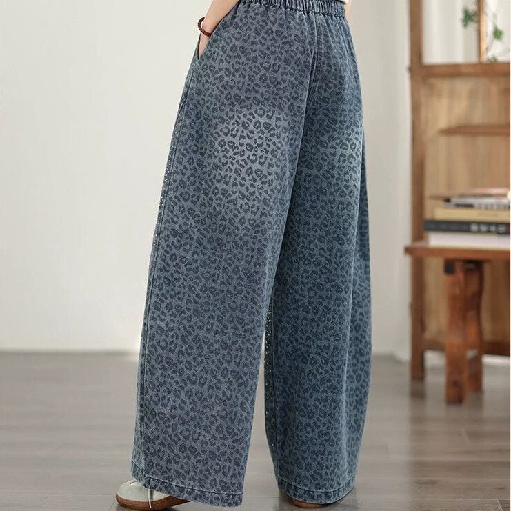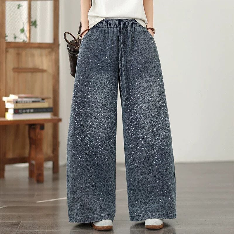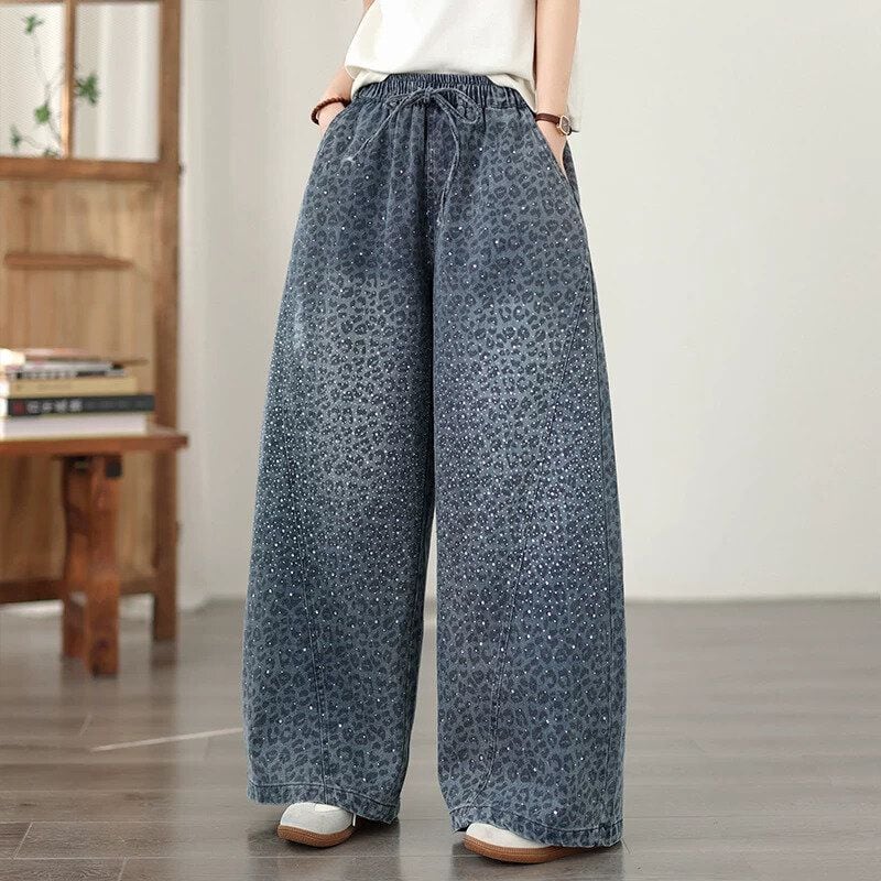 SPARKLING LEOPARD PATTERN DRAWSTRING WAIST WIDE LEG DENIM PANTS 1color M-15995