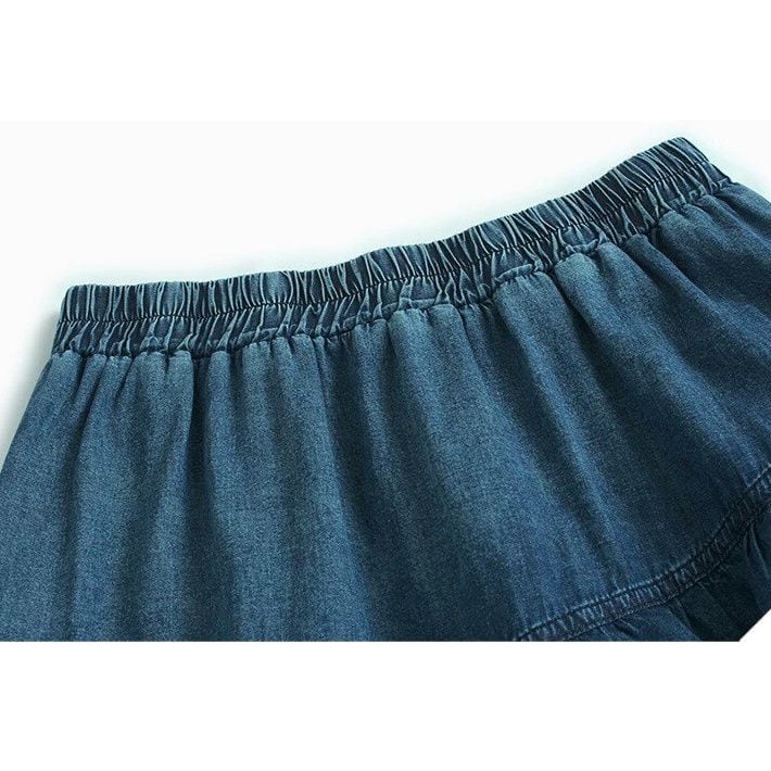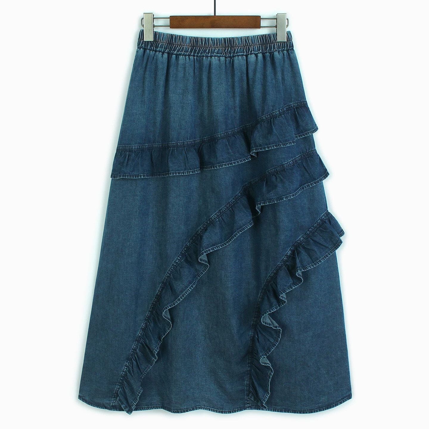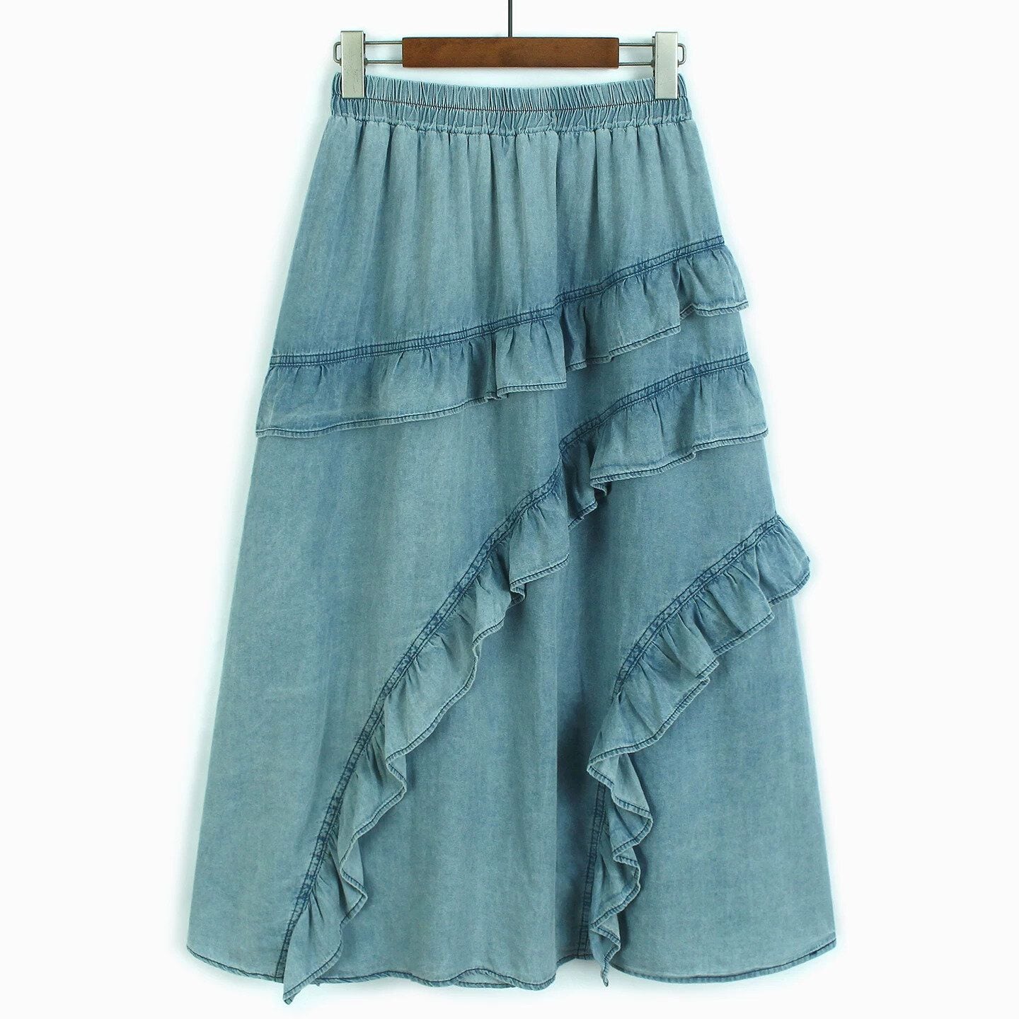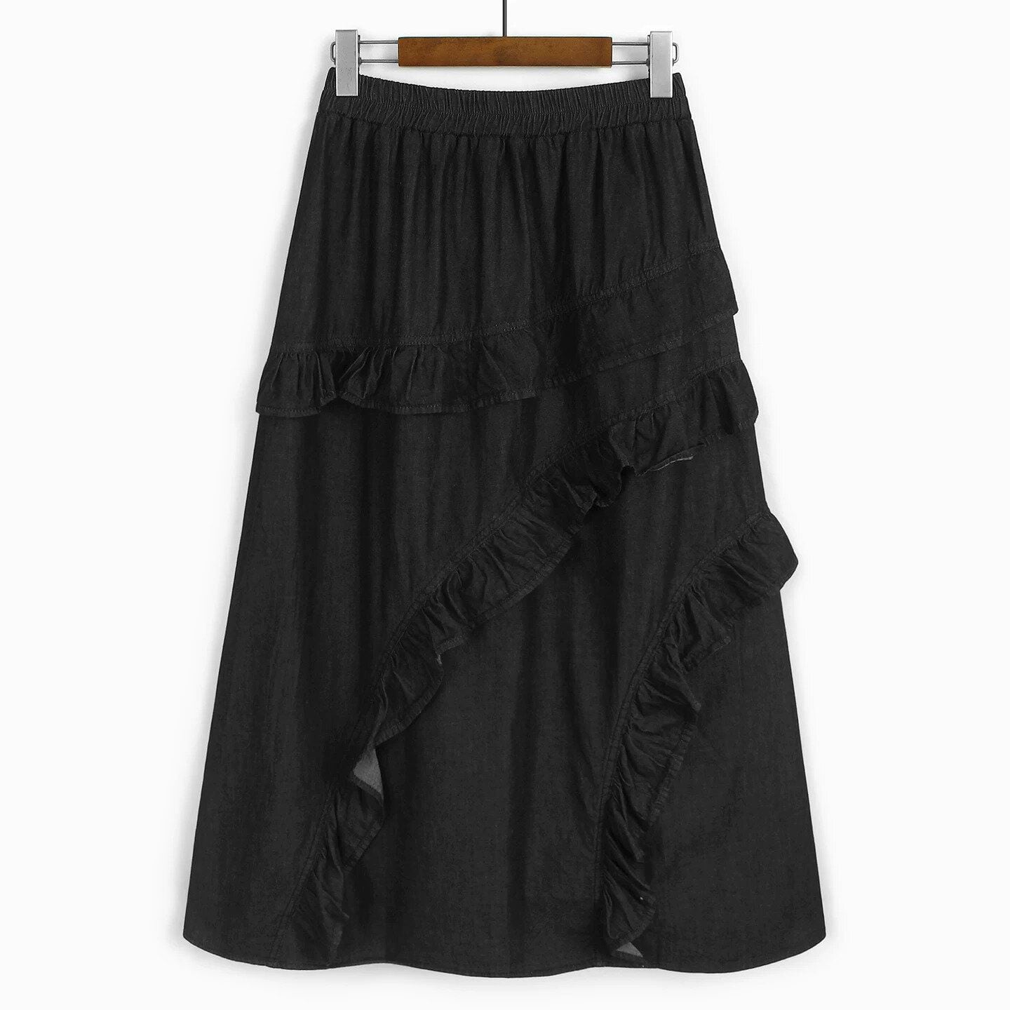 ELASTIC WAIST FRILL LINED A-LINE LONG DENIM SKIRT 3colors M-15997